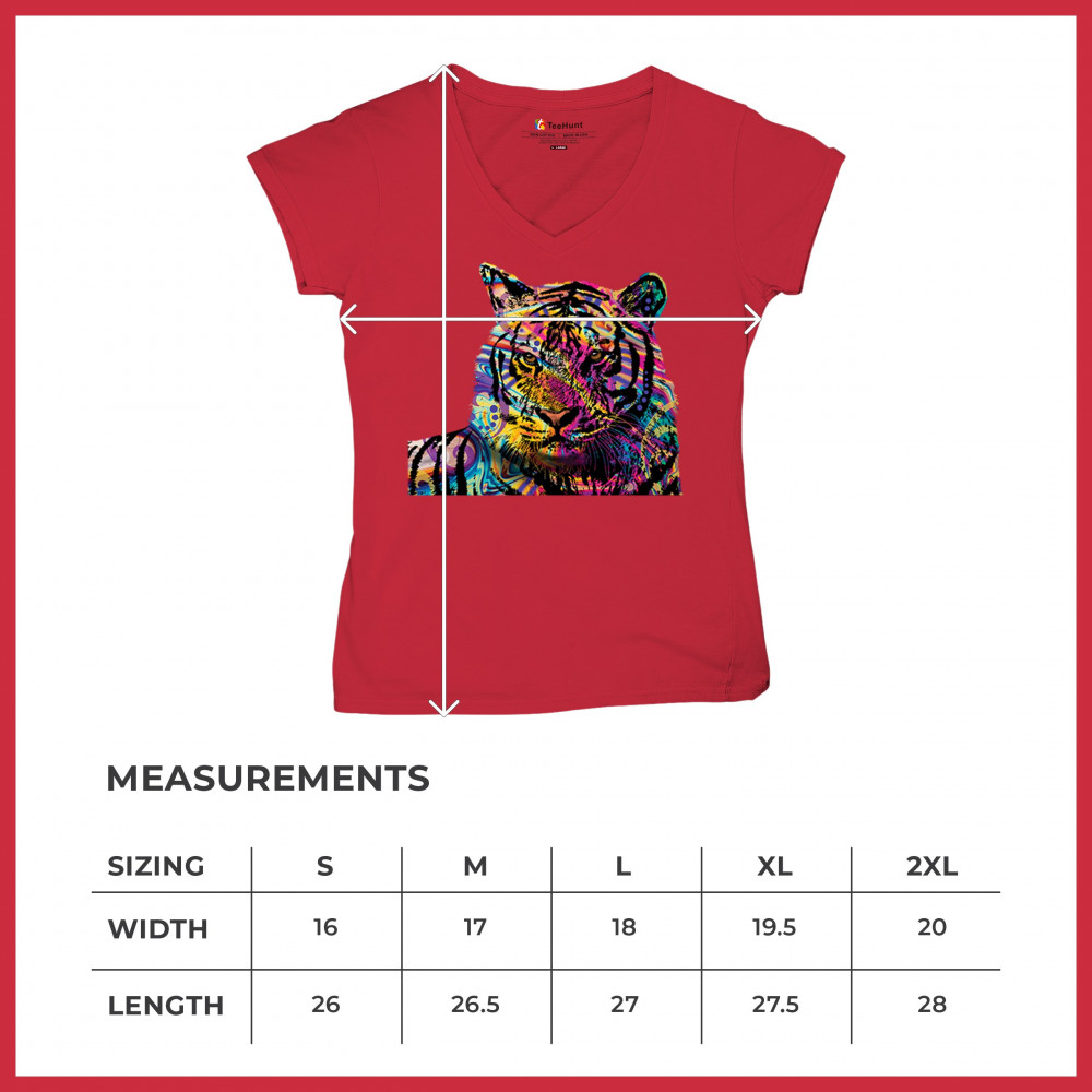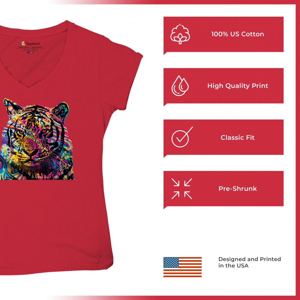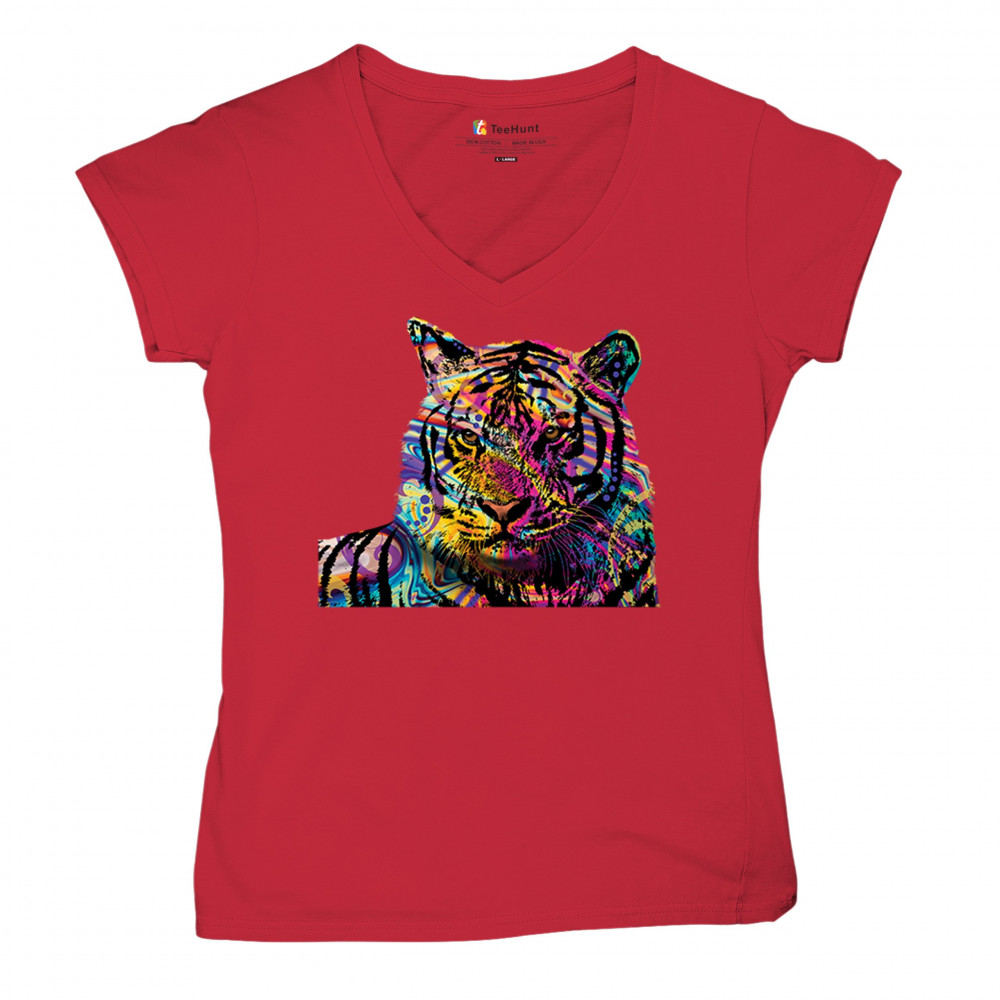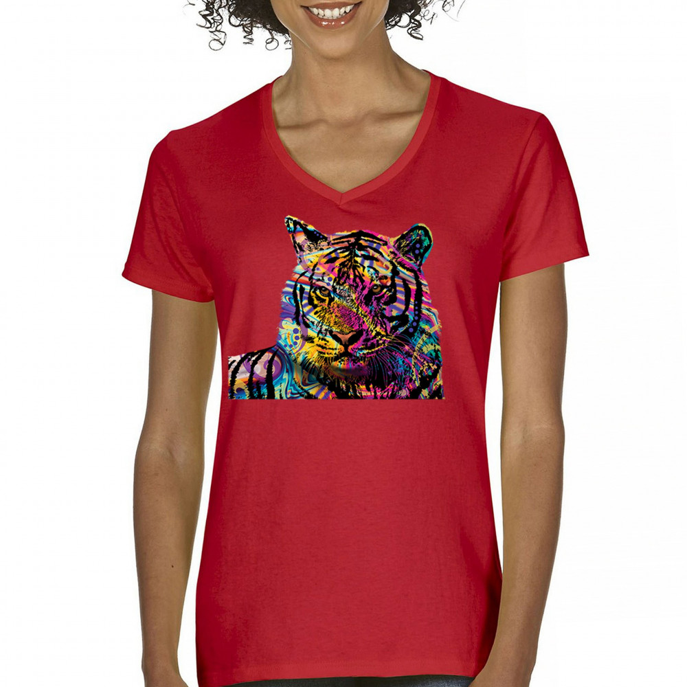DEAN RUSSO COLORFUL NEON SIBERIAN TIGER women's v-neck t-shirt wild big cat tee red