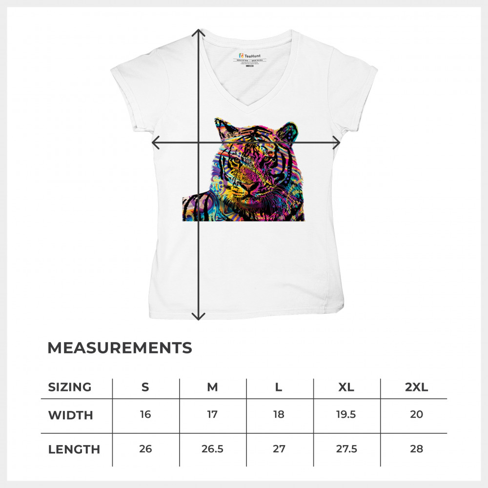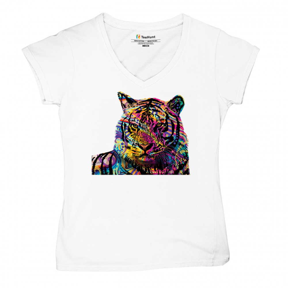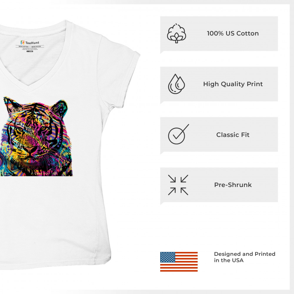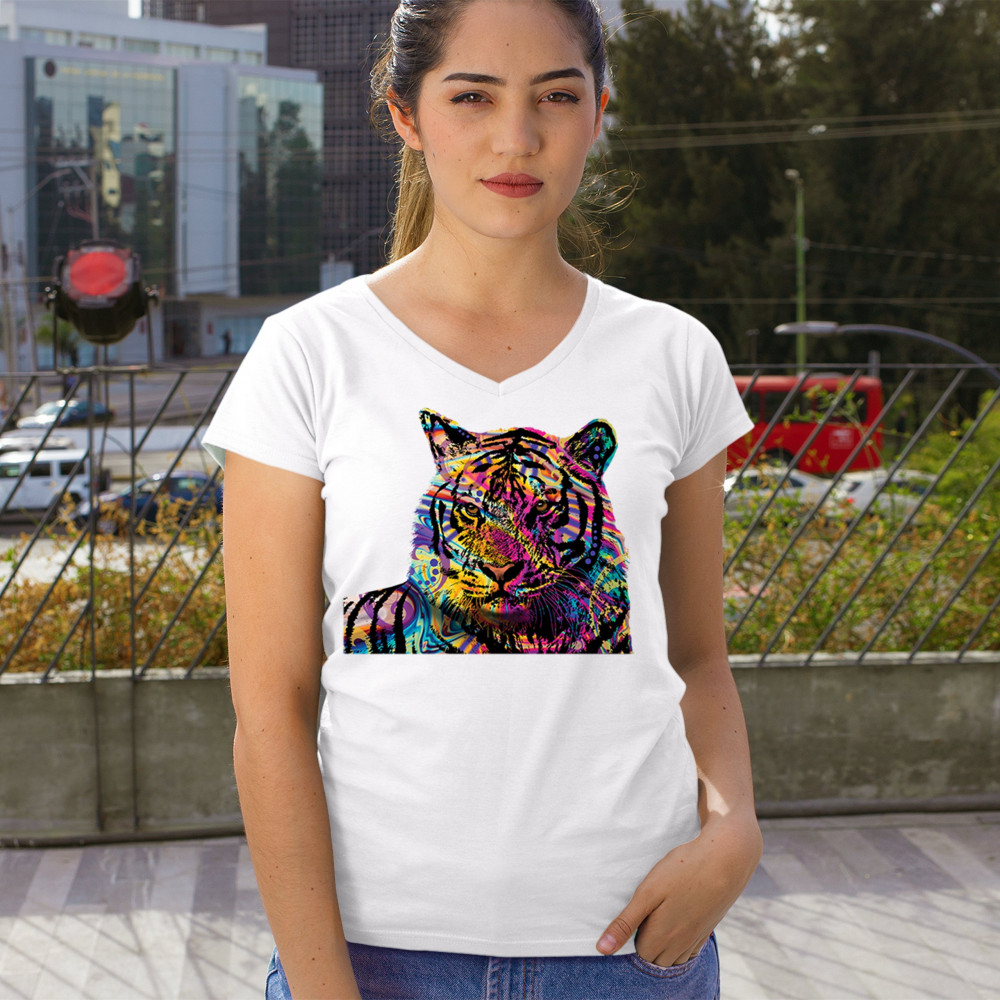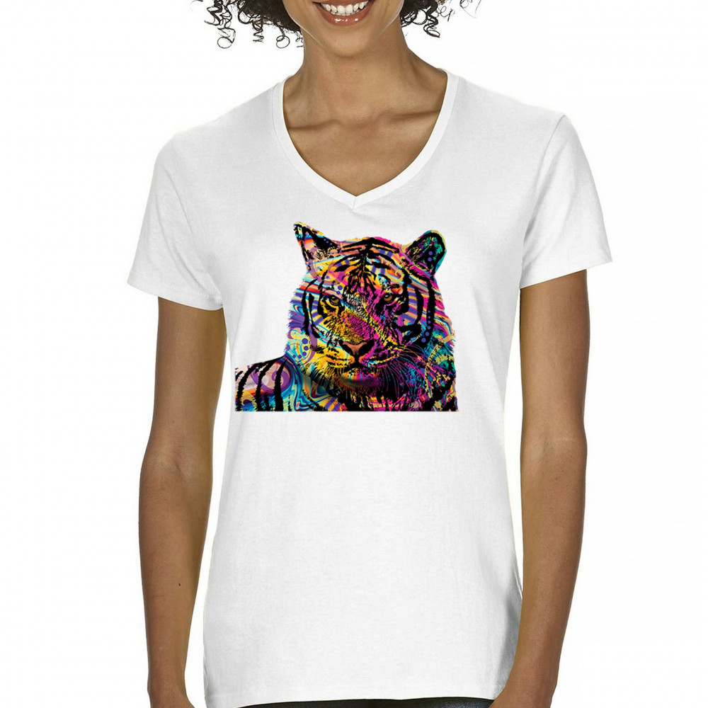 DEAN RUSSO COLORFUL NEON SIBERIAN TIGER women's v-neck t-shirt wild big cat tee white