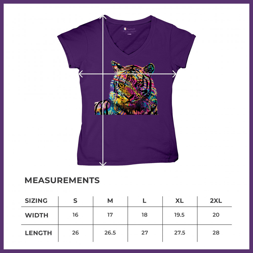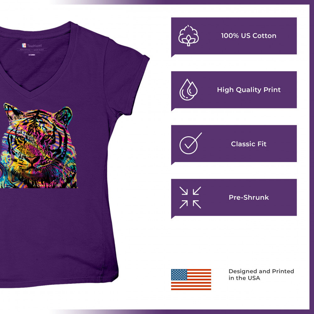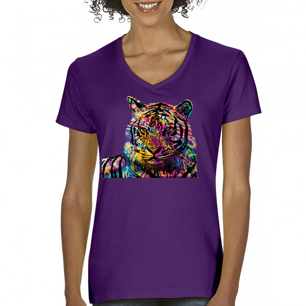 DEAN RUSSO COLORFUL NEON SIBERIAN TIGER women's v-neck t-shirt wild big cat tee purple