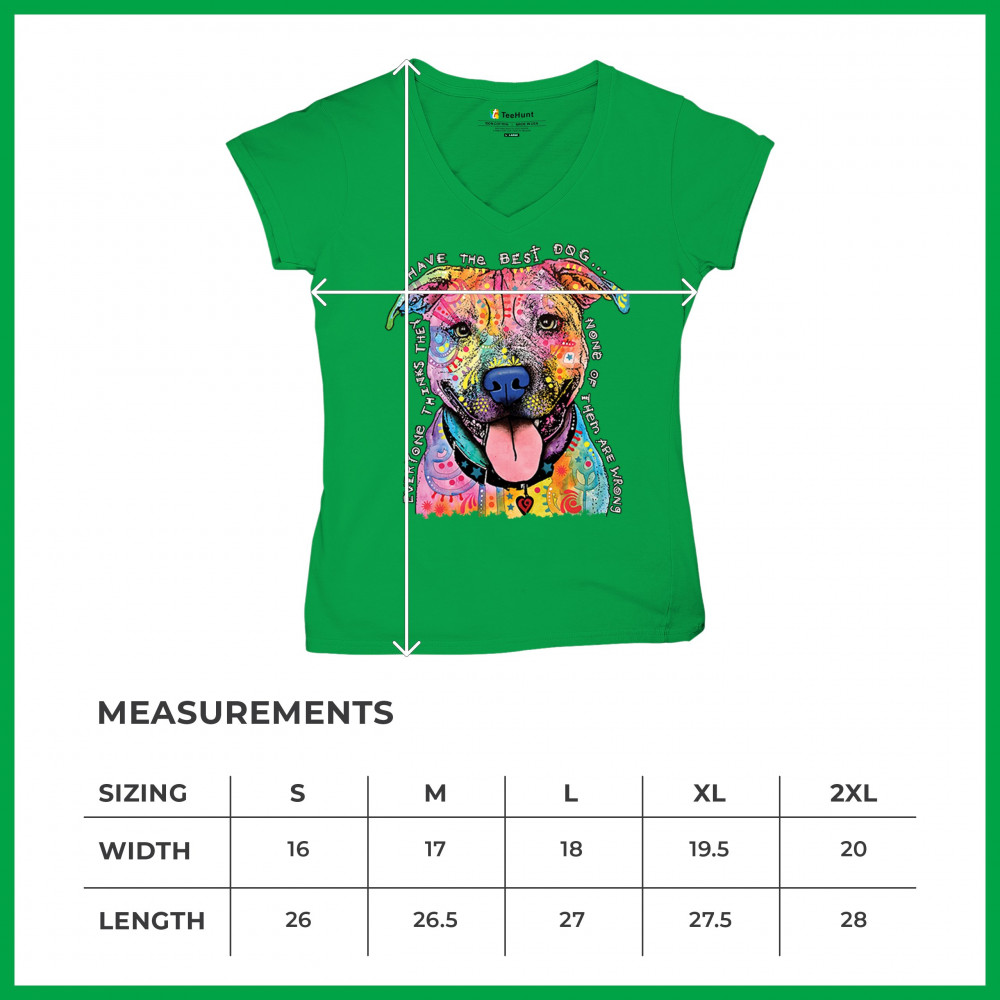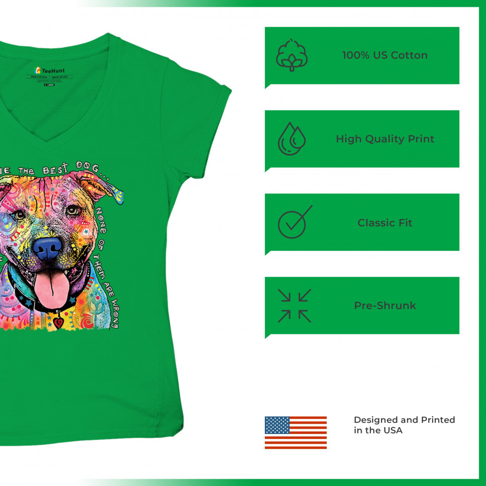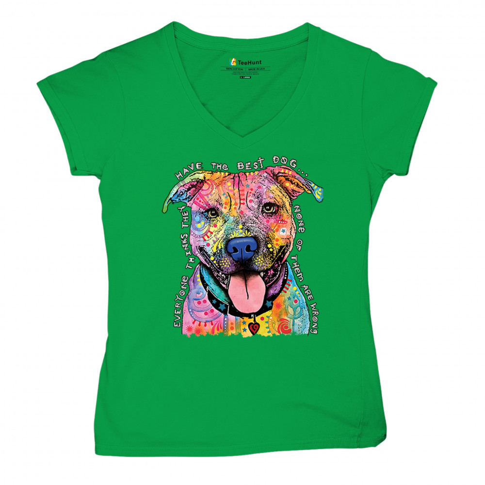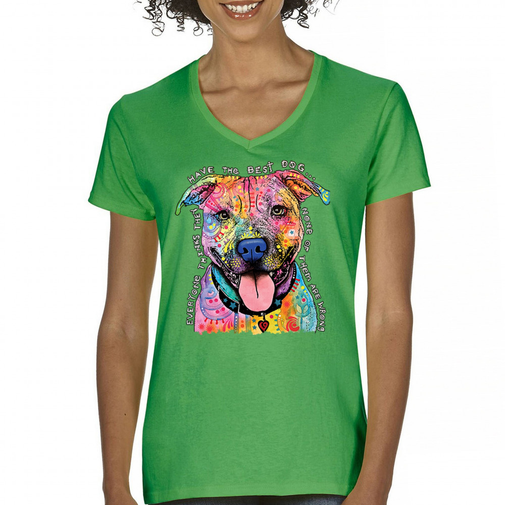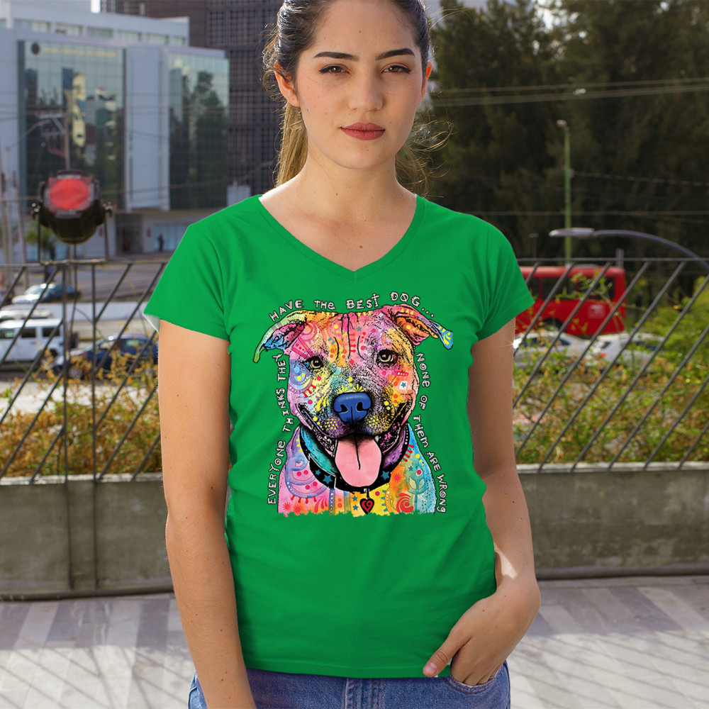 DEAN RUSSO COLORFUL PIT BULL women's v-neck t-shirt everyone has best dogs tee green