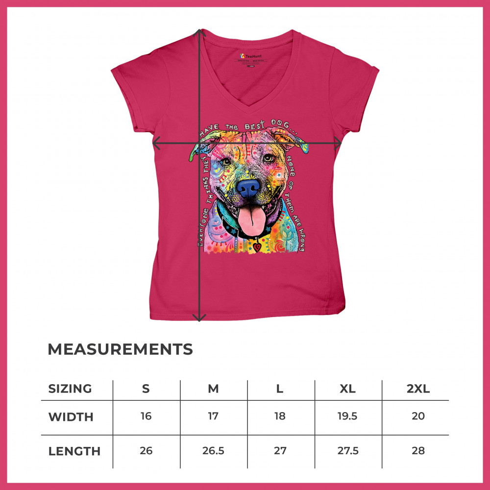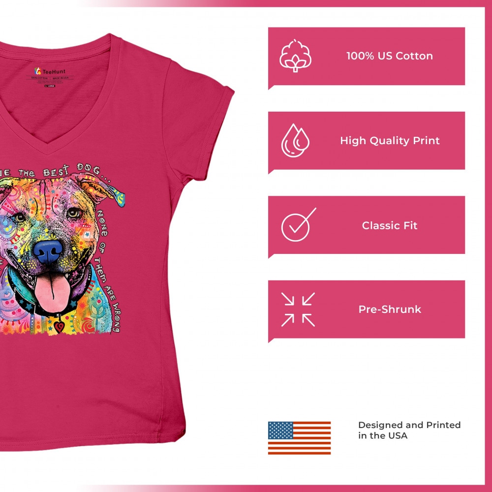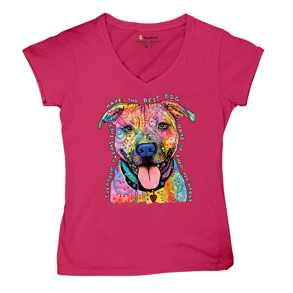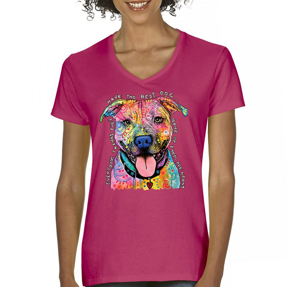 DEAN RUSSO COLORFUL PIT BULL women's v-neck t-shirt everyone has best dogs tee pink