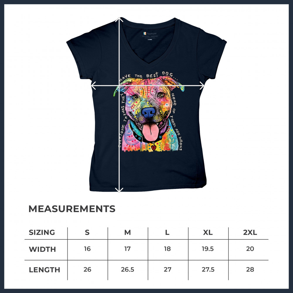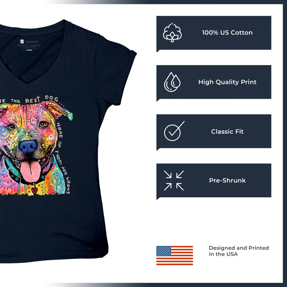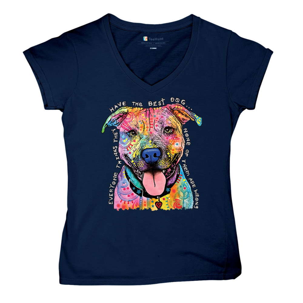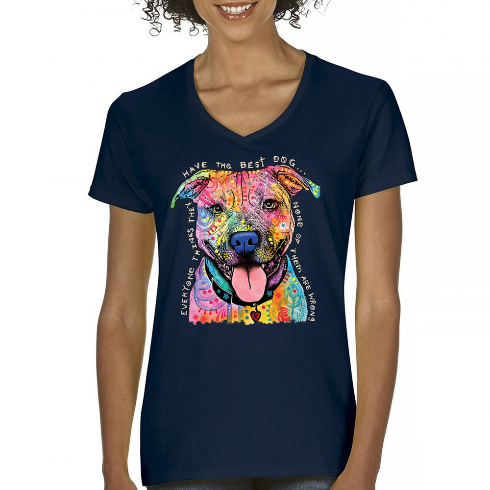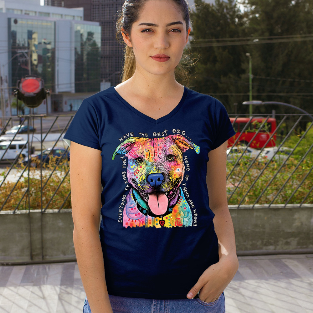 DEAN RUSSO COLORFUL PIT BULL women's v-neck t-shirt everyone has best dogs tee navy blue