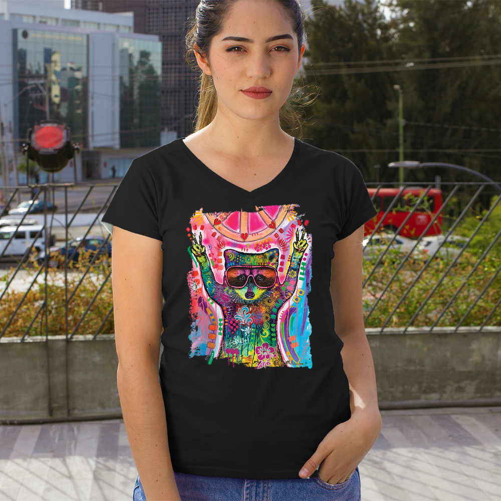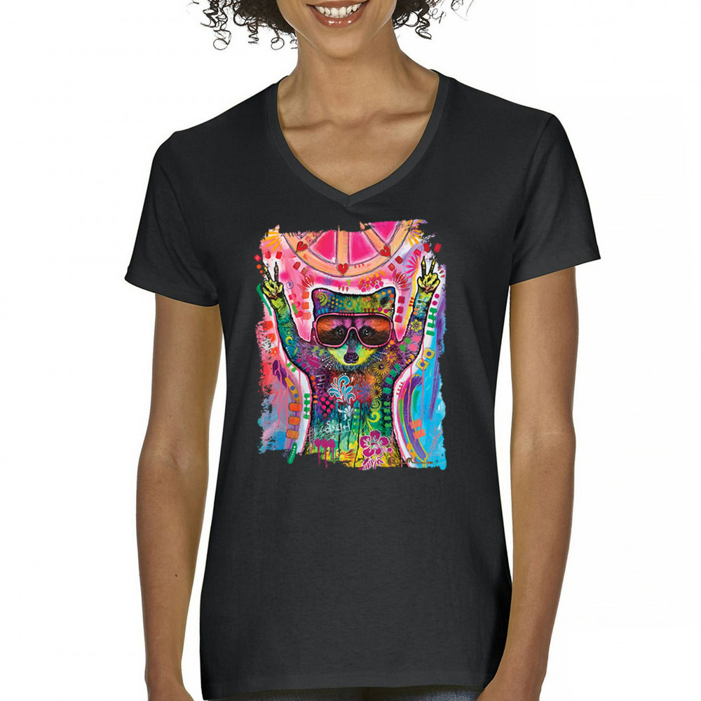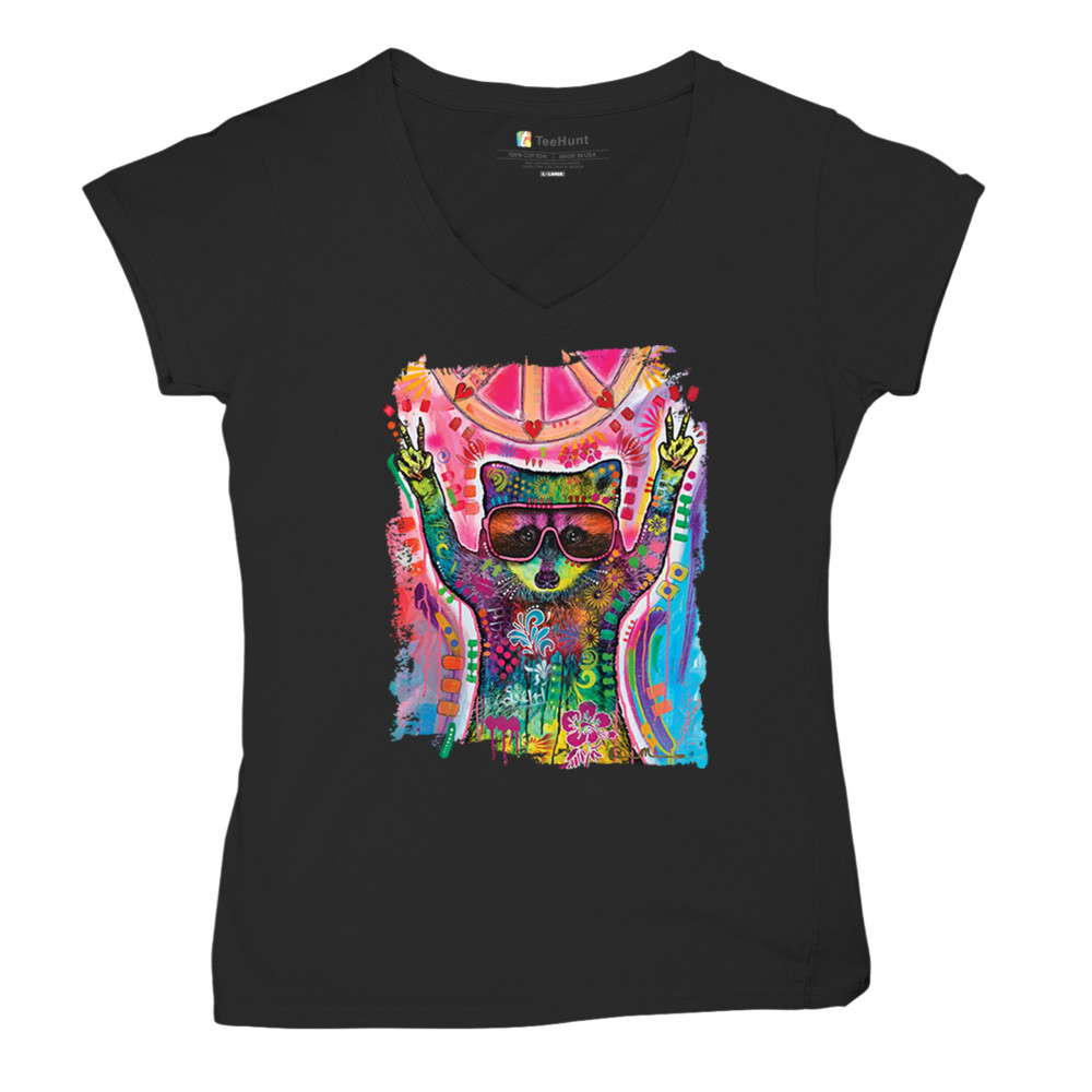 DEAN RUSSO COSMIC TRASH PANDA women's v-neck t-shirt funny weird hippie tee black