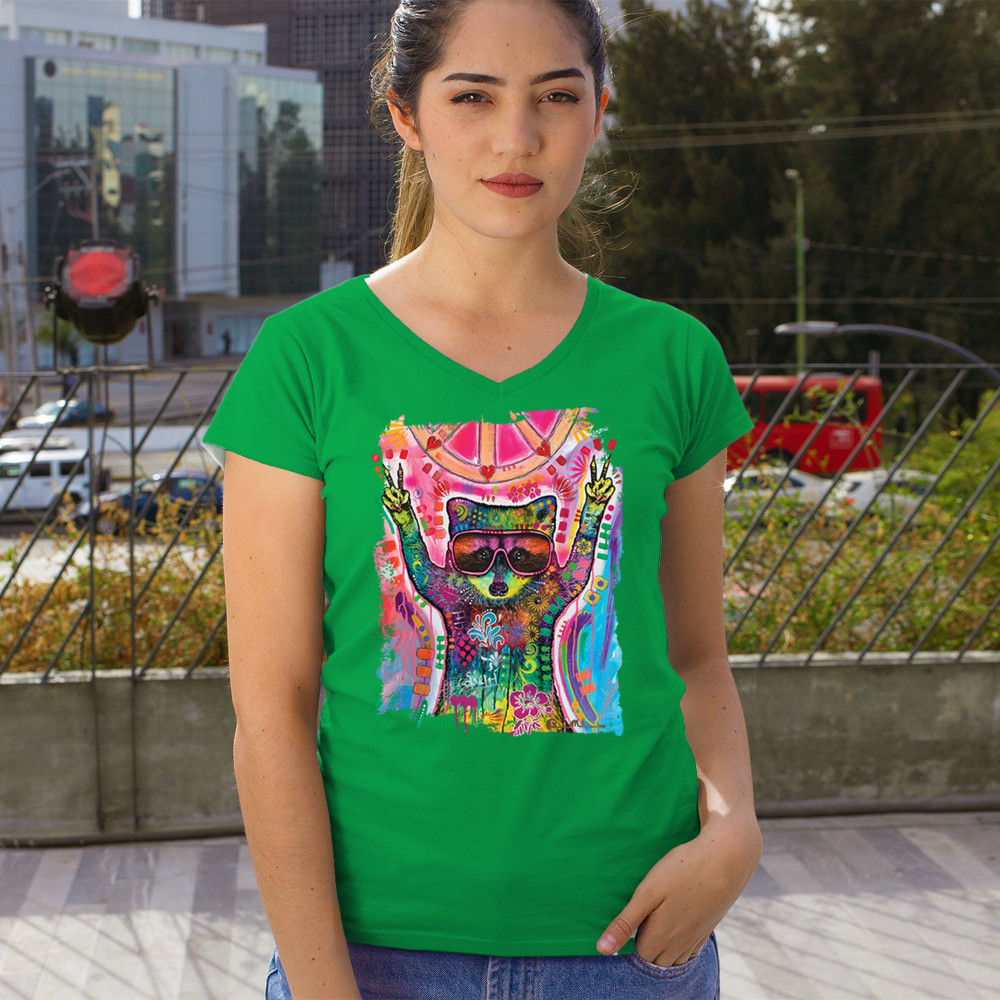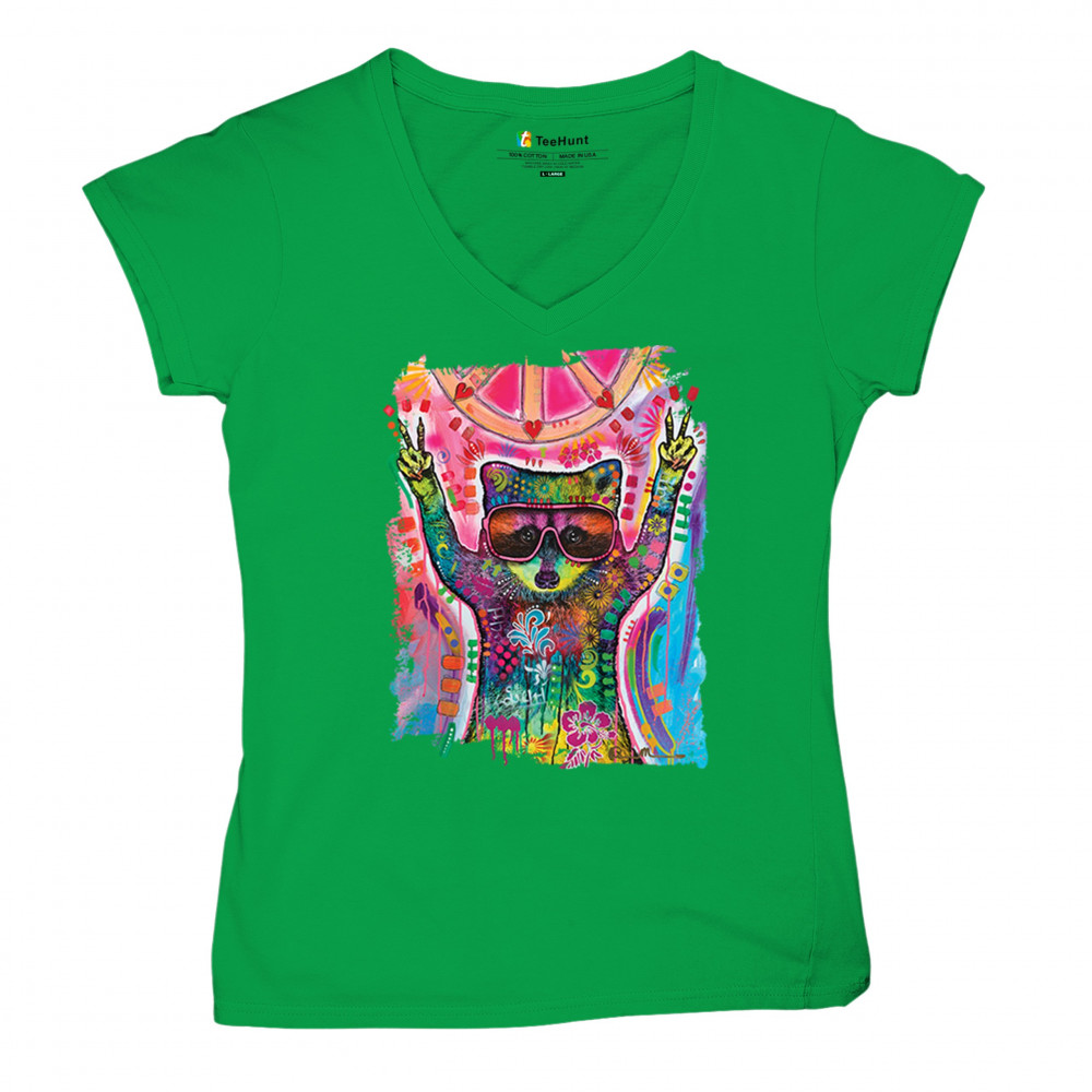 DEAN RUSSO COSMIC TRASH PANDA women's v-neck t-shirt funny weird hippie tee green