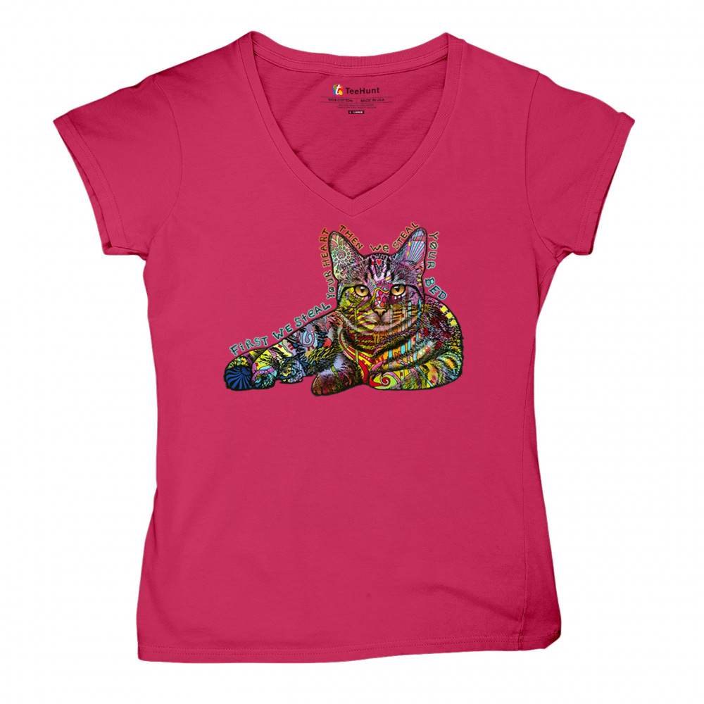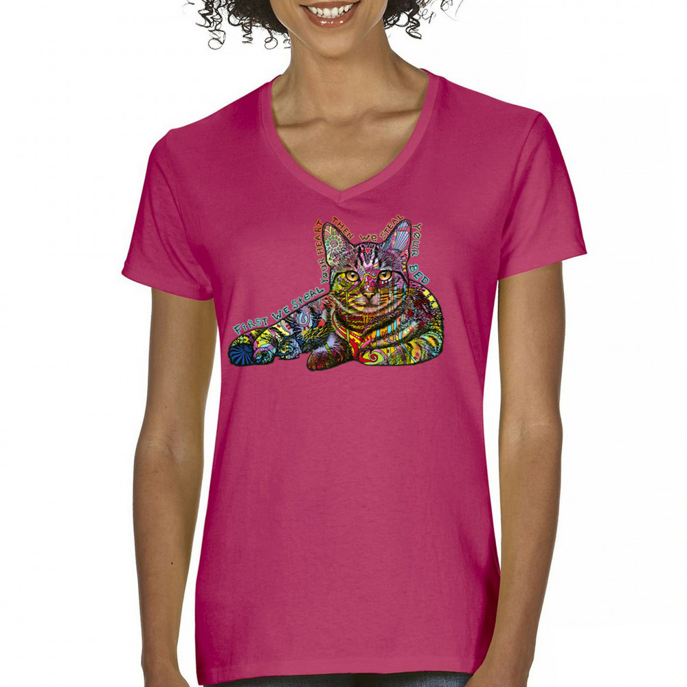 DEAN RUSSO CUTE NEON CAT dean russo cute cat women's v-neck t-shirt first we steal your heart pet tee pink
