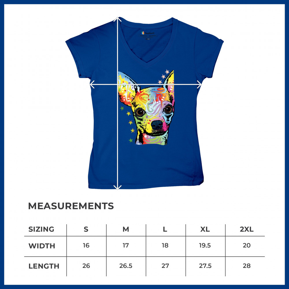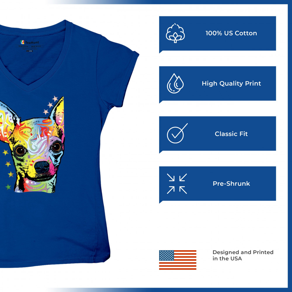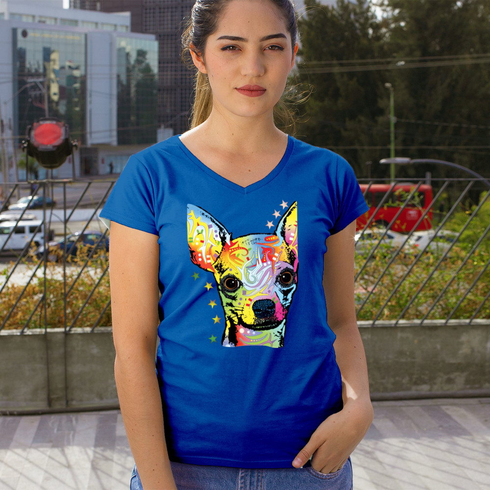 DEAN RUSSO CUTE CHIHUAHUA women's v-neck t-shirt neon colorful small dog pet tee royal blue