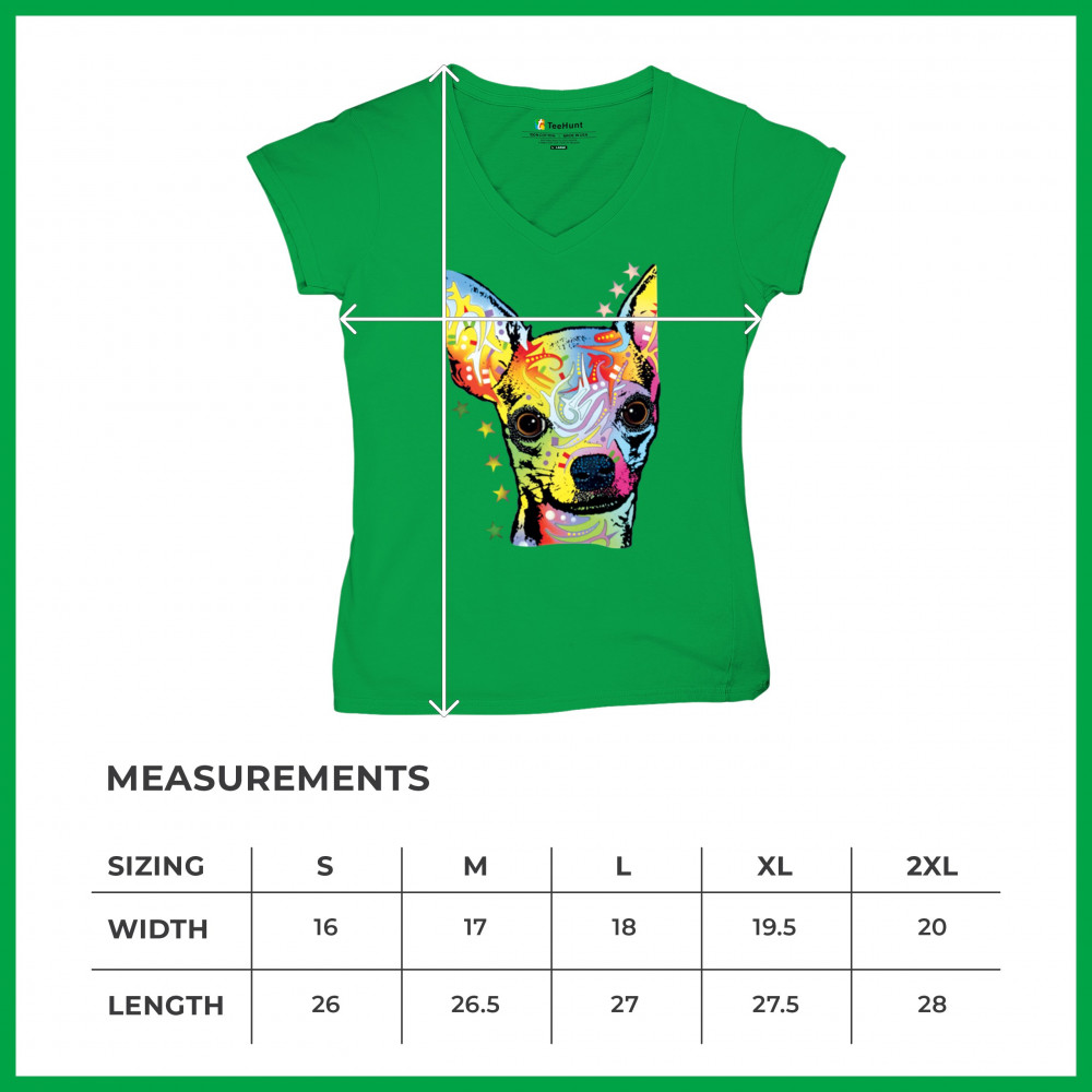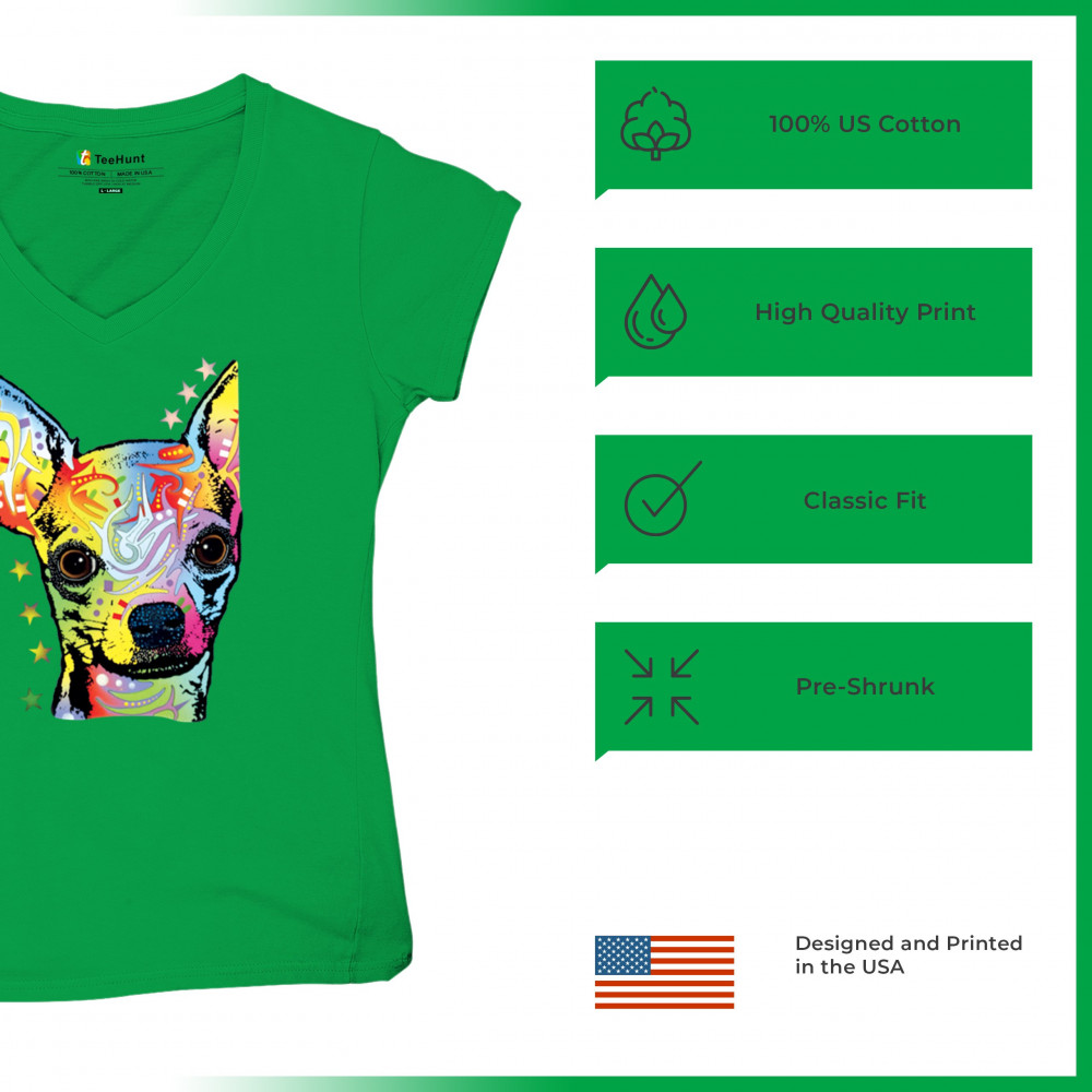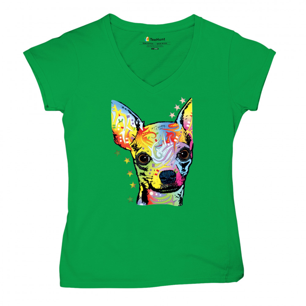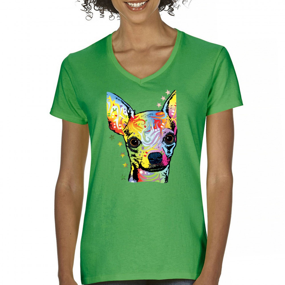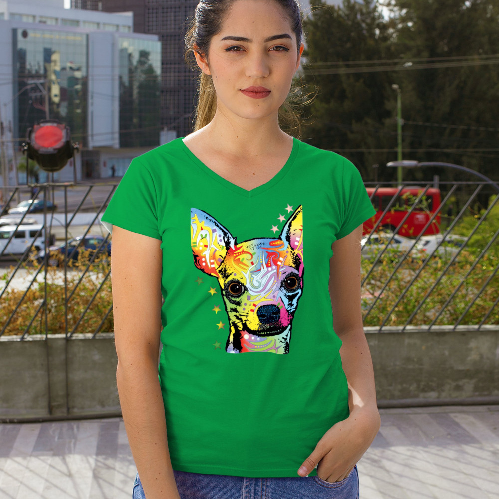 DEAN RUSSO CUTE CHIHUAHUA women's v-neck t-shirt neon colorful small dog pet tee green