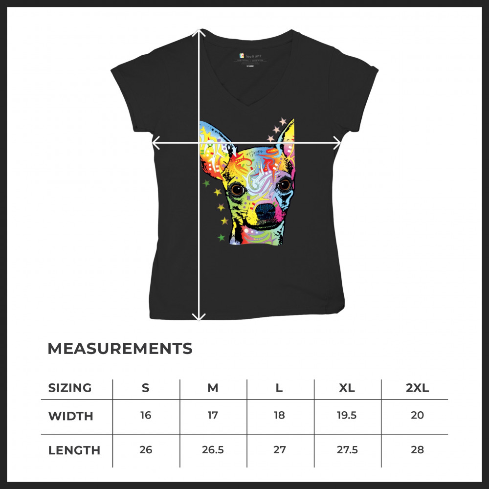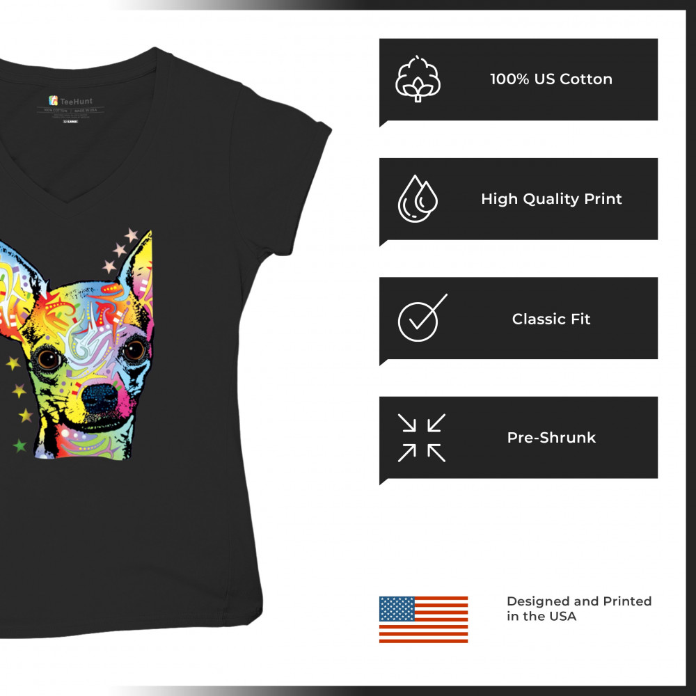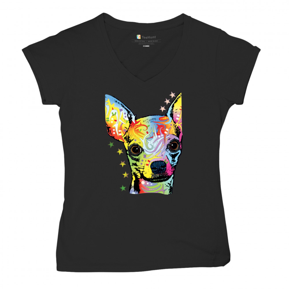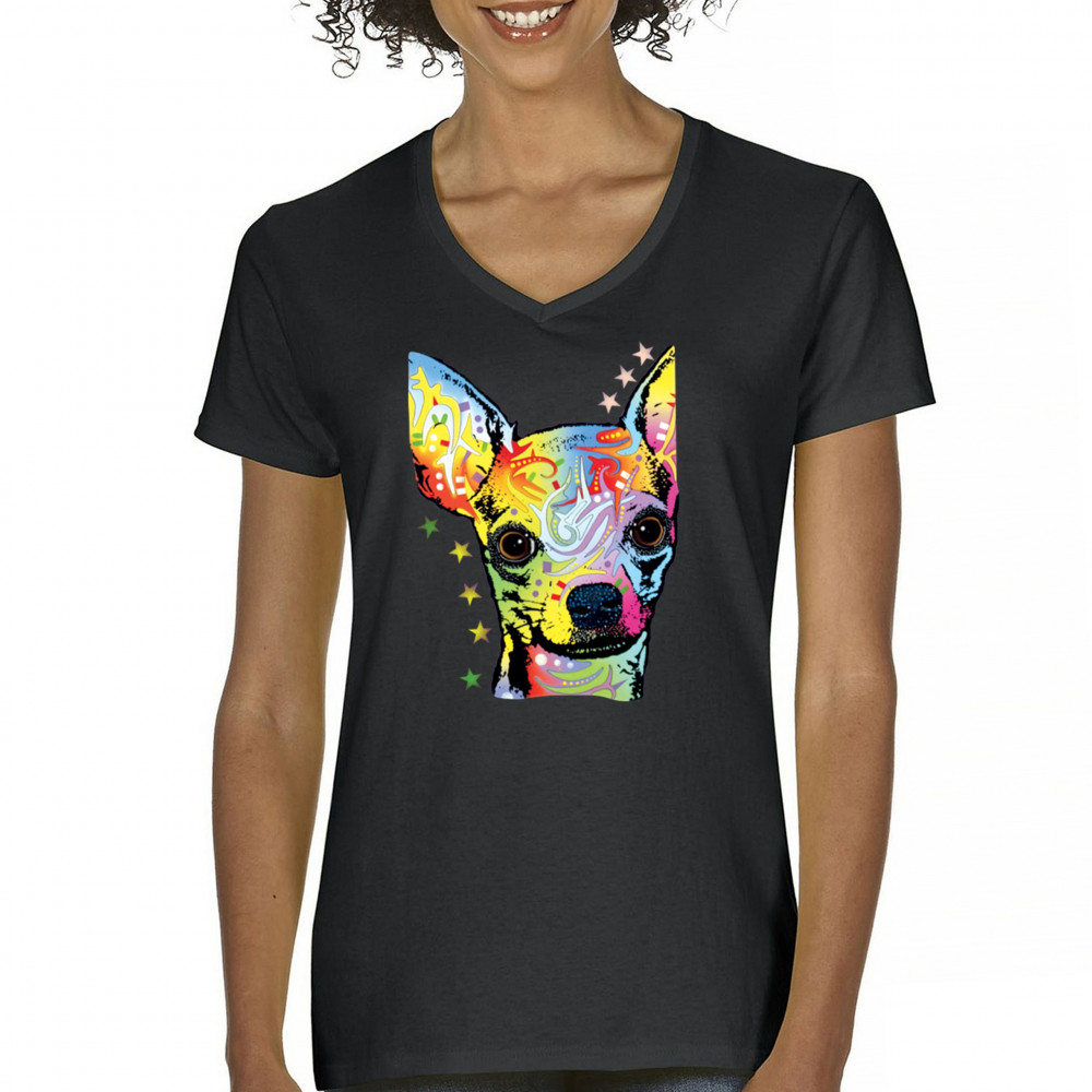 DEAN RUSSO CUTE CHIHUAHUA women's v-neck t-shirt neon colorful small dog pet tee black