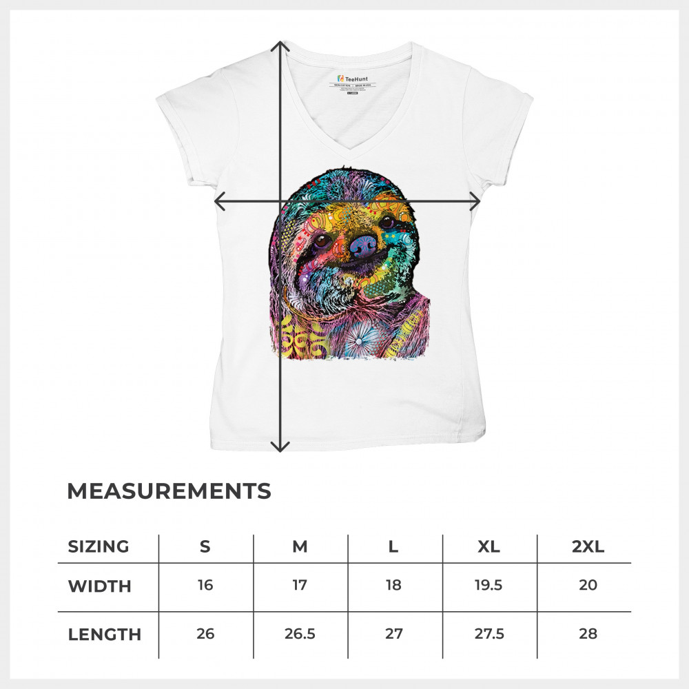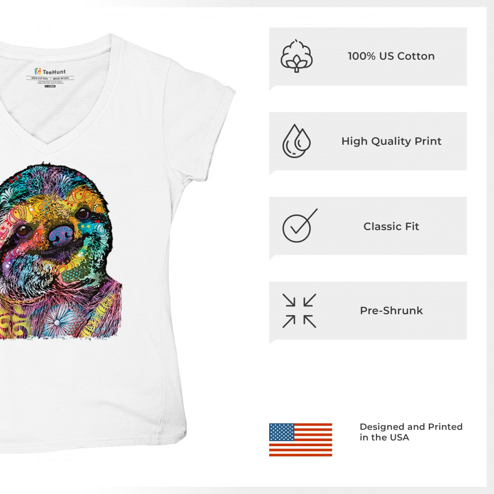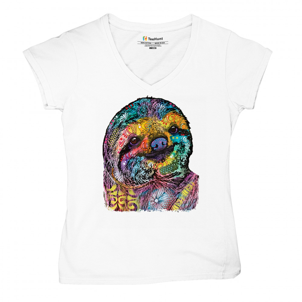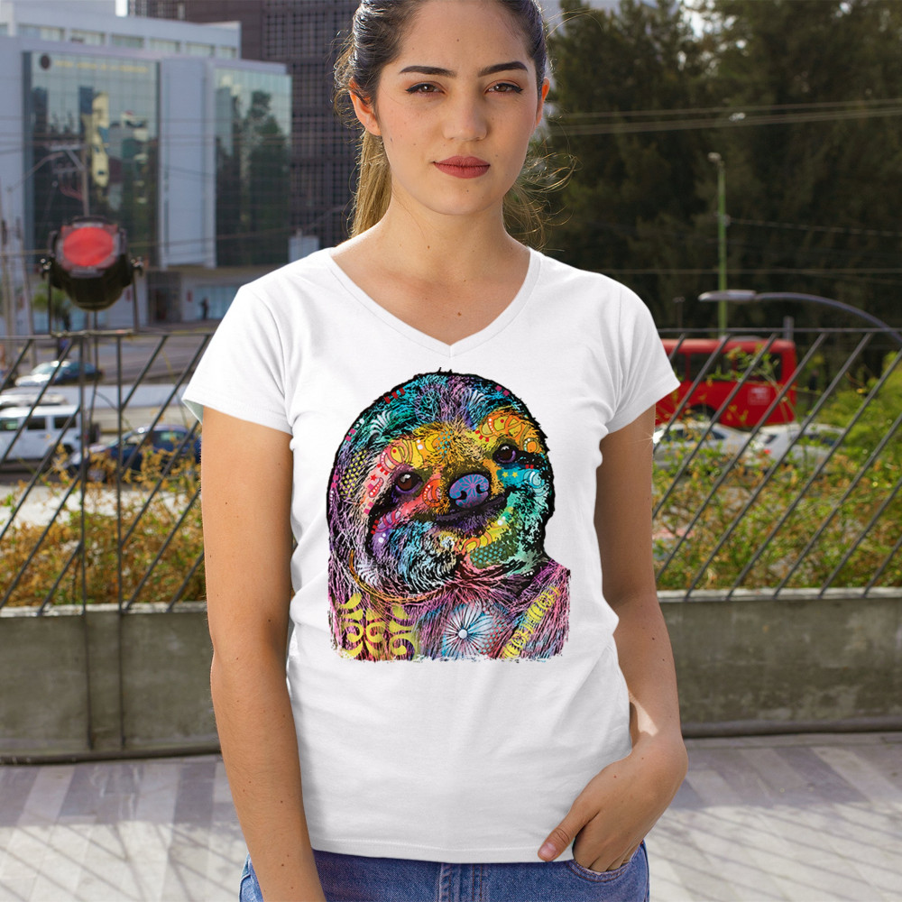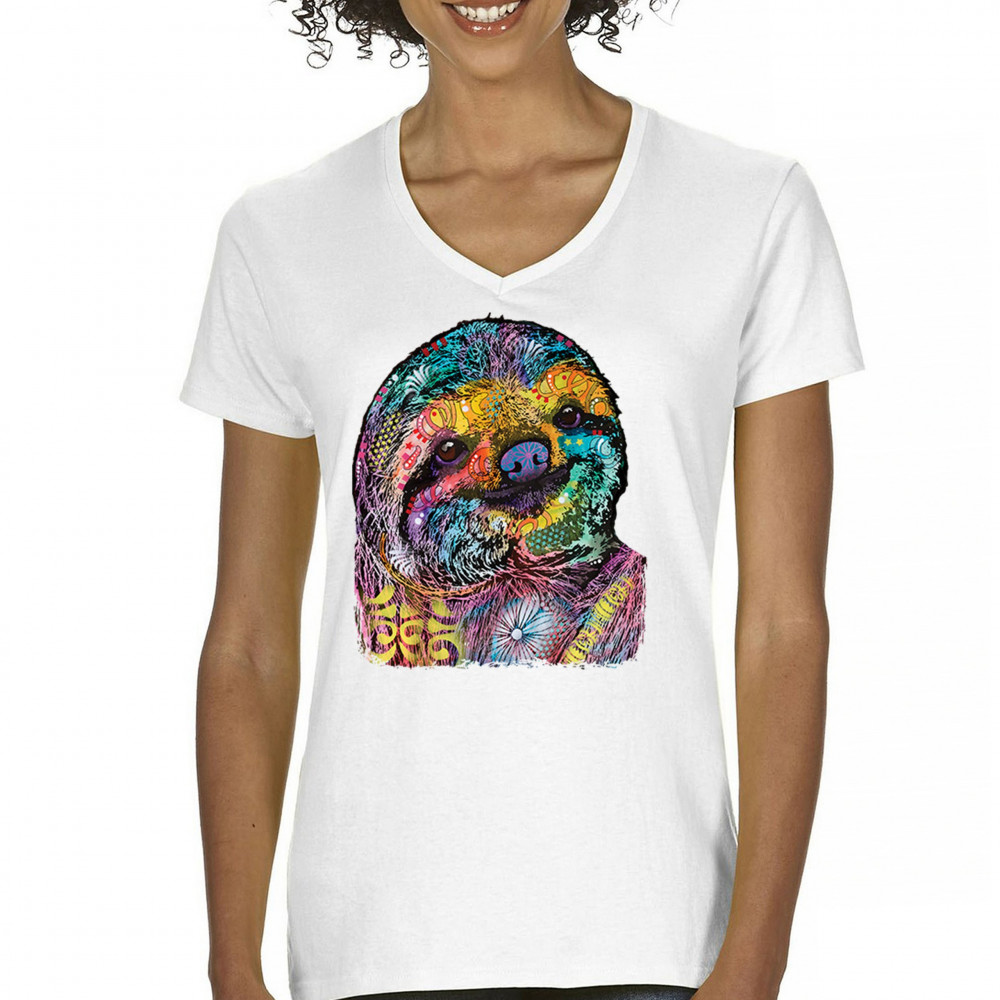 DEAN RUSSO CUTE LAZY SLOTH women's v-neck t-shirt funny wild life colorful tee white