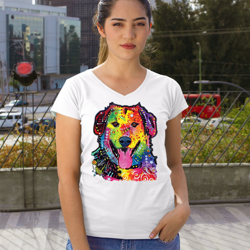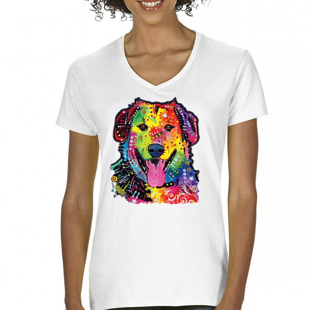 DEAN RUSSO CUTE NEON DOG women's v-neck t-shirt adopt a pet colorful pet tee white