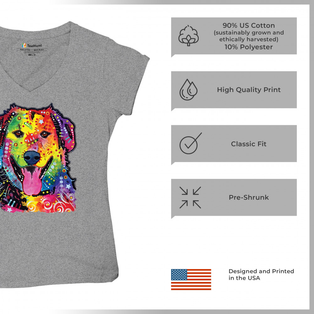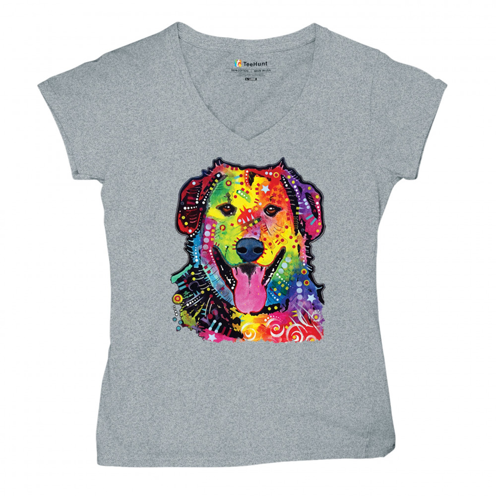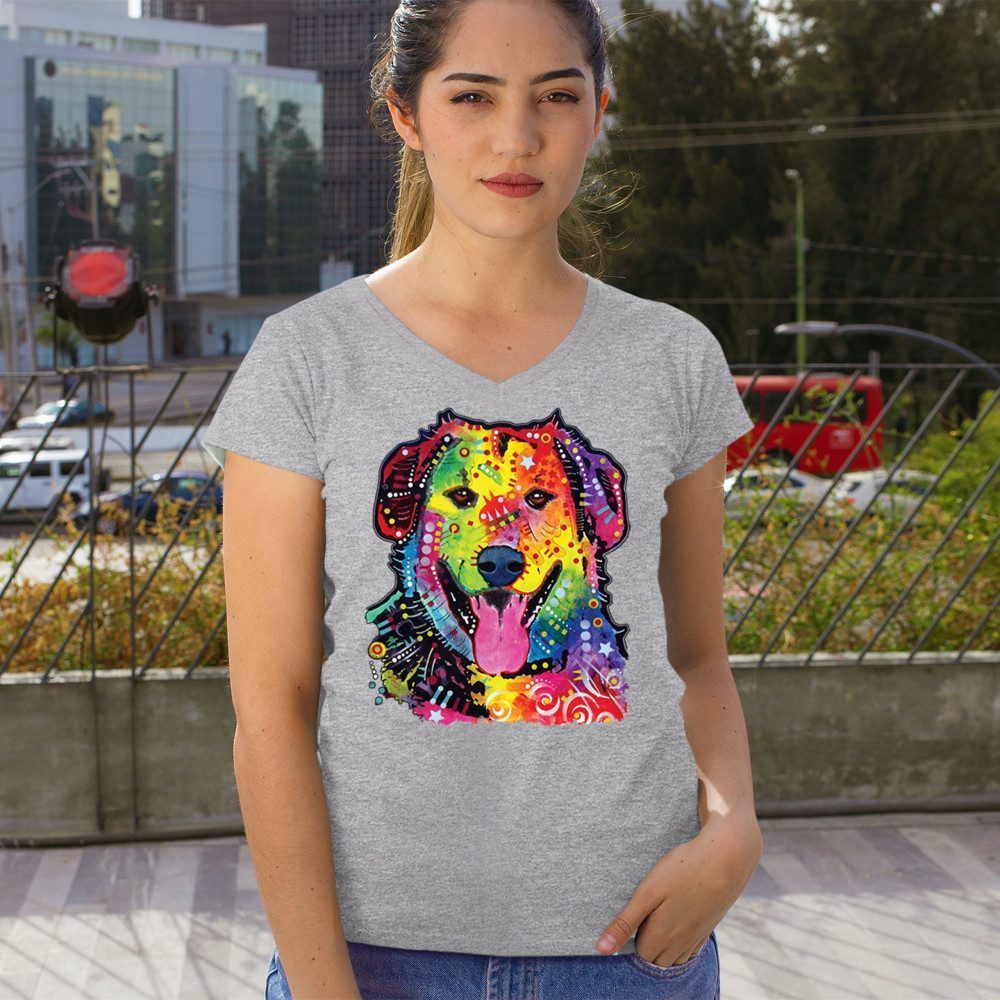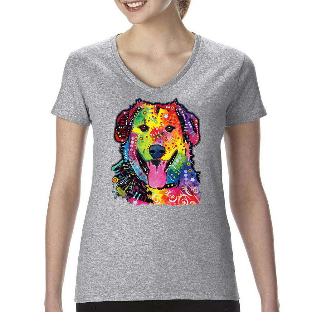 DEAN RUSSO CUTE NEON DOG women's v-neck t-shirt adopt a pet colorful pet tee gray