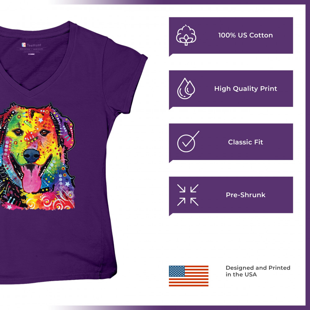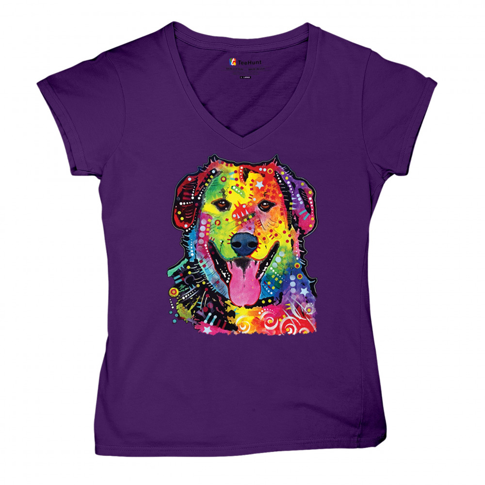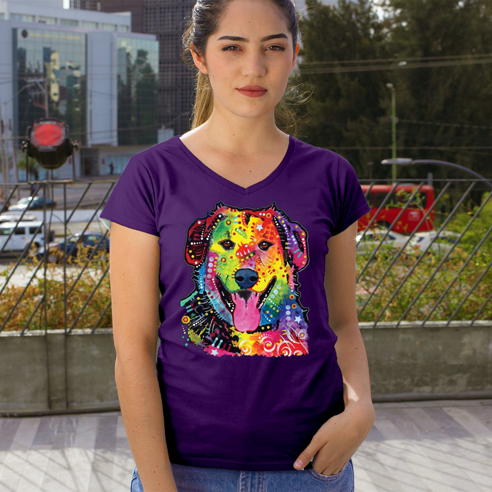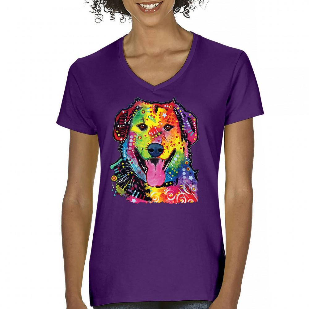 DEAN RUSSO CUTE NEON DOG women's v-neck t-shirt adopt a pet colorful pet tee purple