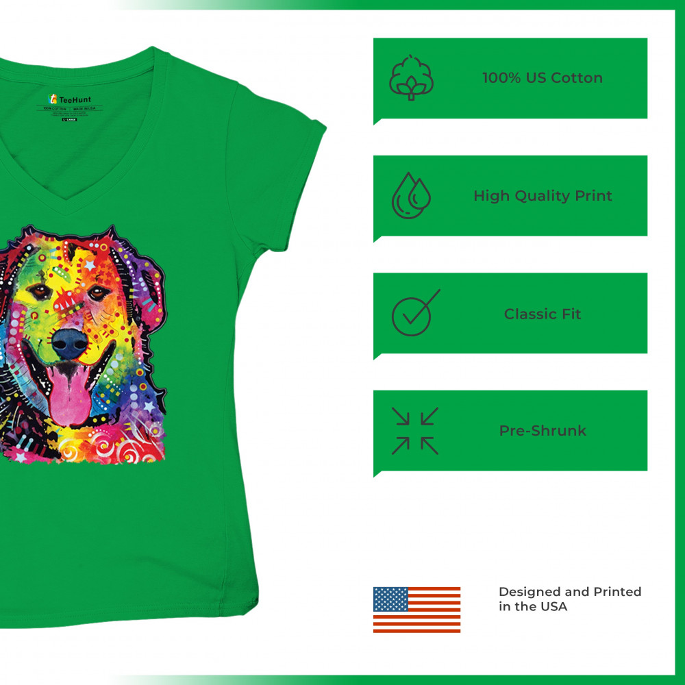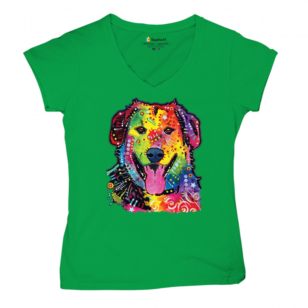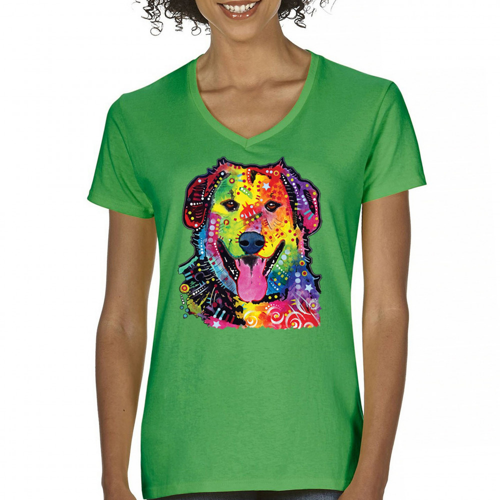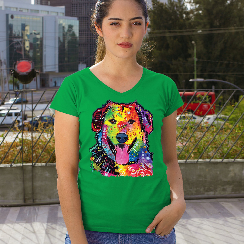 DEAN RUSSO CUTE NEON DOG women's v-neck t-shirt adopt a pet colorful pet tee green