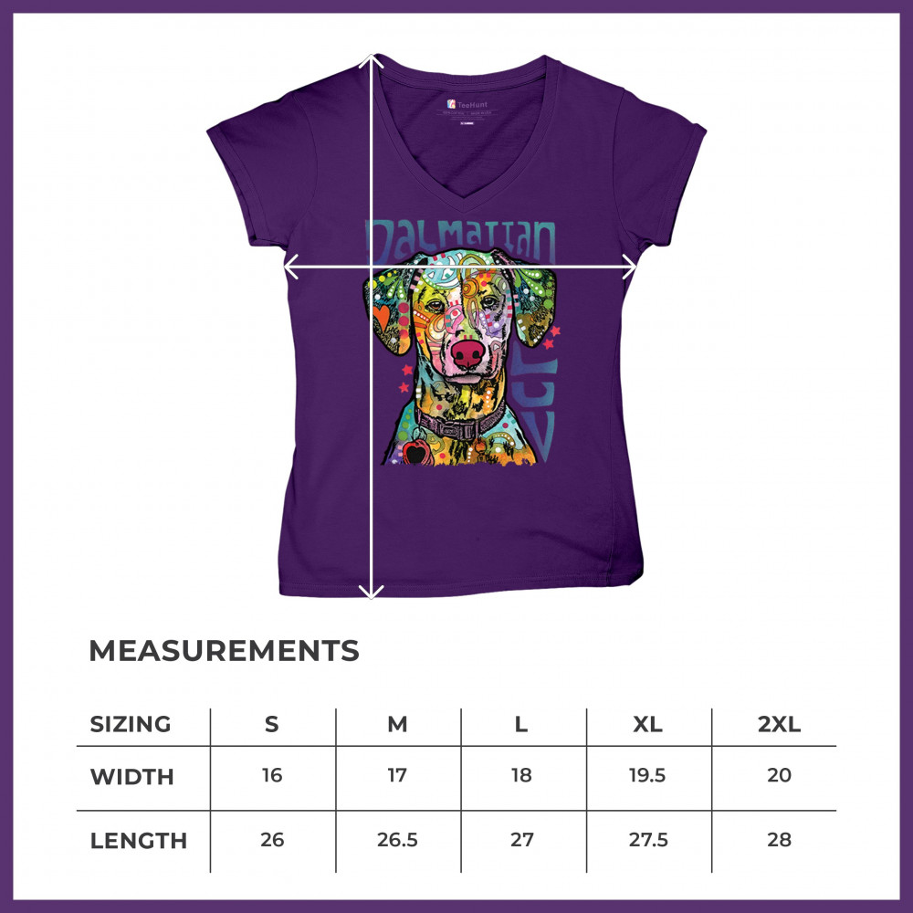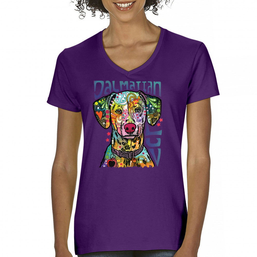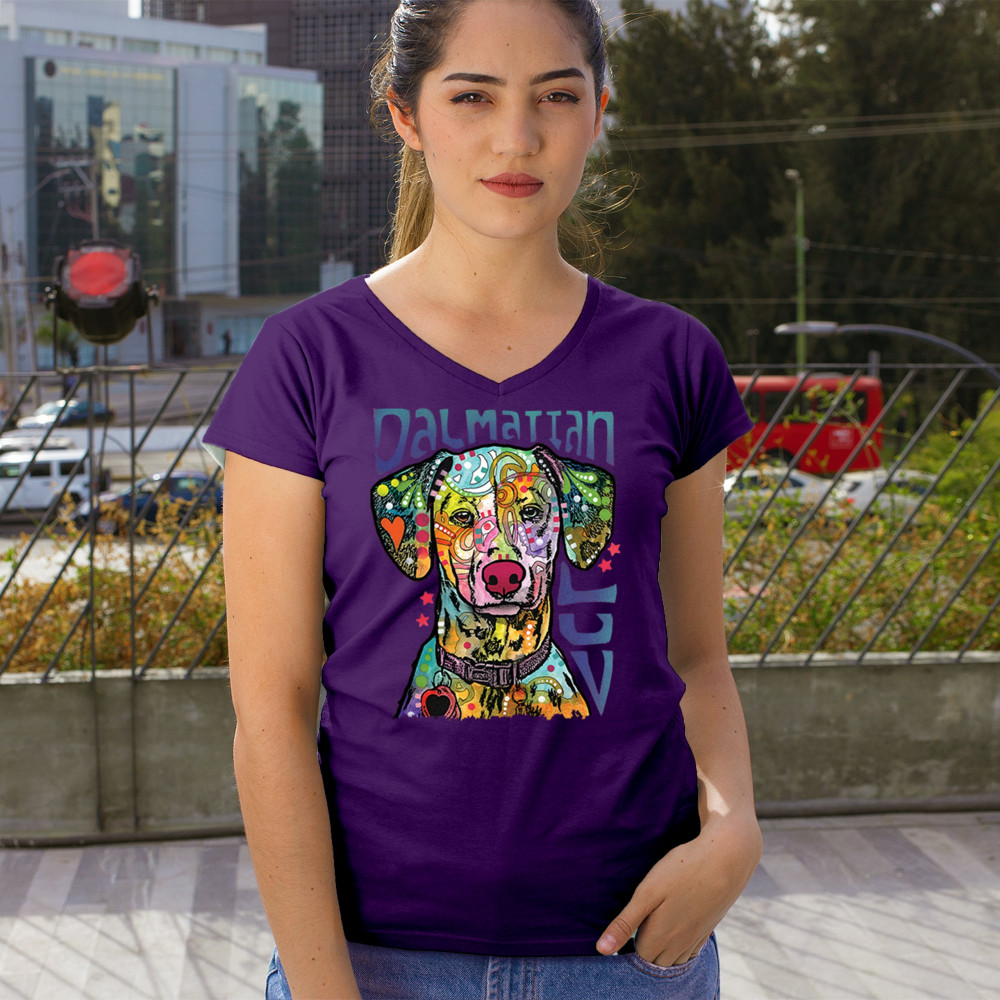 DEAN RUSSO DALMATIAN LUV COLORFUL DOG women's v-neck t-shirt neon puppy tee purple