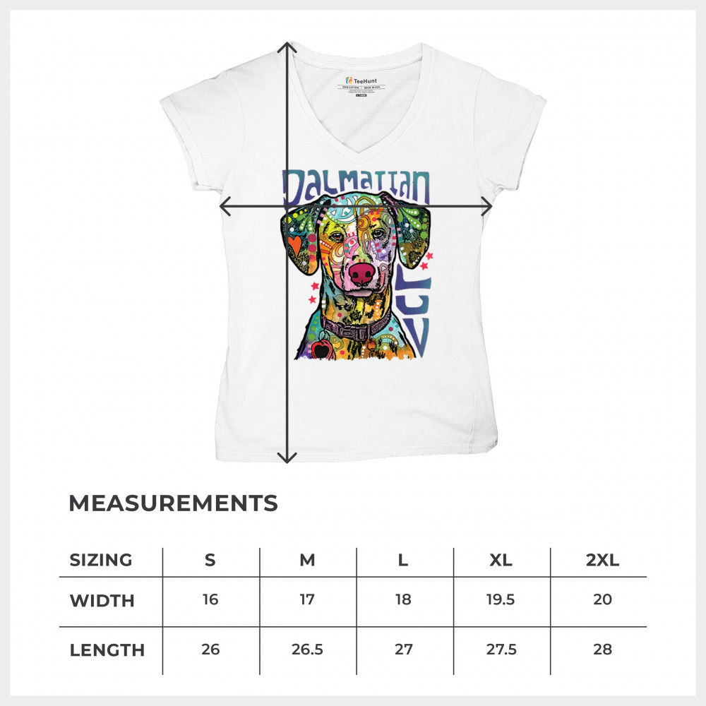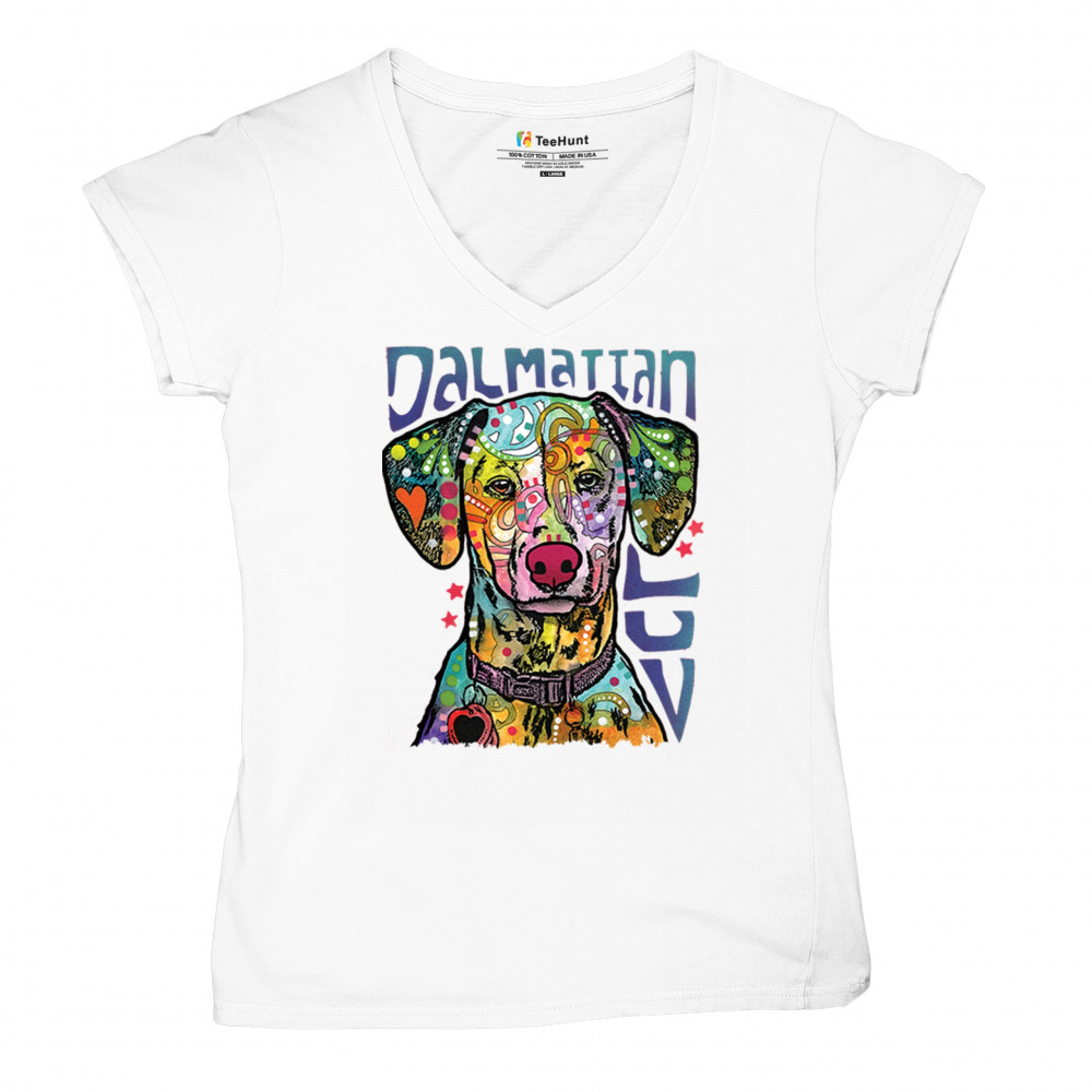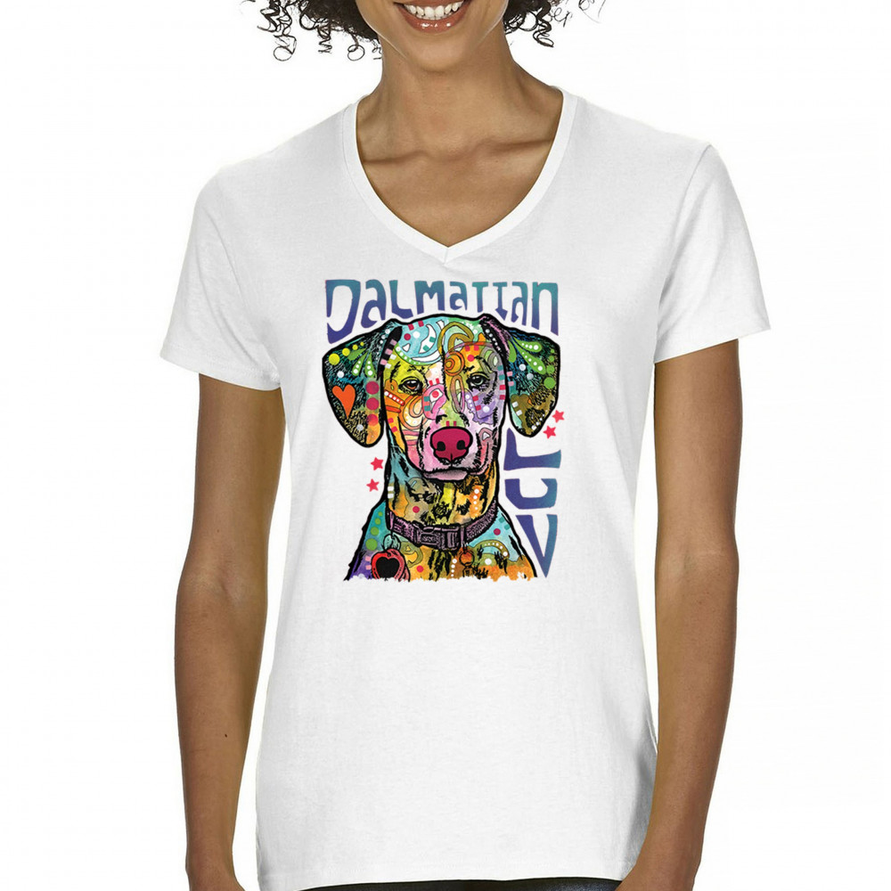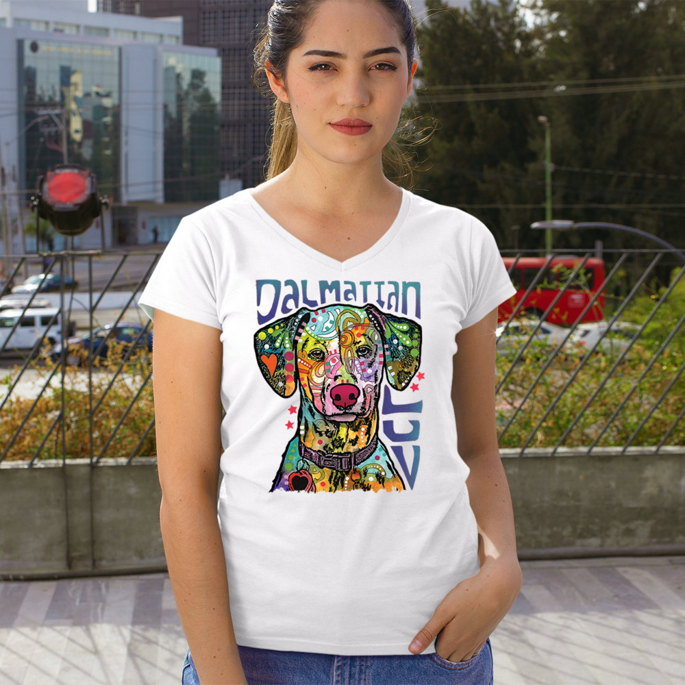 DEAN RUSSO DALMATIAN LUV COLORFUL DOG women's v-neck t-shirt neon puppy tee white