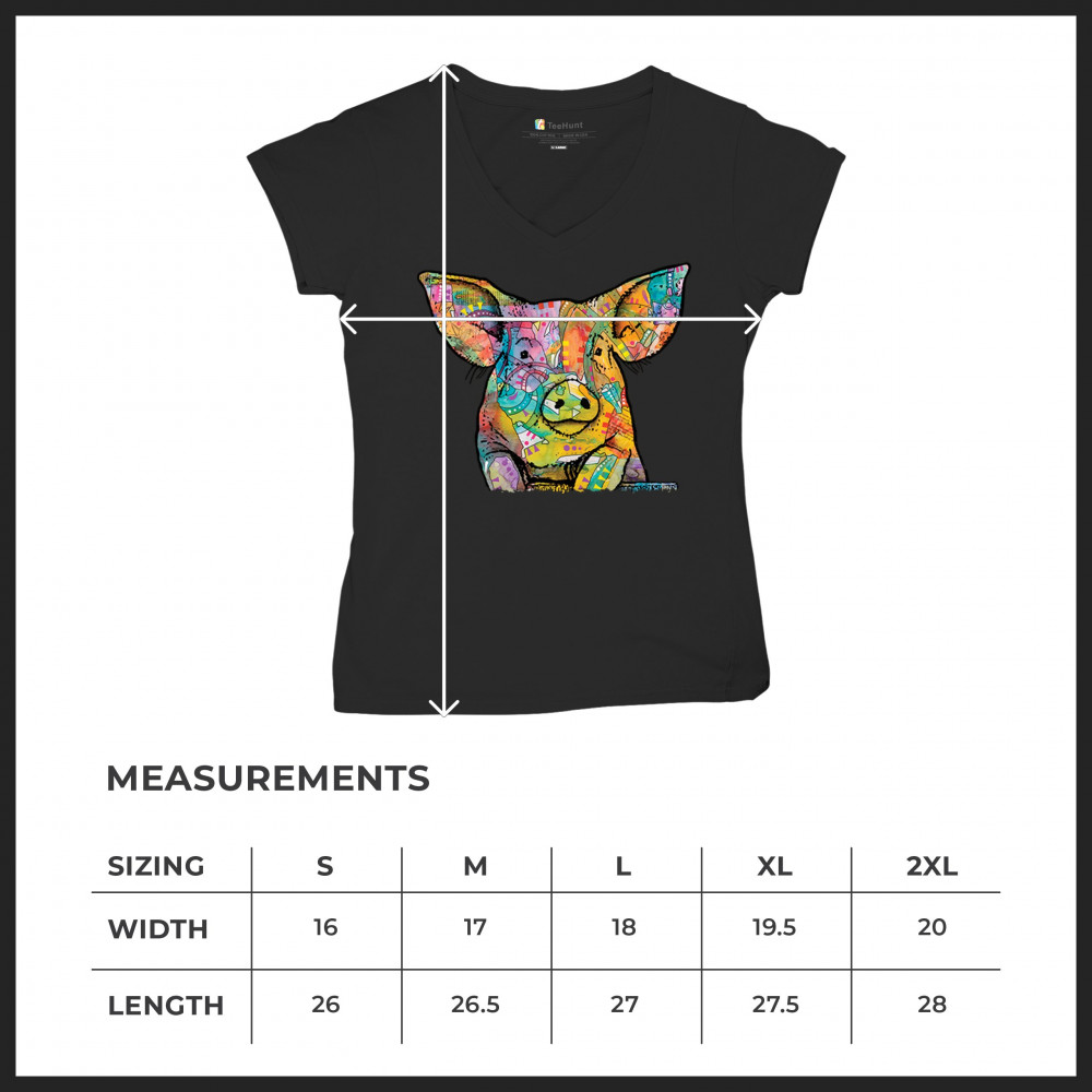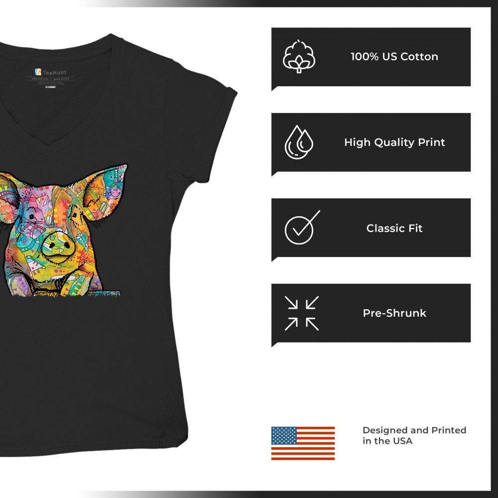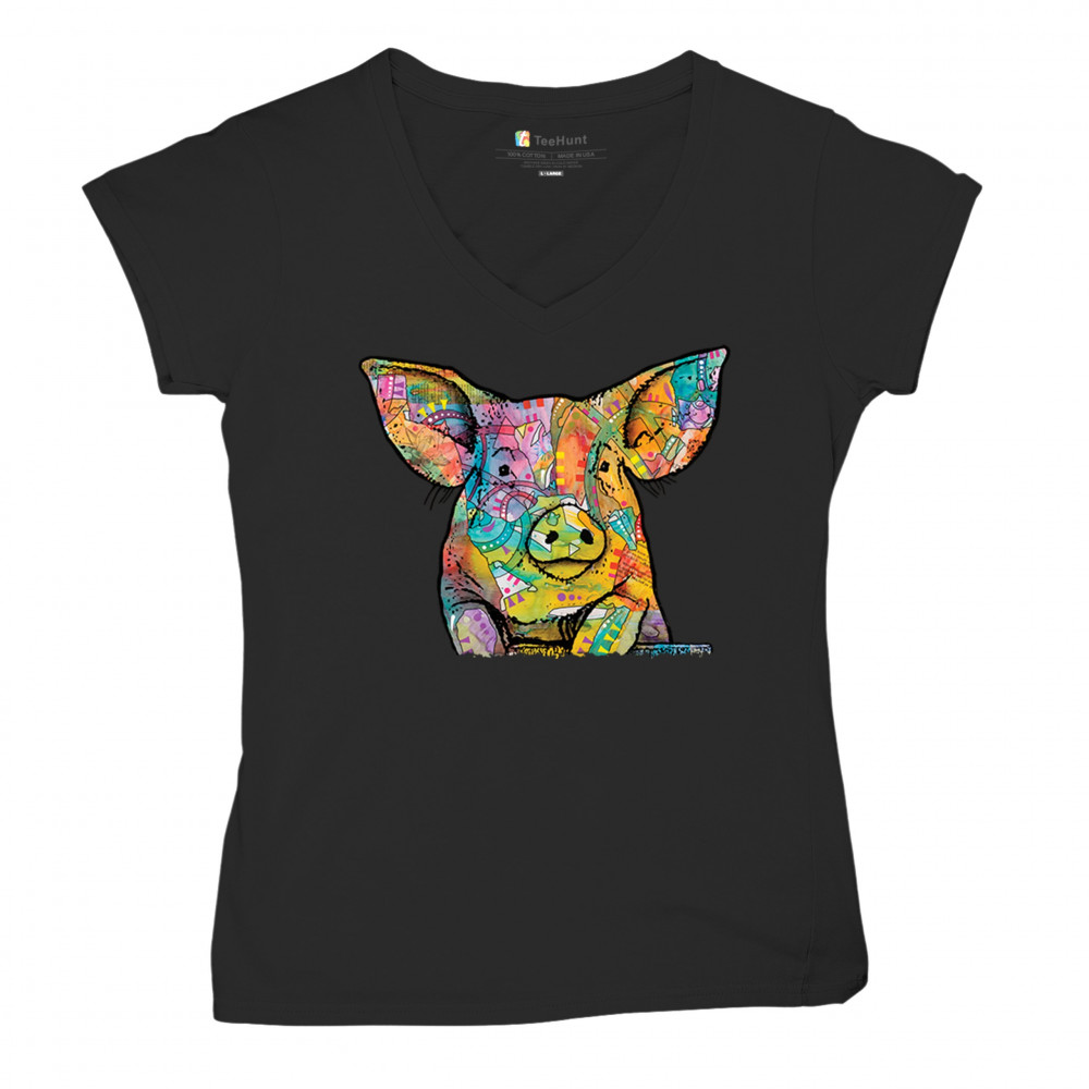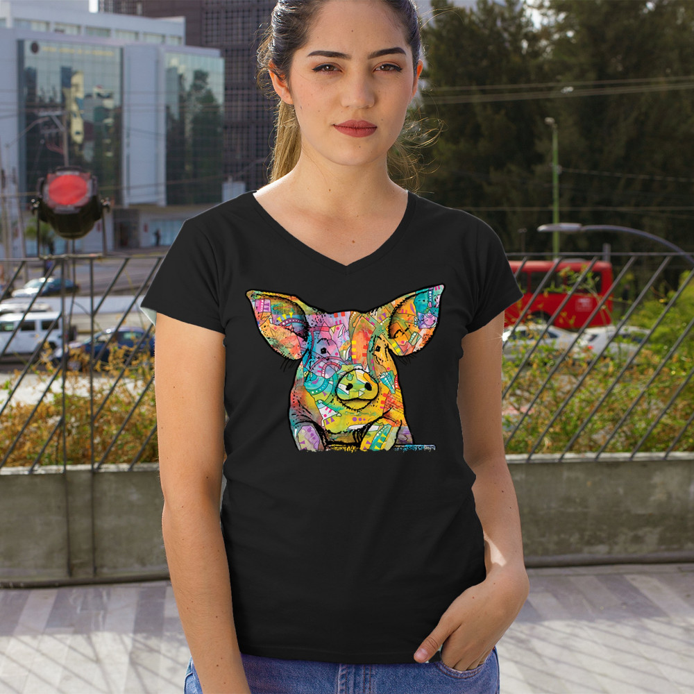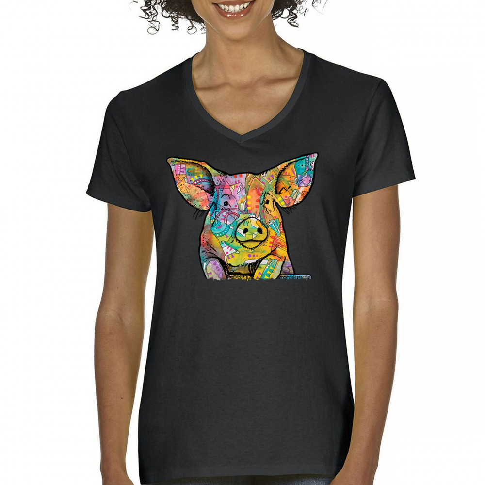 DEAN RUSSO FUNNY CUTE PIG women's v-neck t-shirt farm piglet lover barn tee black