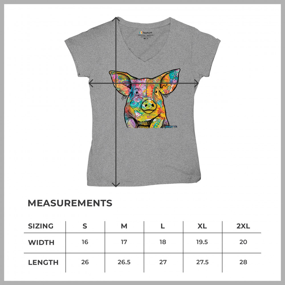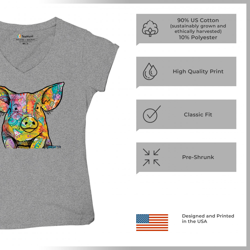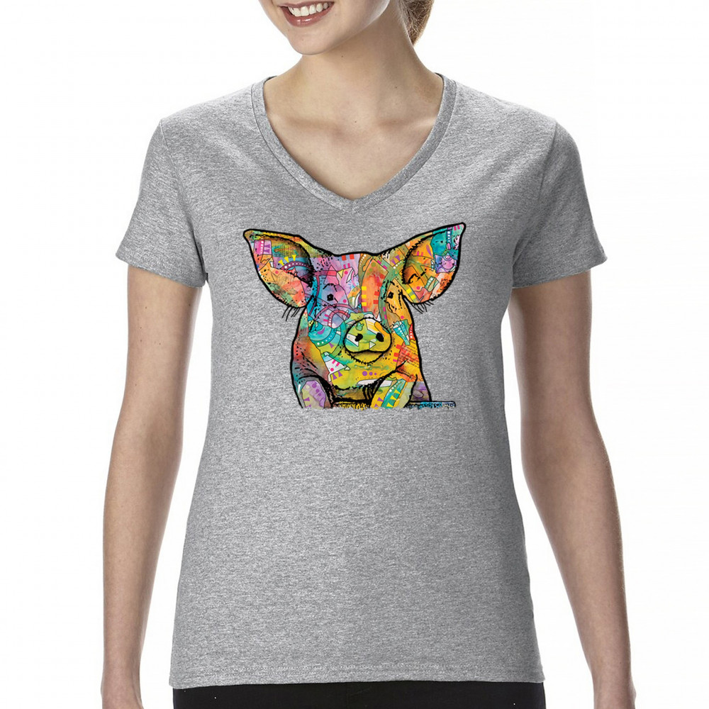DEAN RUSSO FUNNY CUTE PIG women's v-neck t-shirt farm piglet lover barn tee gray