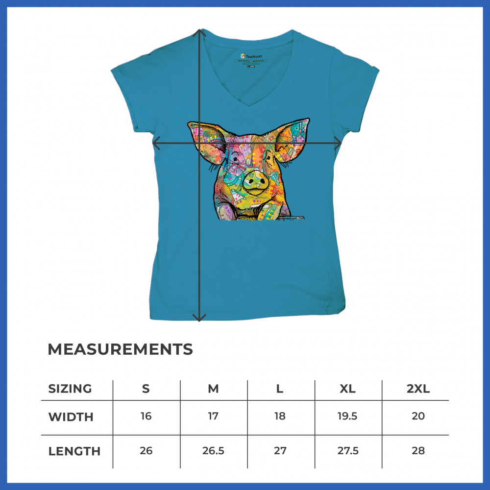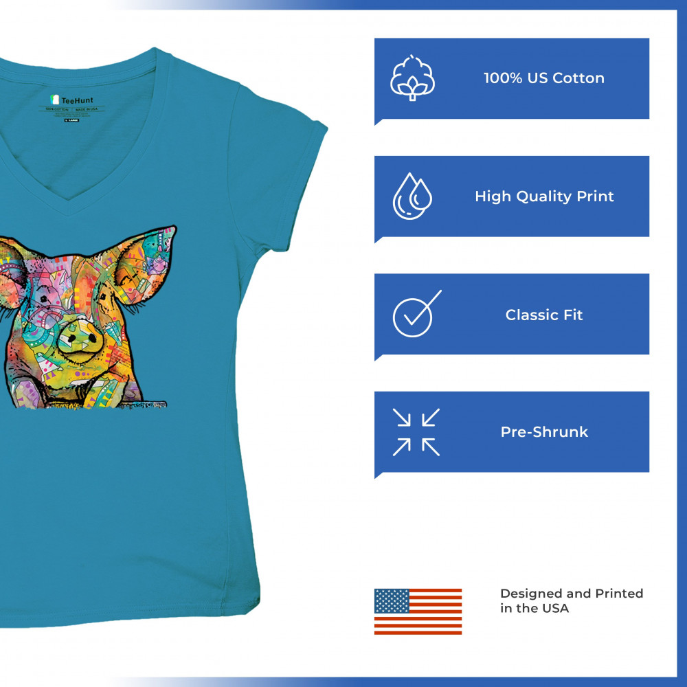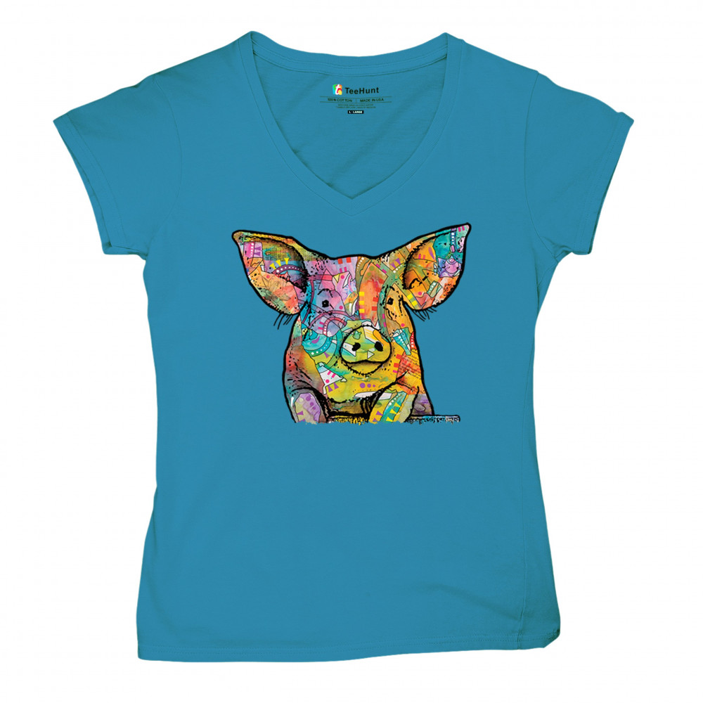 DEAN RUSSO FUNNY CUTE PIG women's v-neck t-shirt farm piglet lover barn tee turquoise