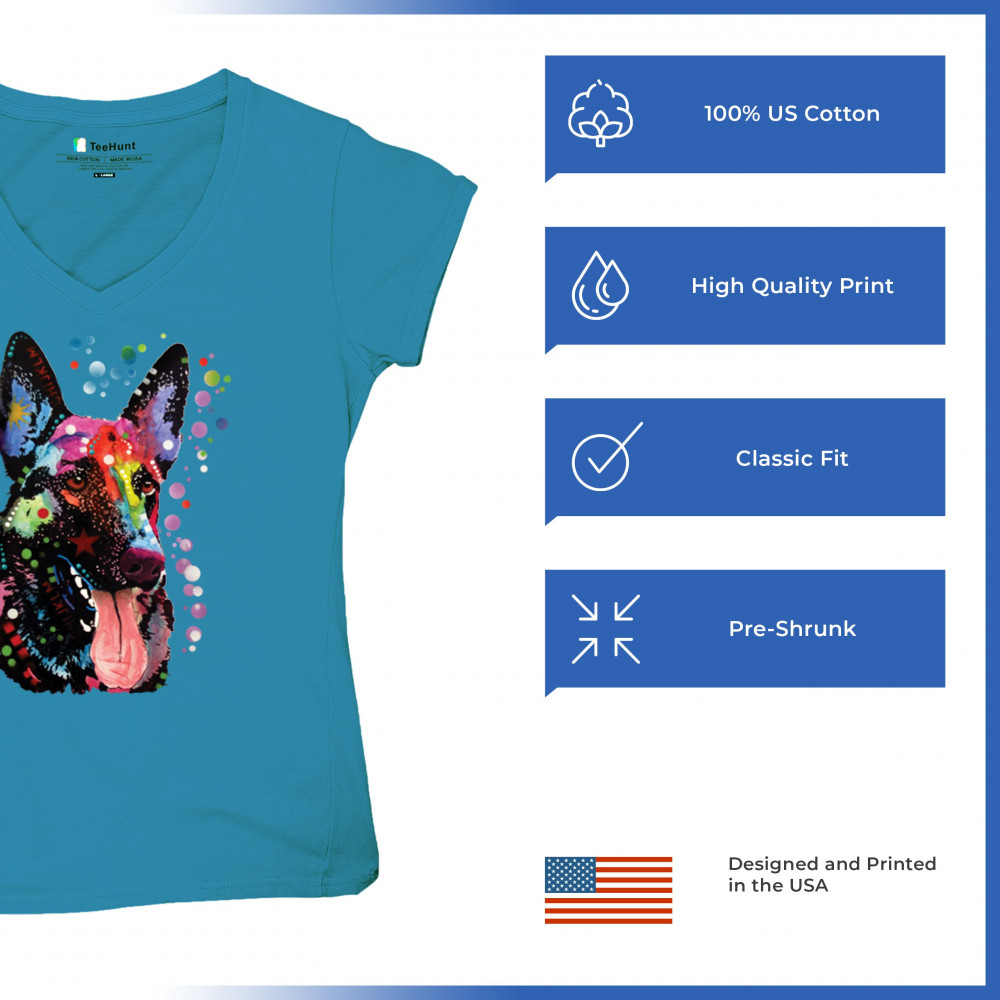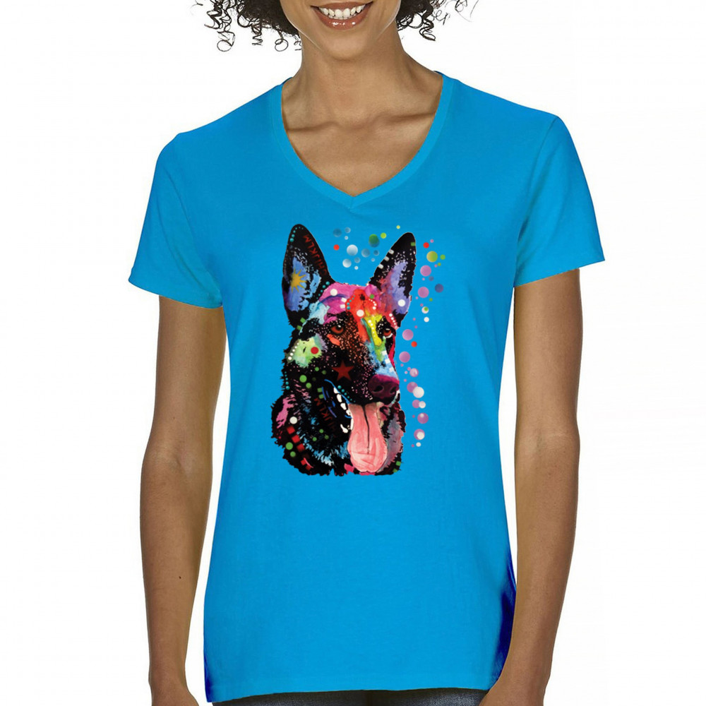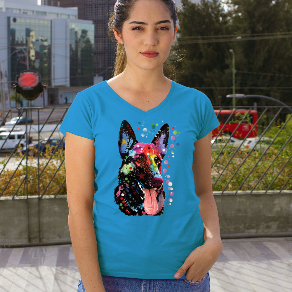 DEAN RUSSO GERMAN SHEPHERD women's v-neck t-shirt colorful dog best friend tee turquoise