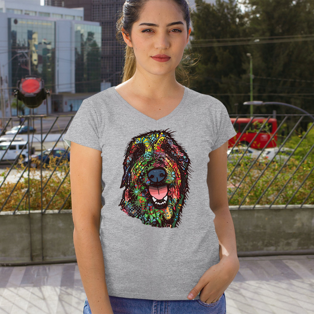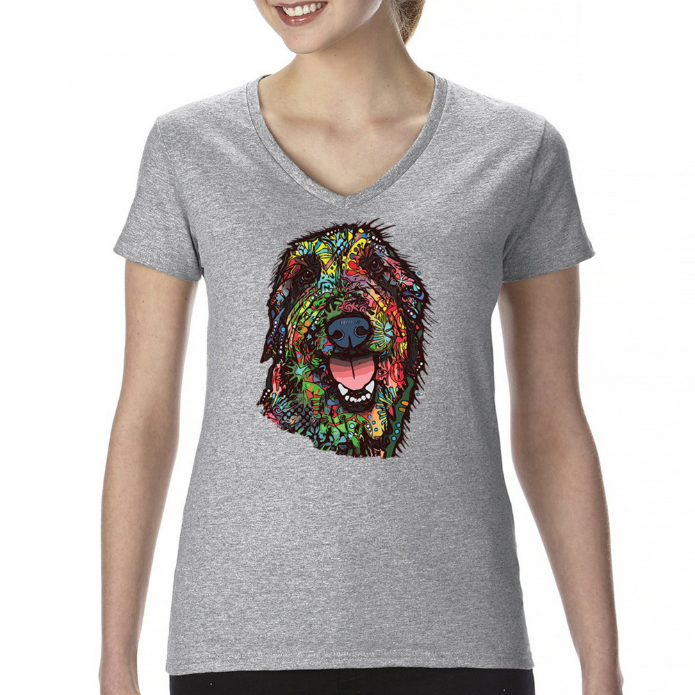 FUNNY FEELING HAPPY DOG FACE dean russo happy dog face women's v-neck t-shirt funny feeling pet tee gray