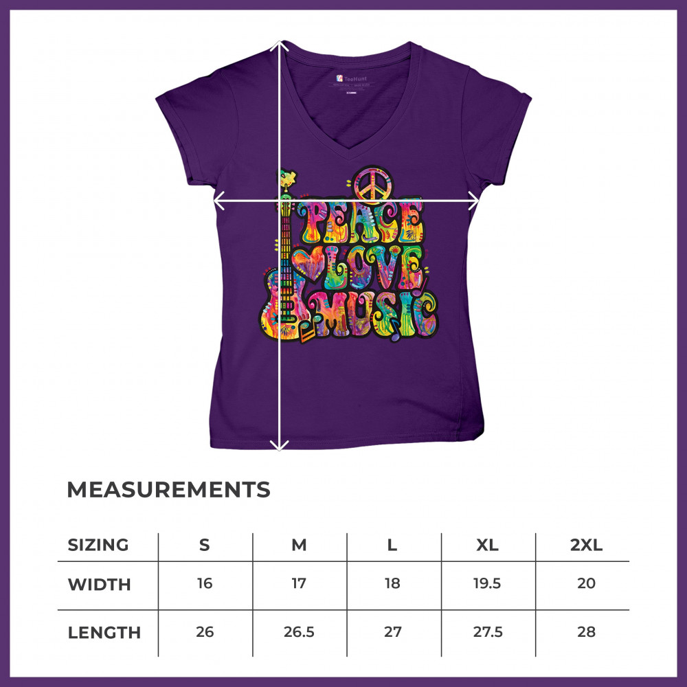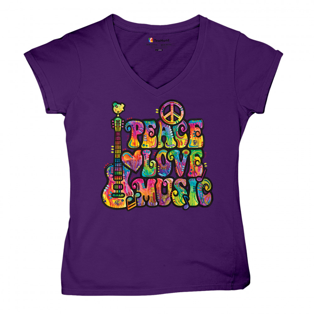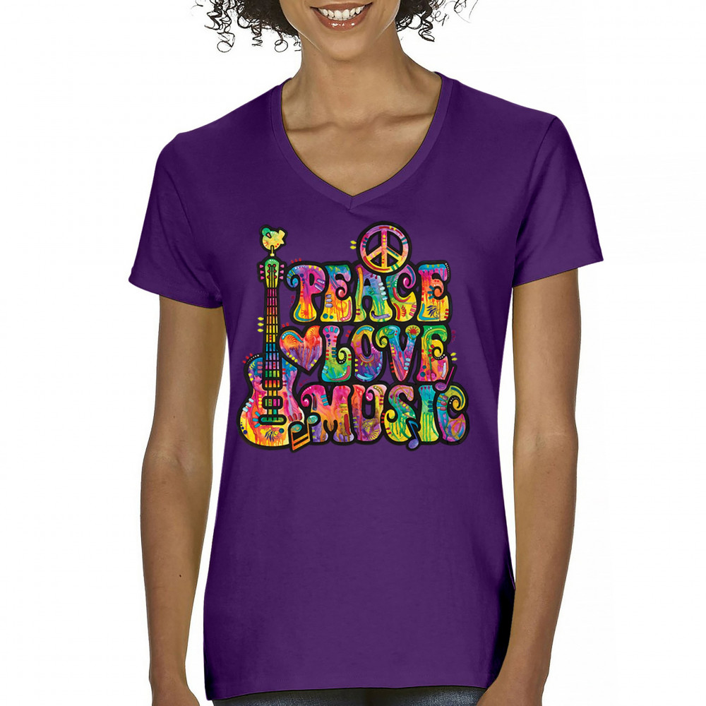DEAN RUSSO PEACE LOVE MUSIC women's v-neck t-shirt guitar happy good vibe tee purple