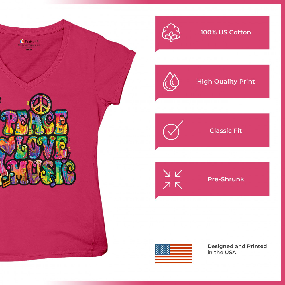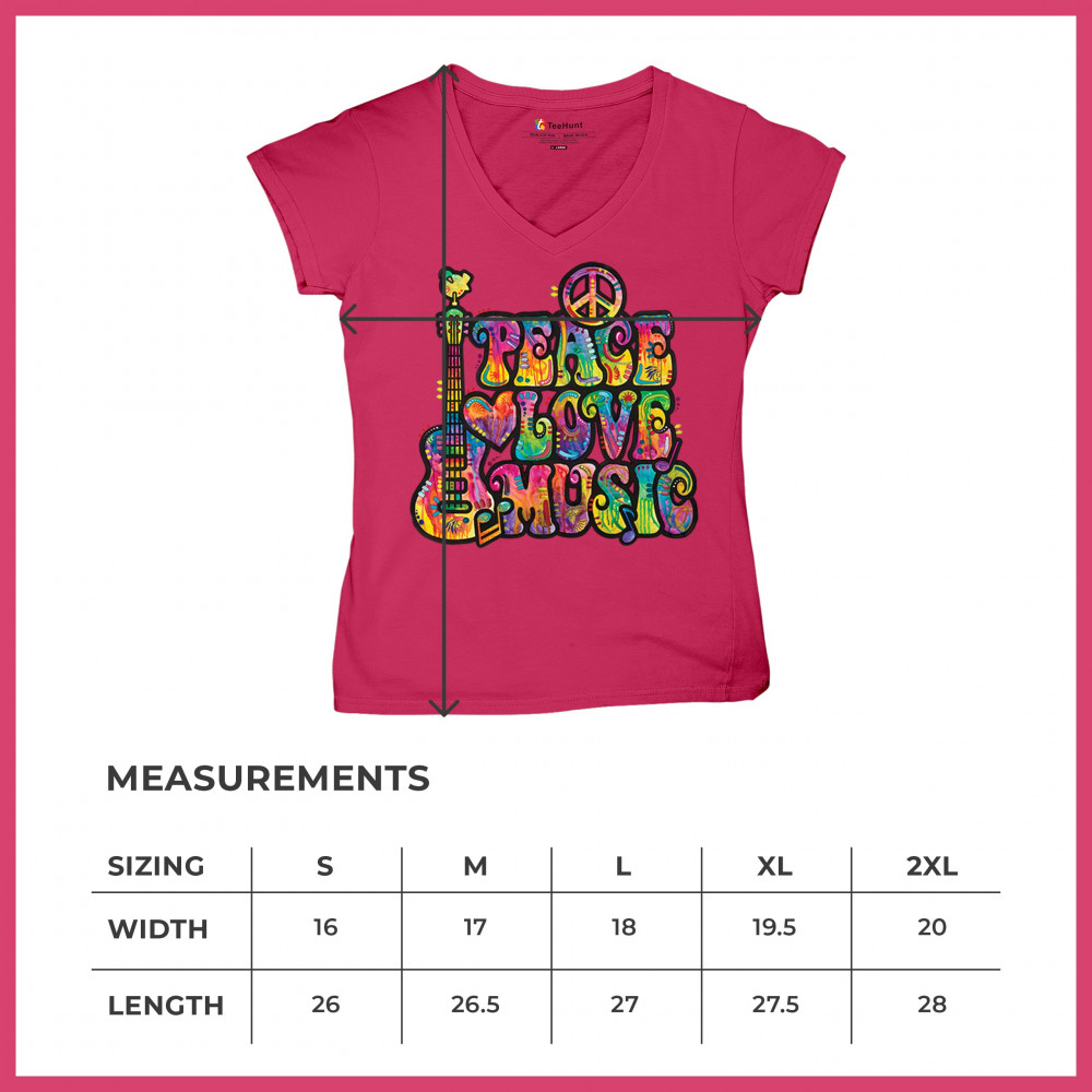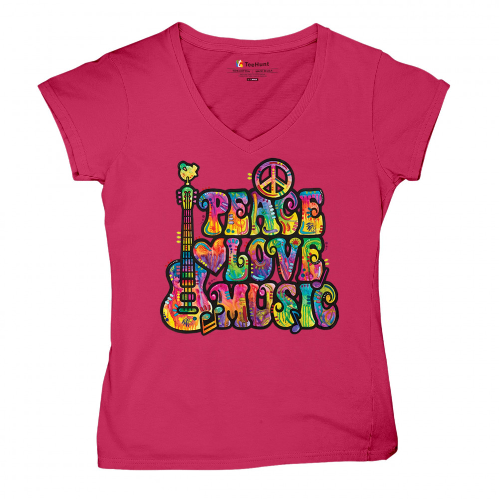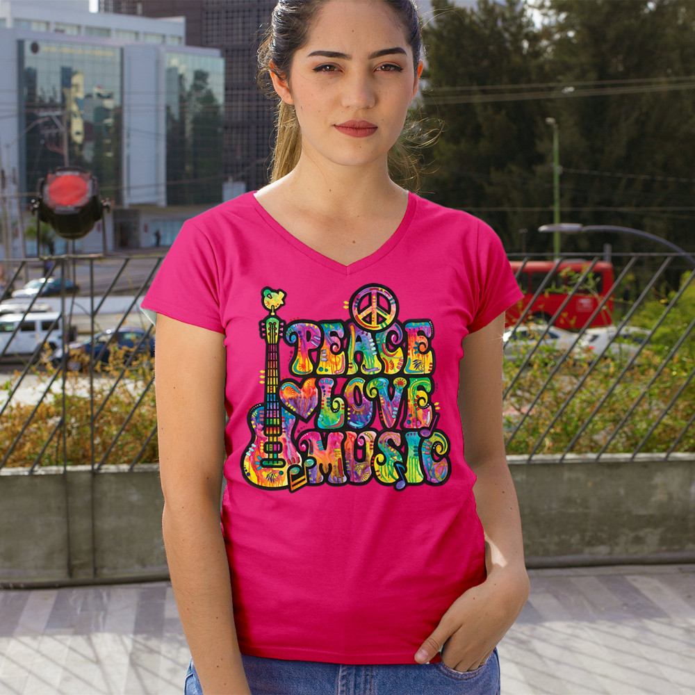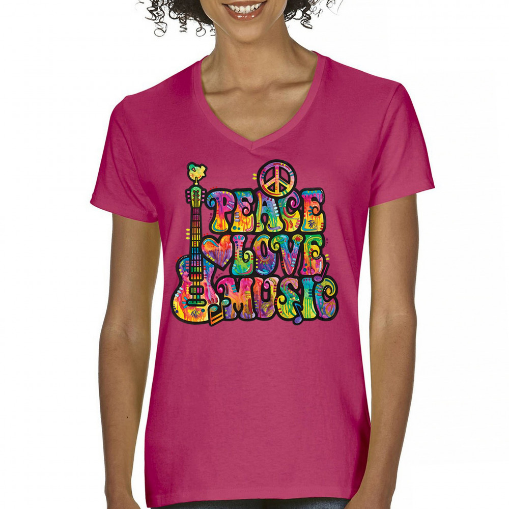 DEAN RUSSO PEACE LOVE MUSIC women's v-neck t-shirt guitar happy good vibe tee pink
