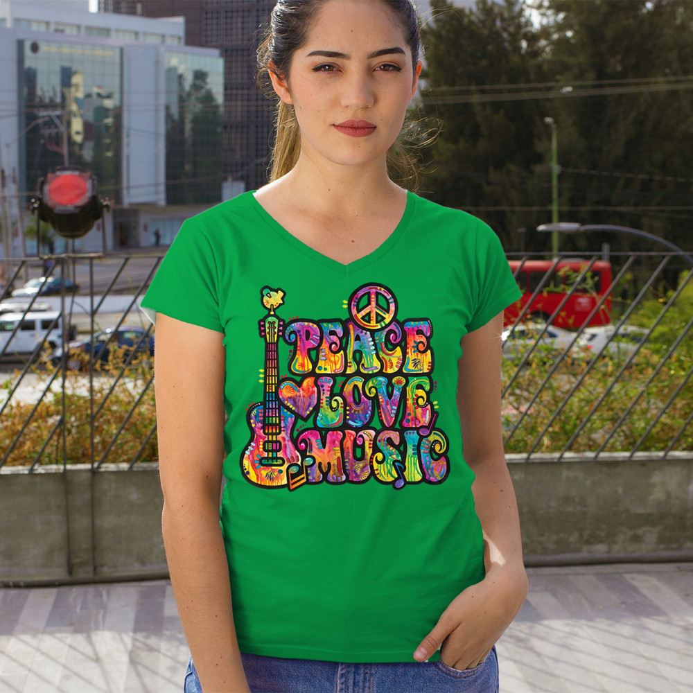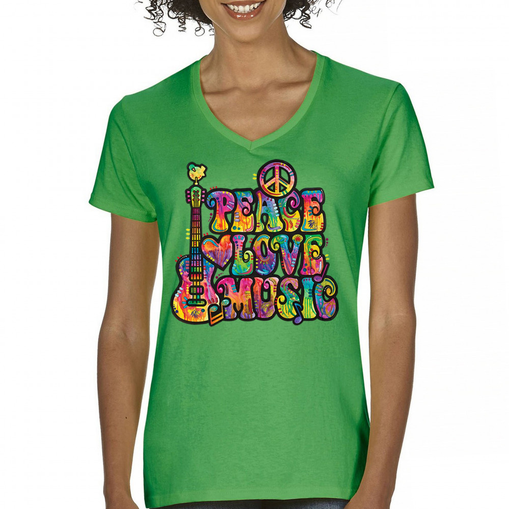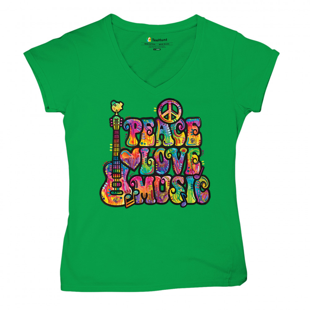 DEAN RUSSO PEACE LOVE MUSIC women's v-neck t-shirt guitar happy good vibe tee green
