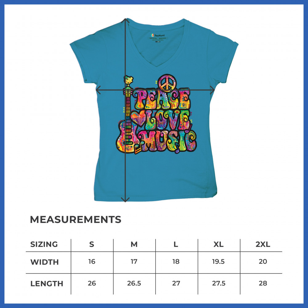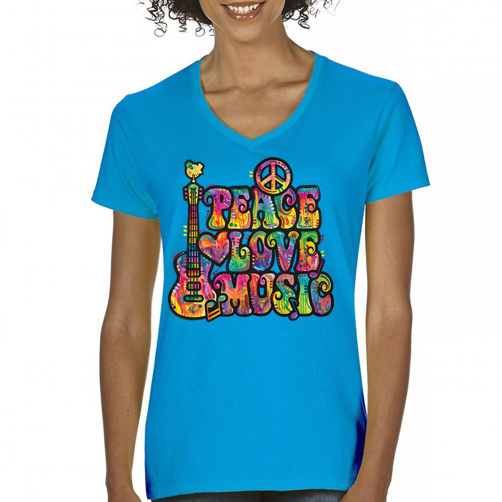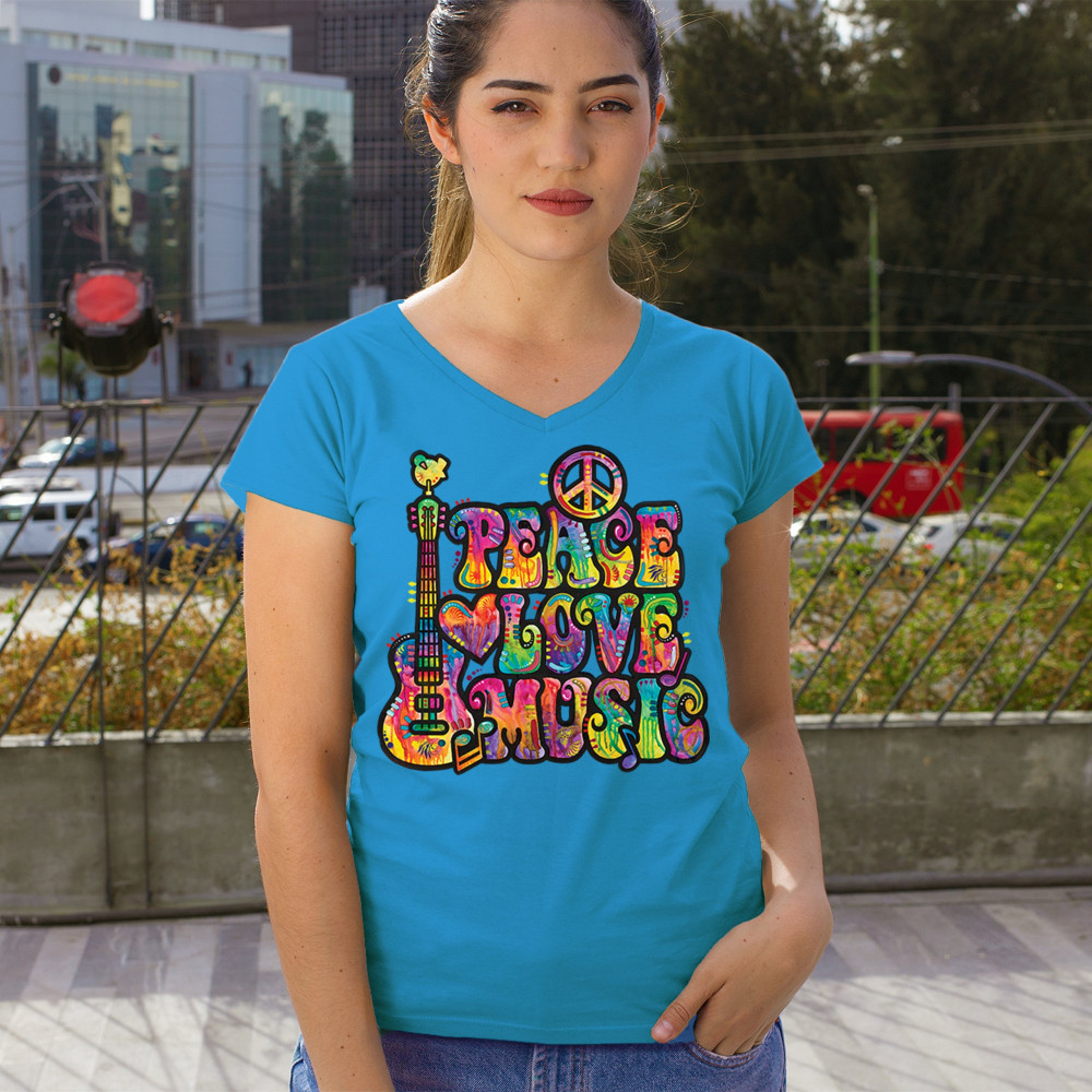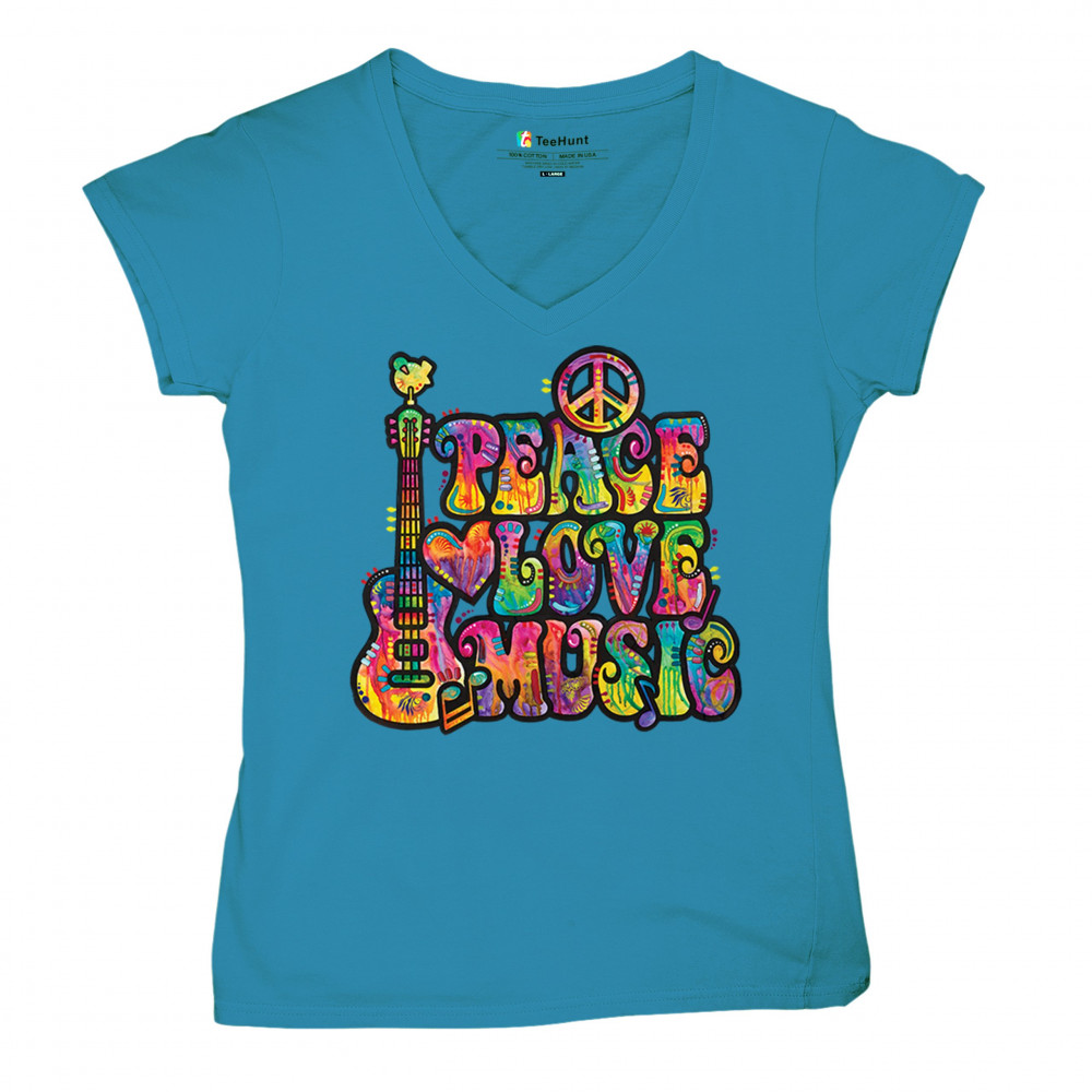 DEAN RUSSO PEACE LOVE MUSIC women's v-neck t-shirt guitar happy good vibe tee turquoise