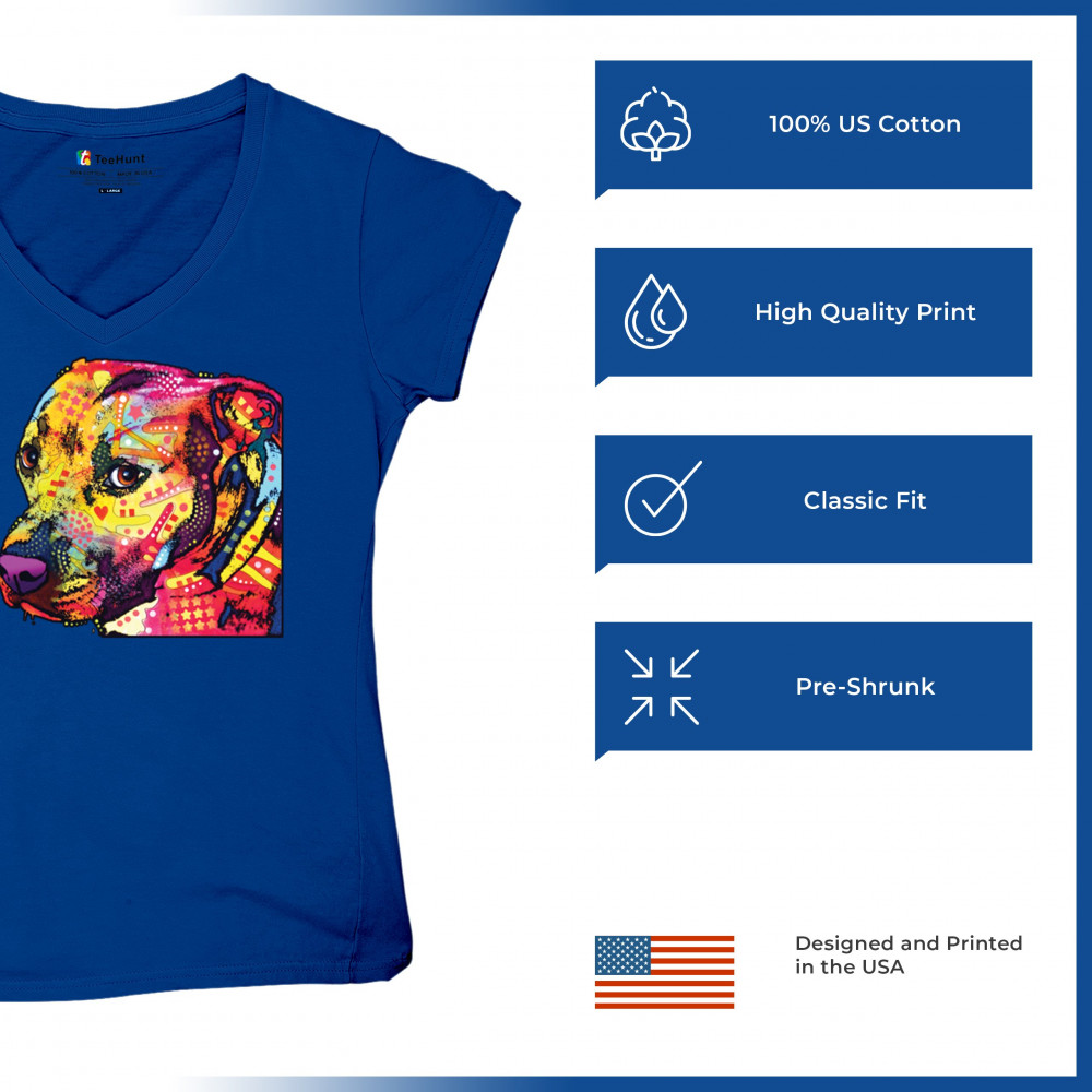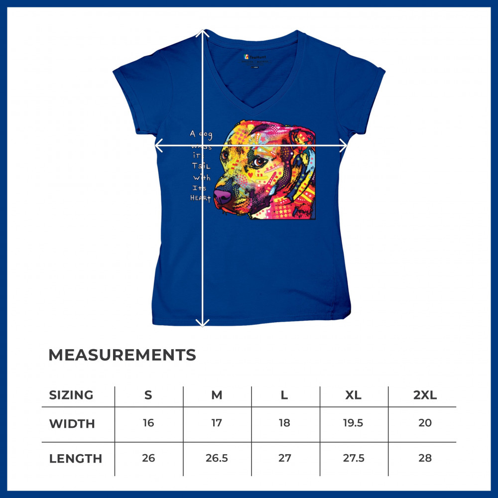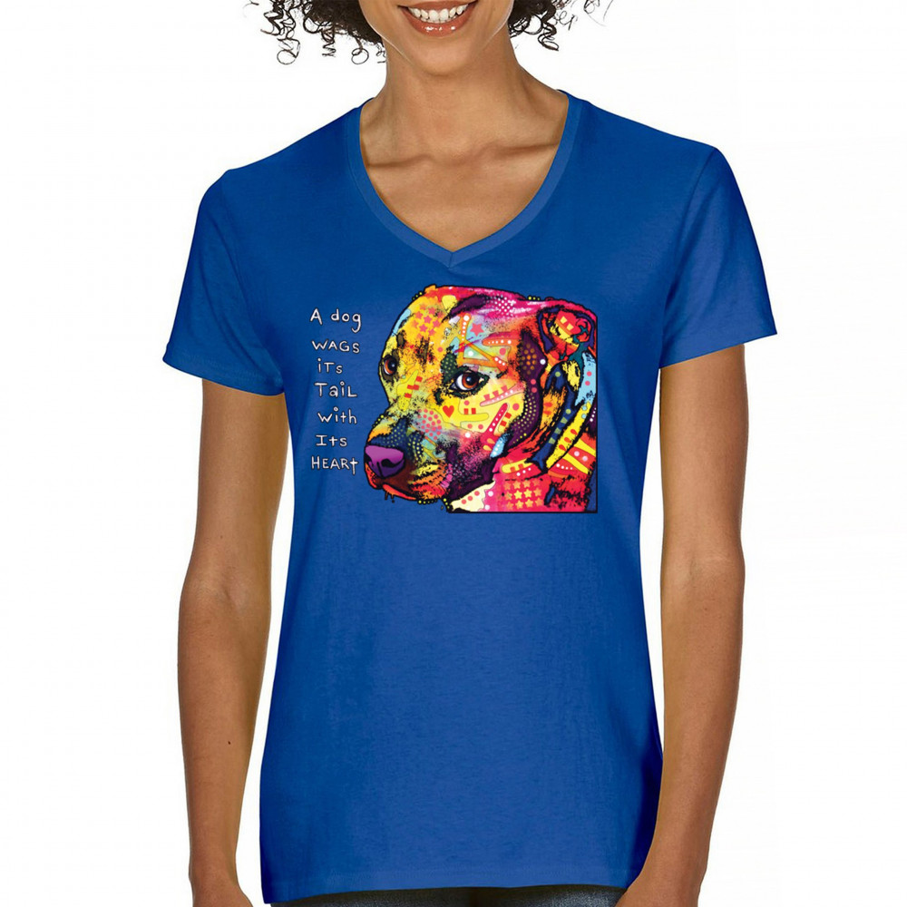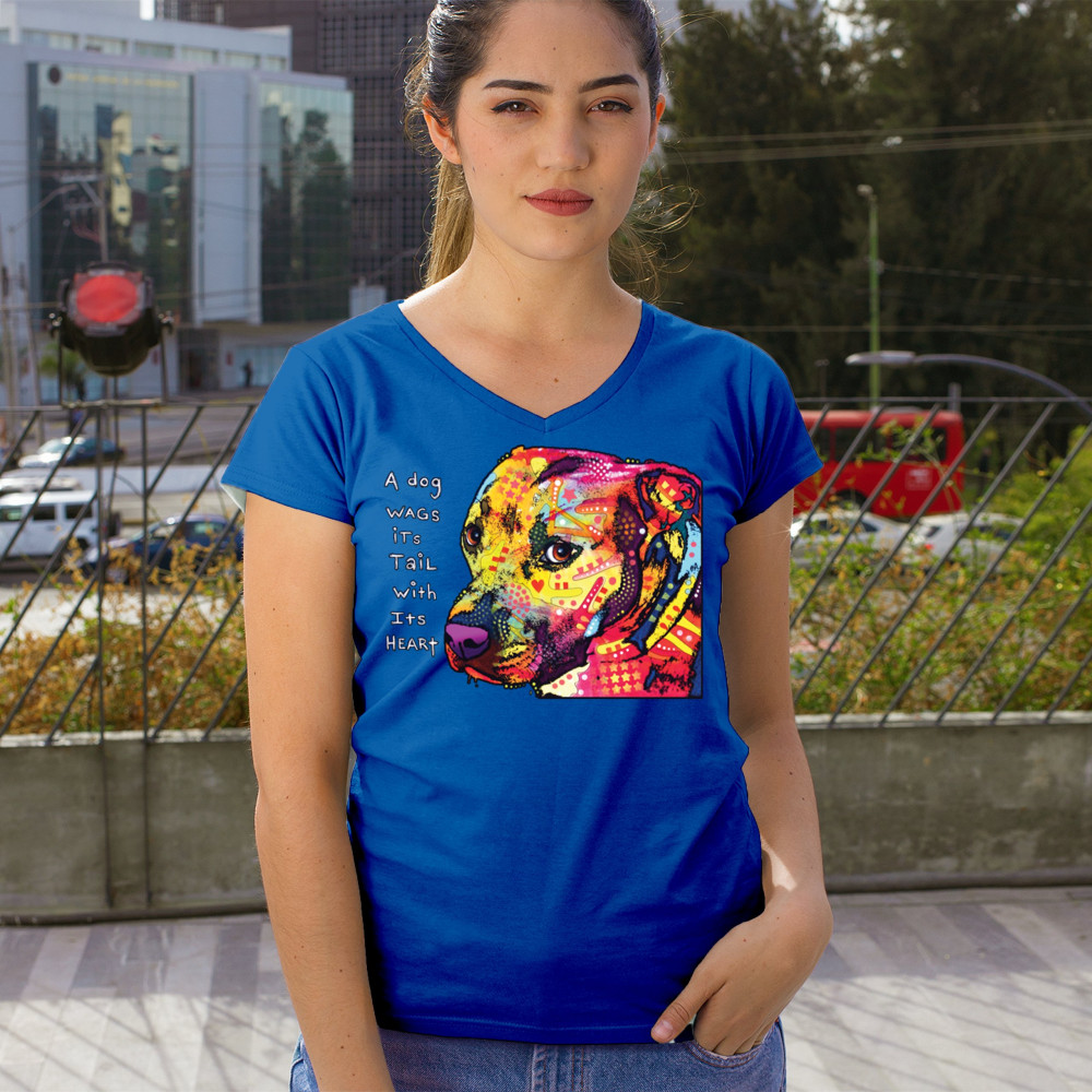 DEAN RUSSO PIT BULL women's v-neck t-shirt a dog wags its tail with its heart tee royal blue