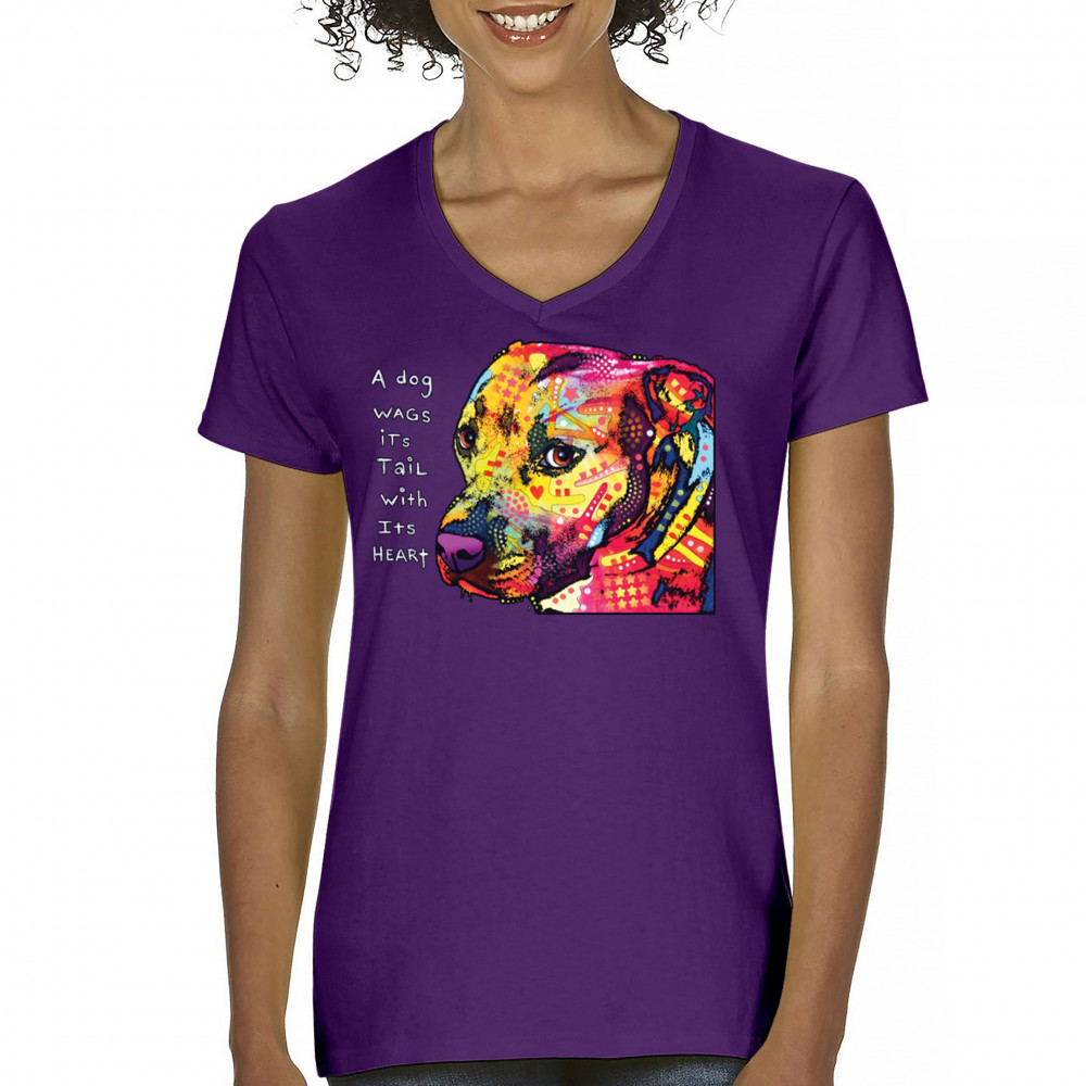 DEAN RUSSO PIT BULL women's v-neck t-shirt a dog wags its tail with its heart tee purple