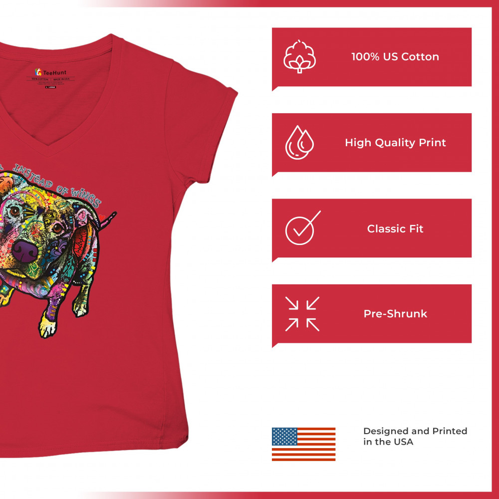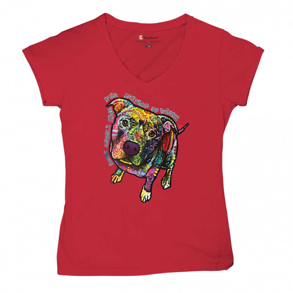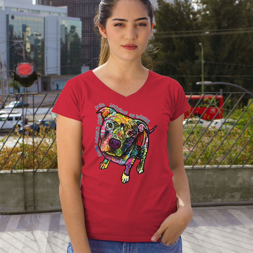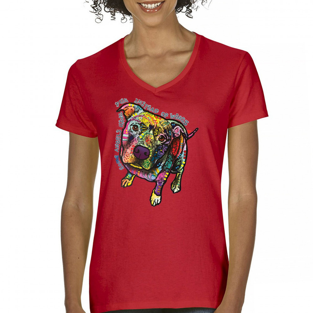 DEAN RUSSO PIT BULL women's v-neck t-shirt dog paw some angels have fur tee red
