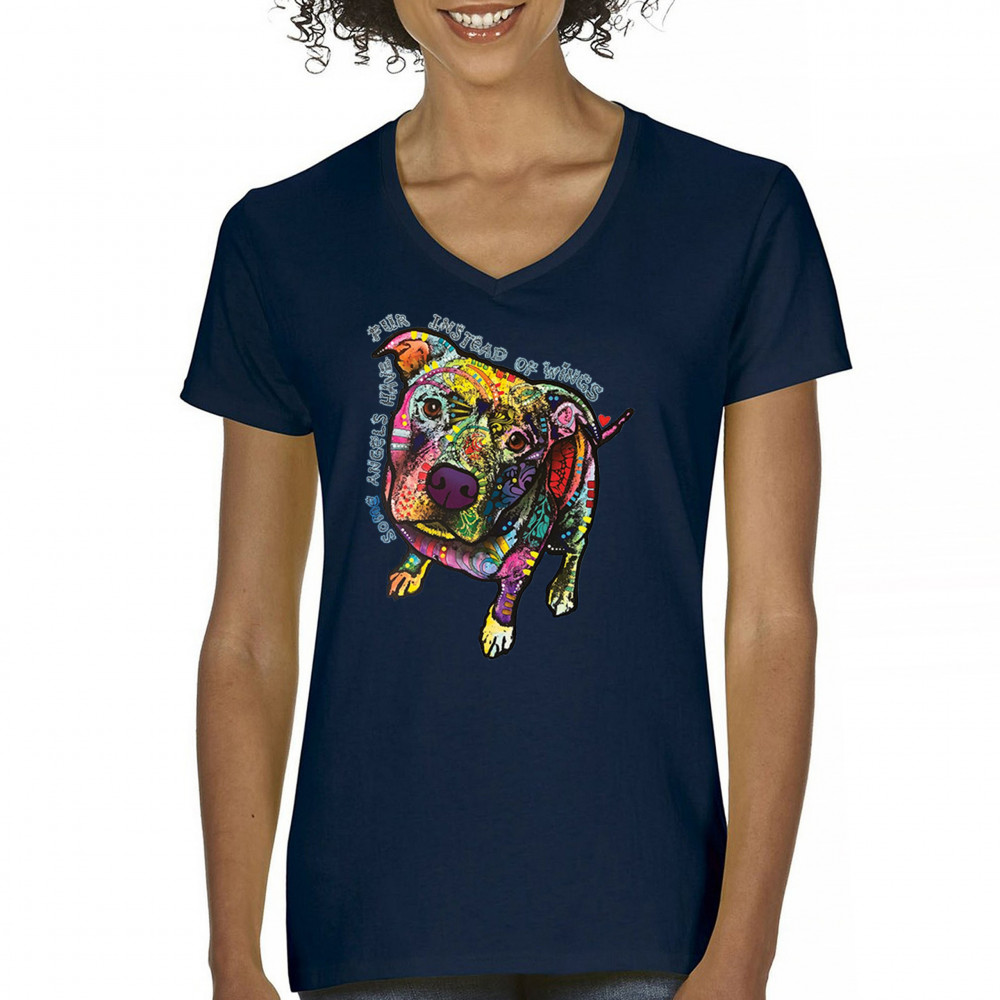 DEAN RUSSO PIT BULL women's v-neck t-shirt dog paw some angels have fur tee navy blue
