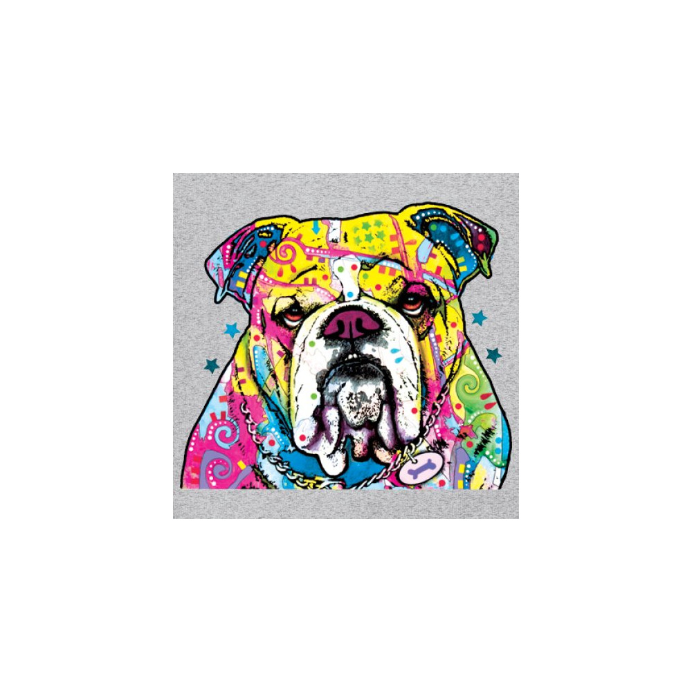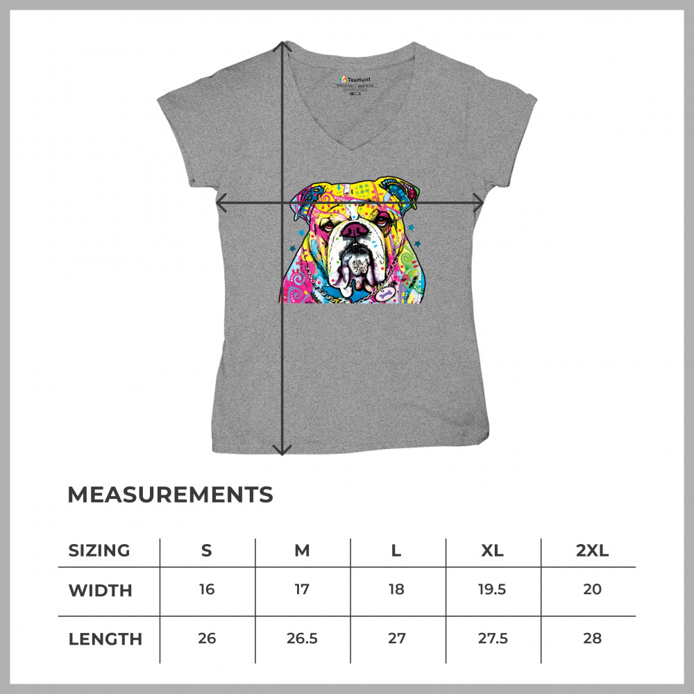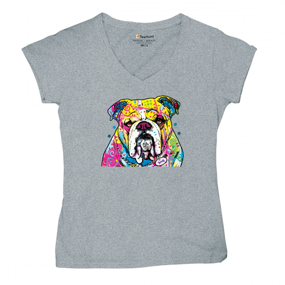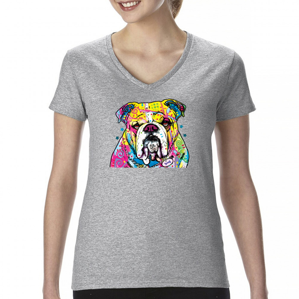 DEAN RUSSO SERIOUS BULLDOG women's v-neck t-shirt colorful dog best friend tee gray