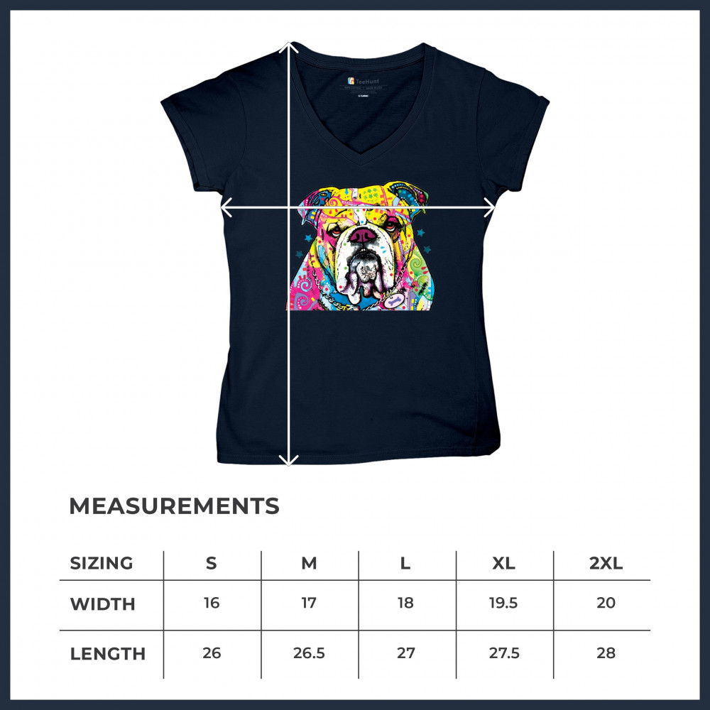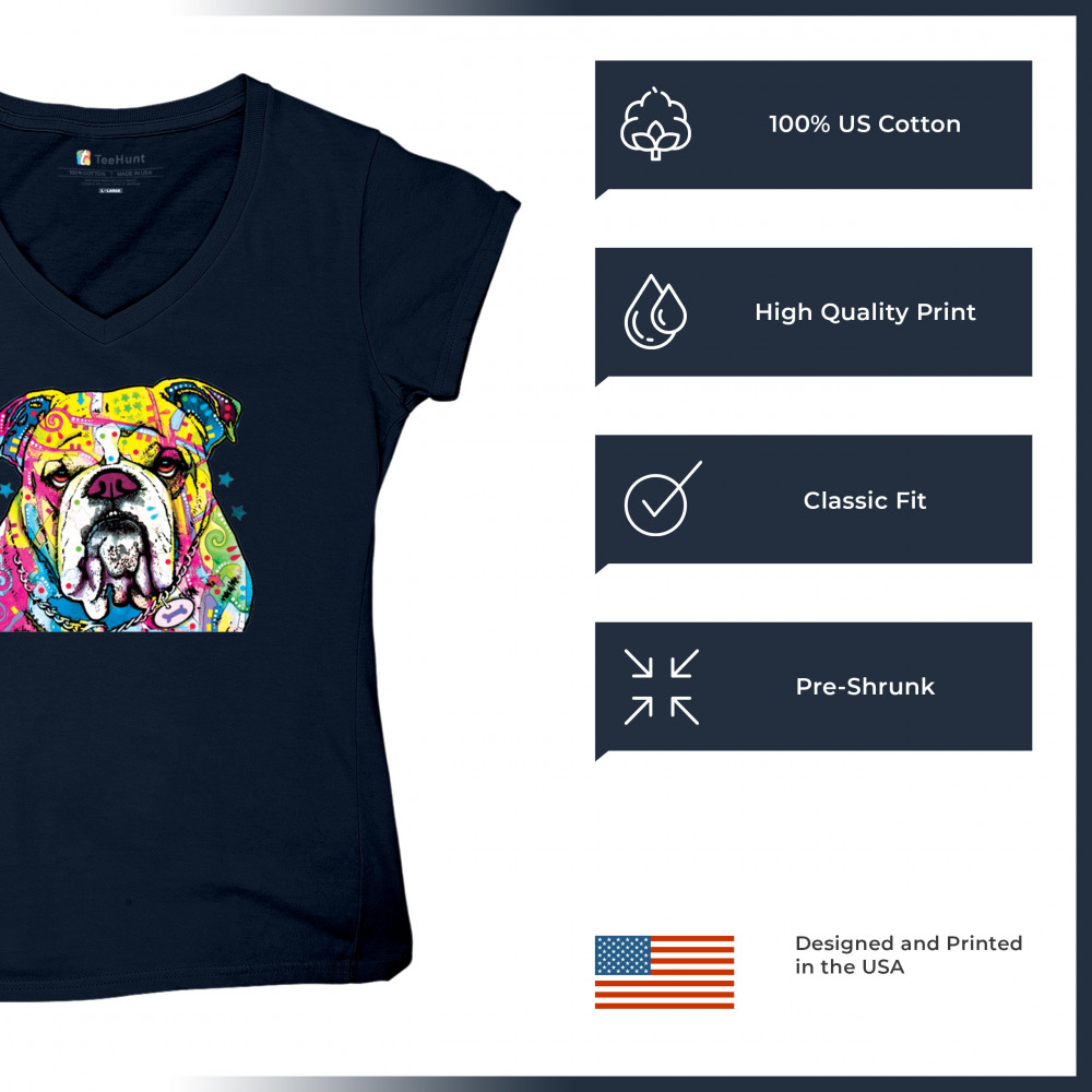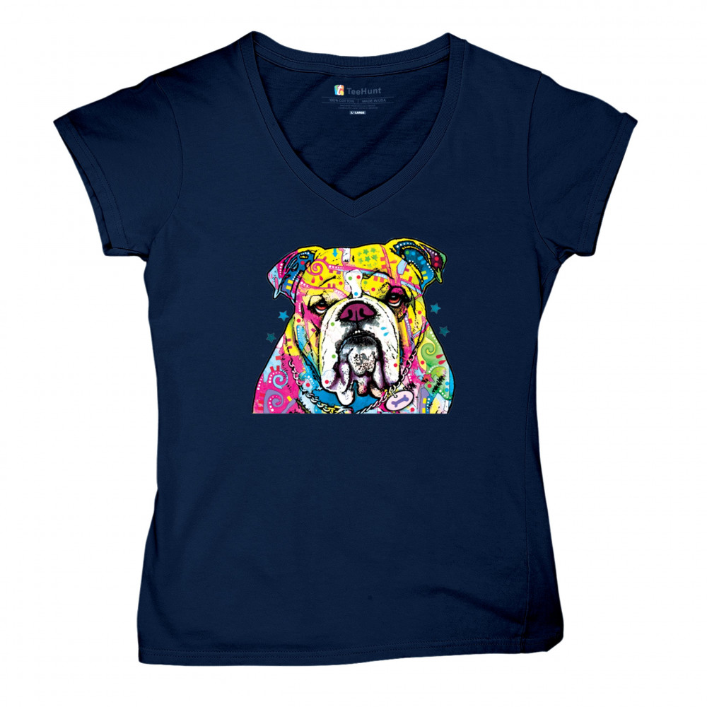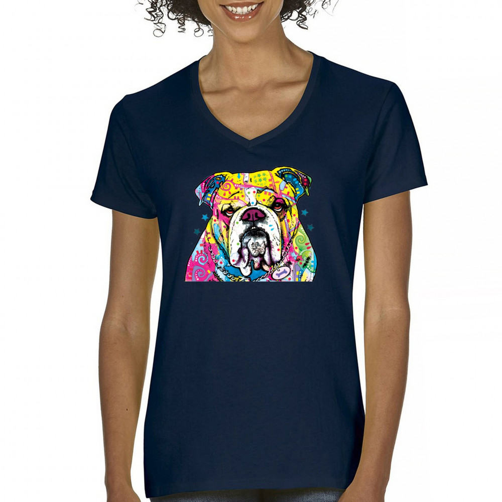 DEAN RUSSO SERIOUS BULLDOG women's v-neck t-shirt colorful dog best friend tee navy blue