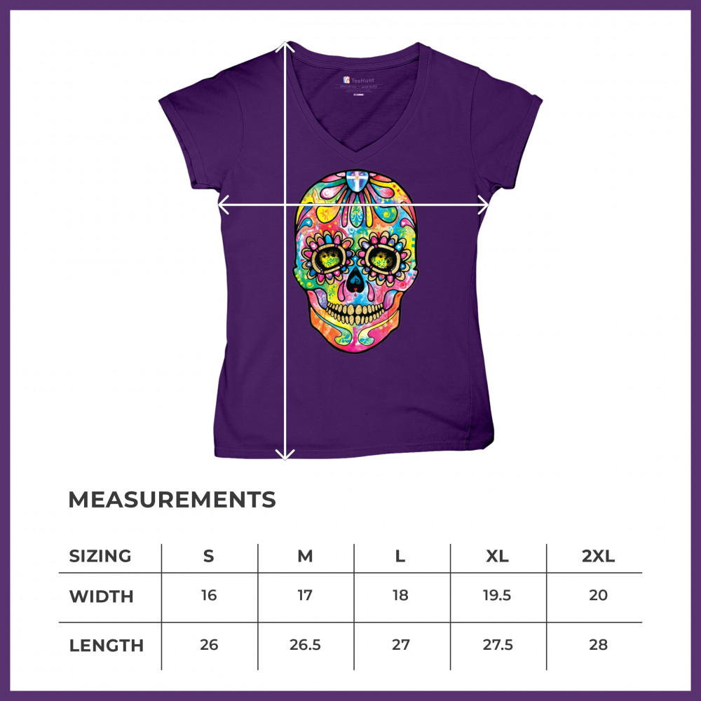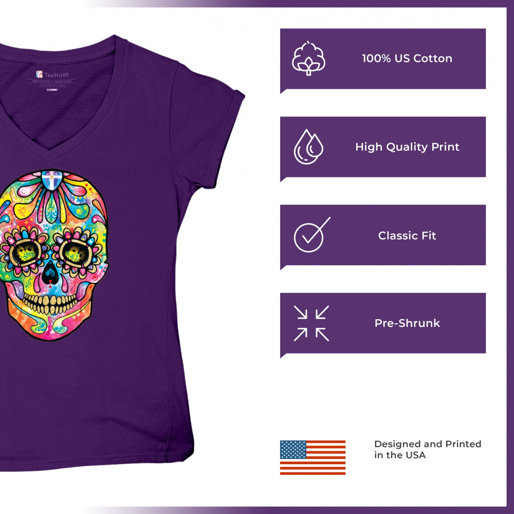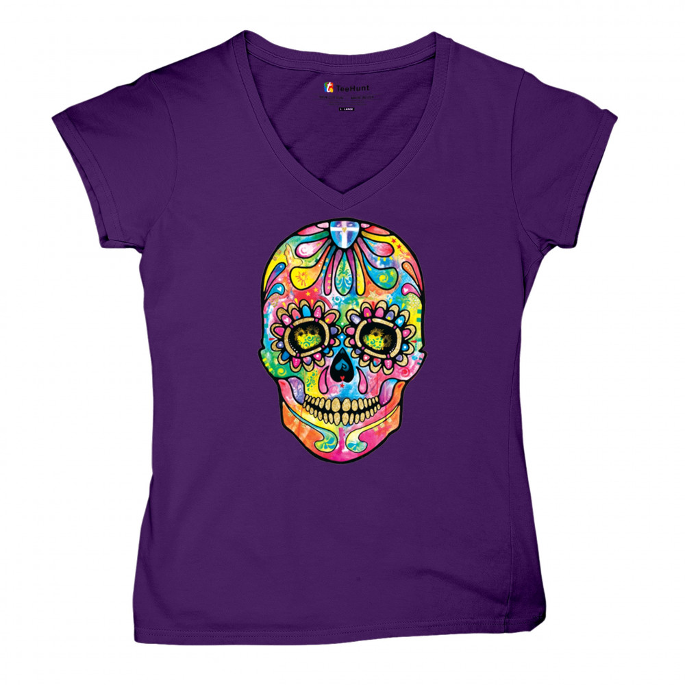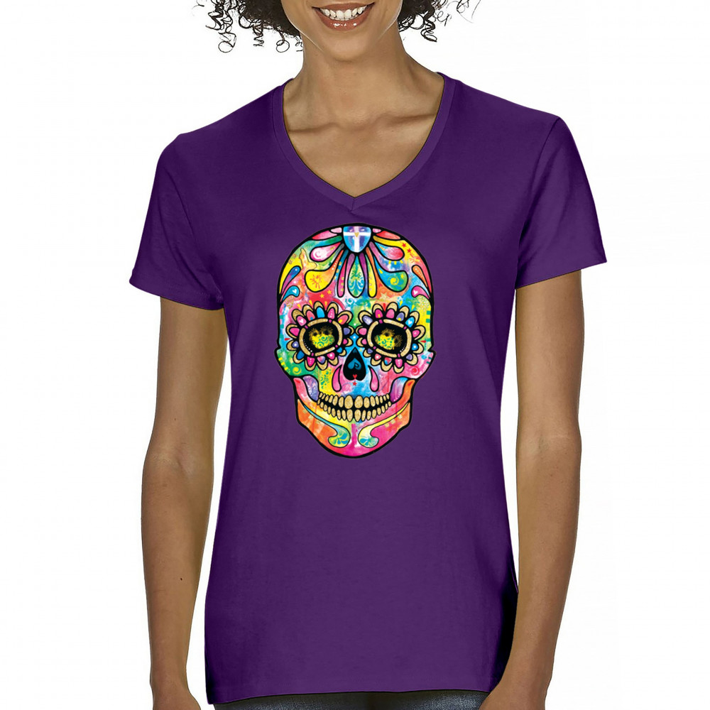 DEAN RUSSO SUGAR SKULL women's v-neck t-shirt day of the dead neon calavera tee purple