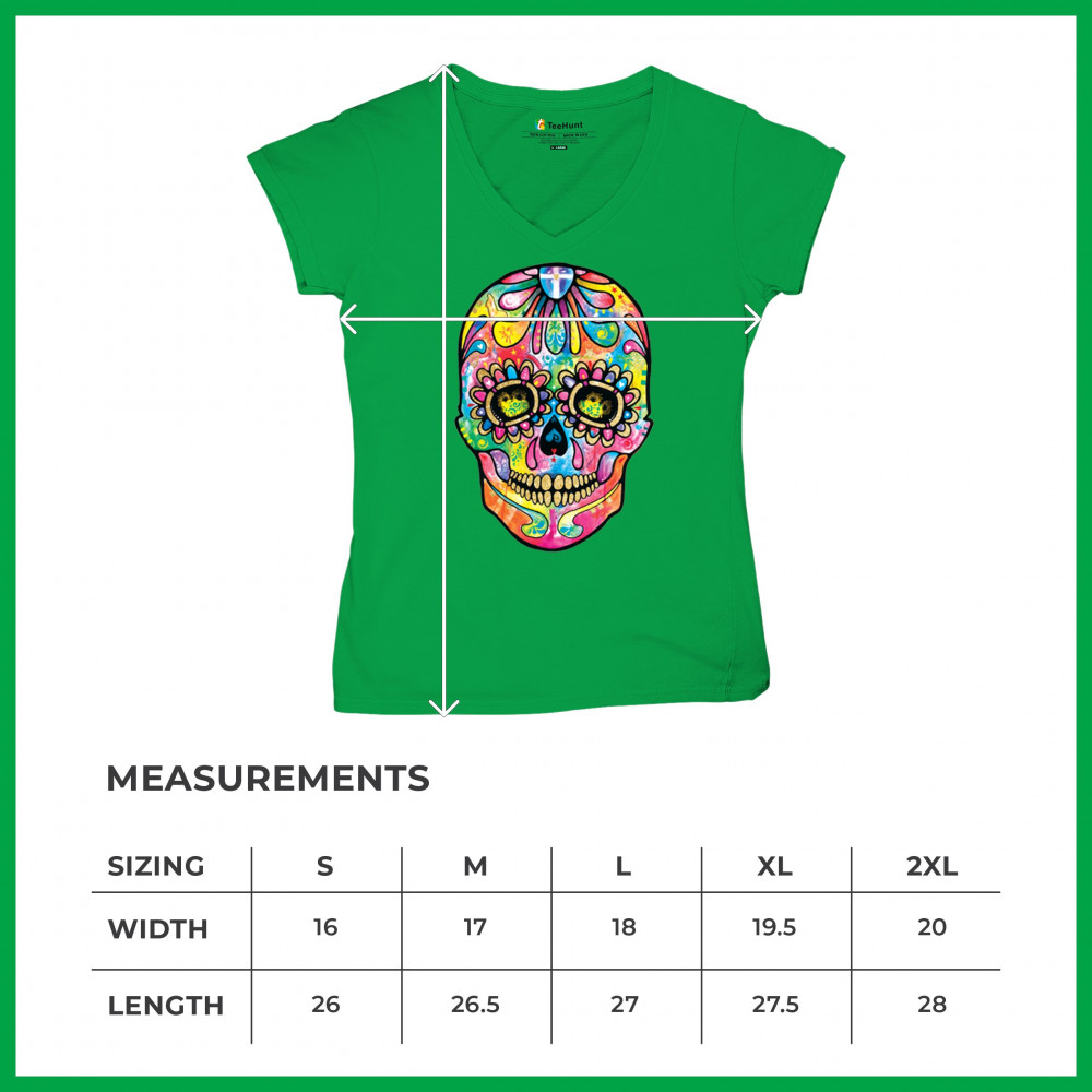 DEAN RUSSO SUGAR SKULL women's v-neck t-shirt day of the dead neon calavera tee green