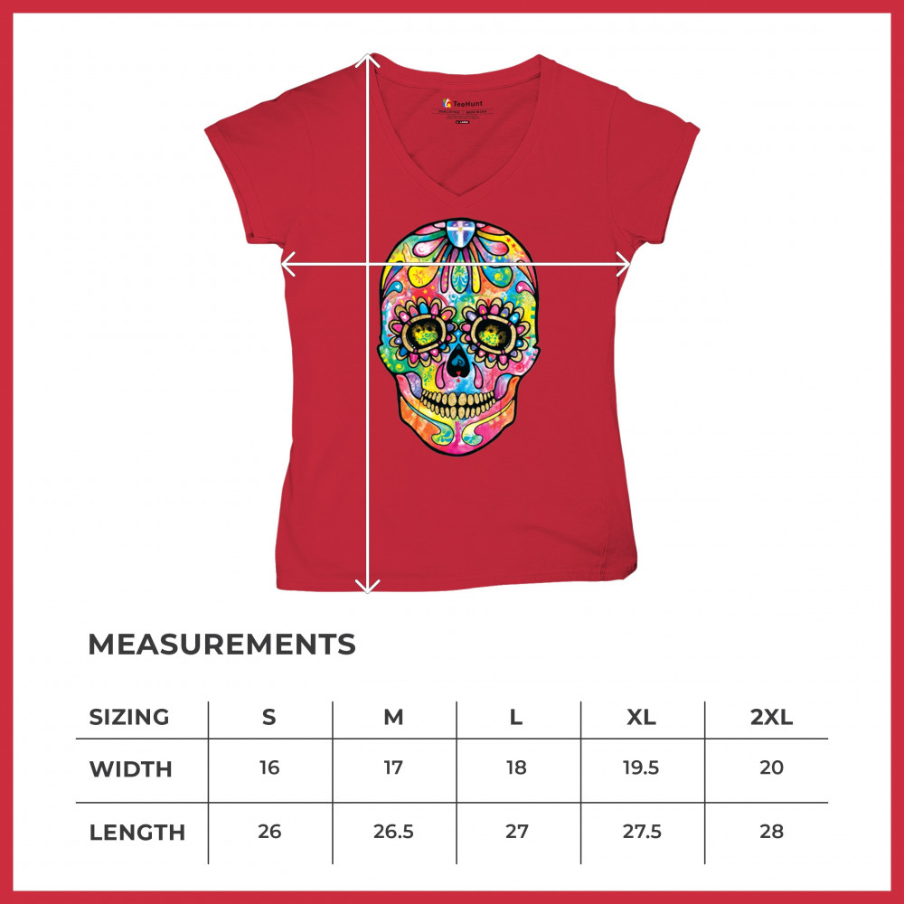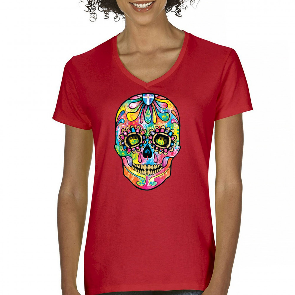 DEAN RUSSO SUGAR SKULL women's v-neck t-shirt day of the dead neon calavera tee red