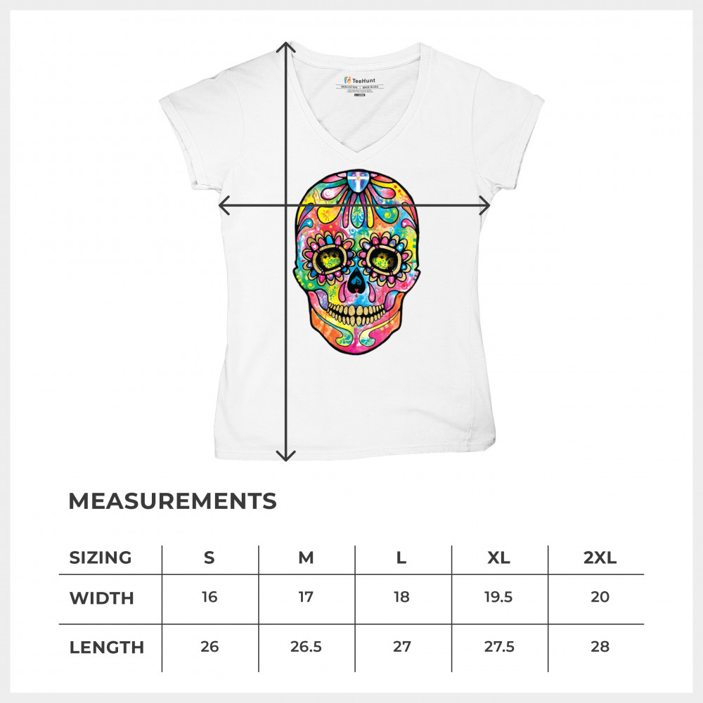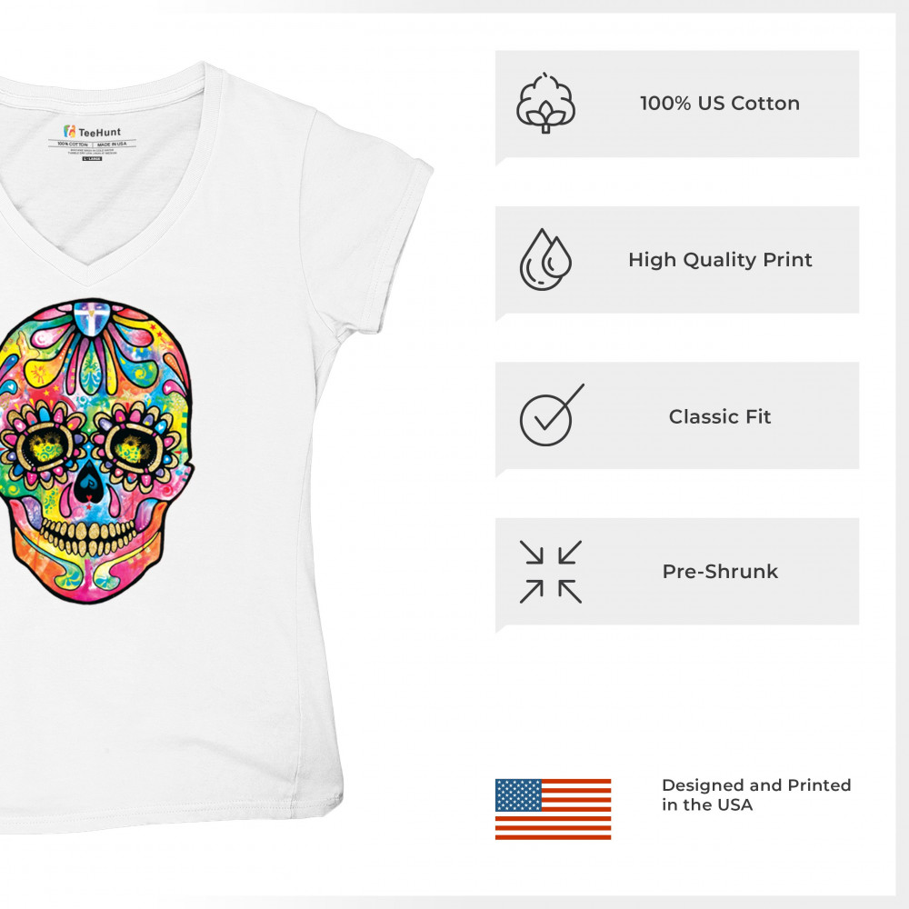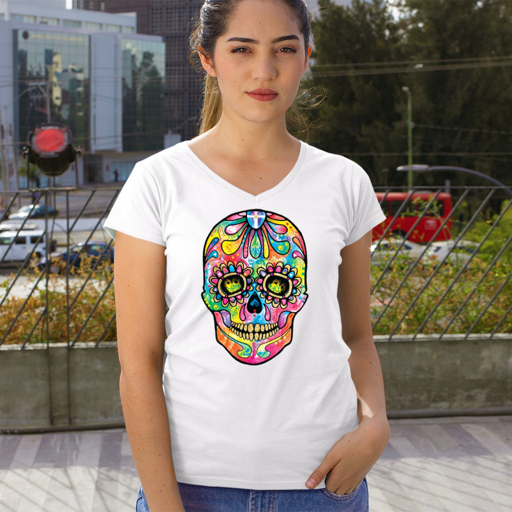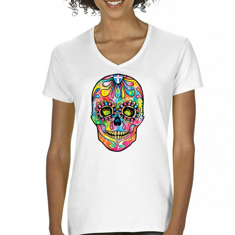 DEAN RUSSO SUGAR SKULL women's v-neck t-shirt day of the dead neon calavera tee white