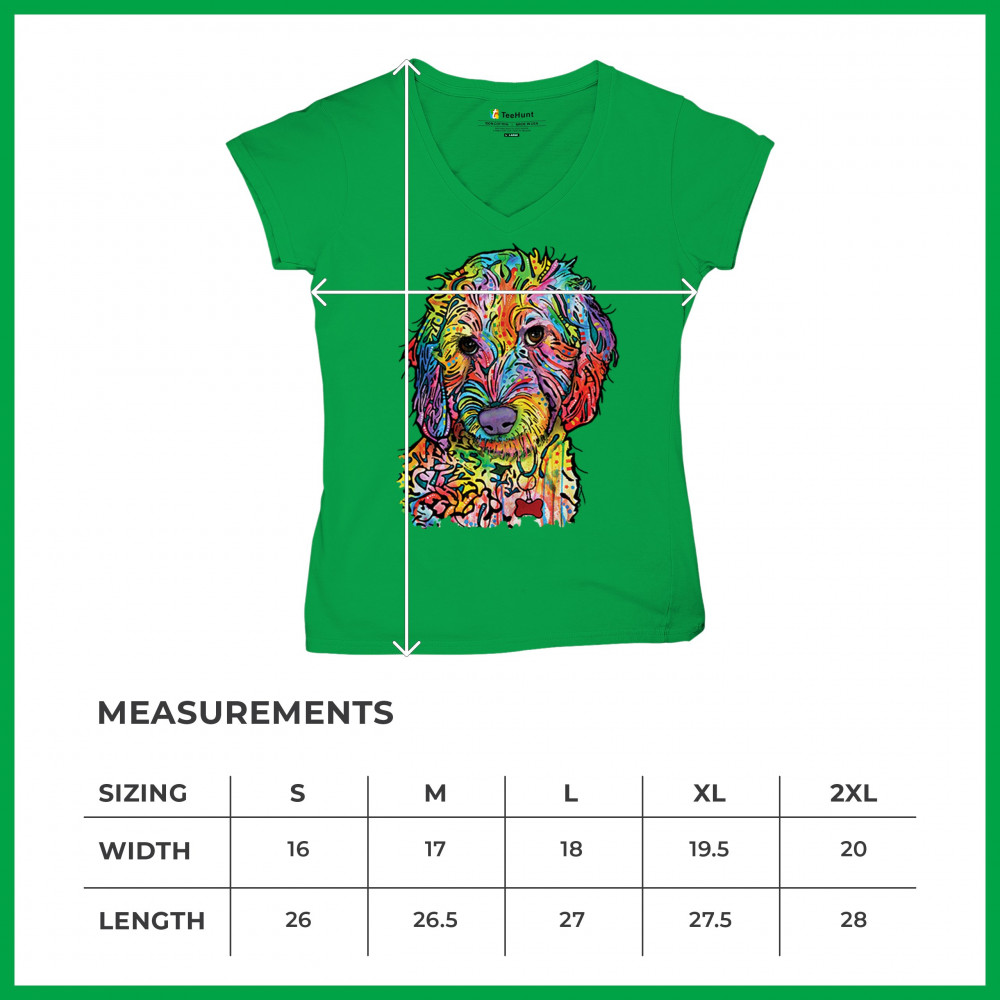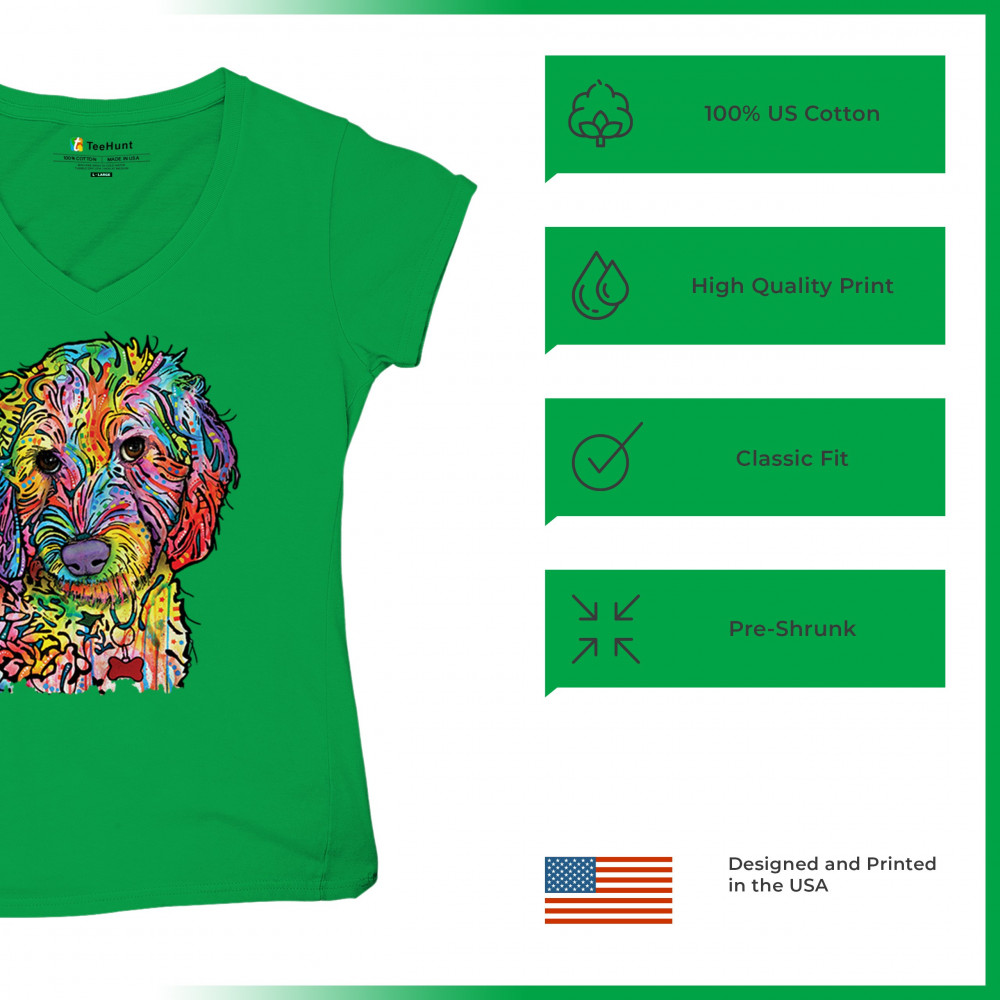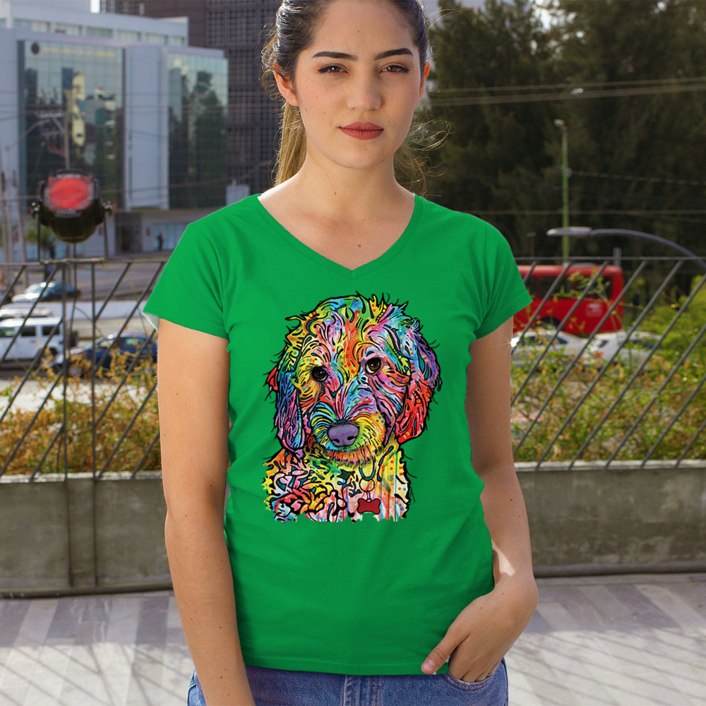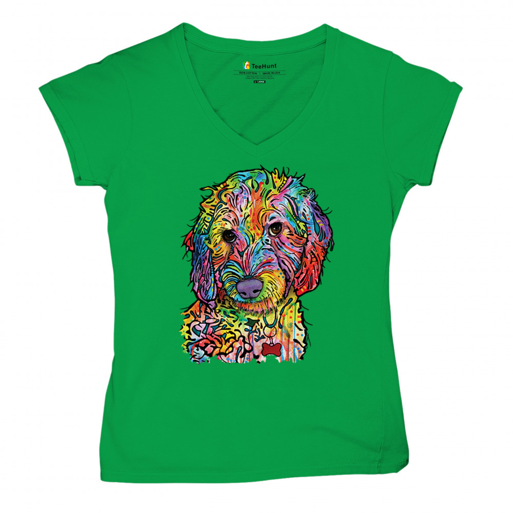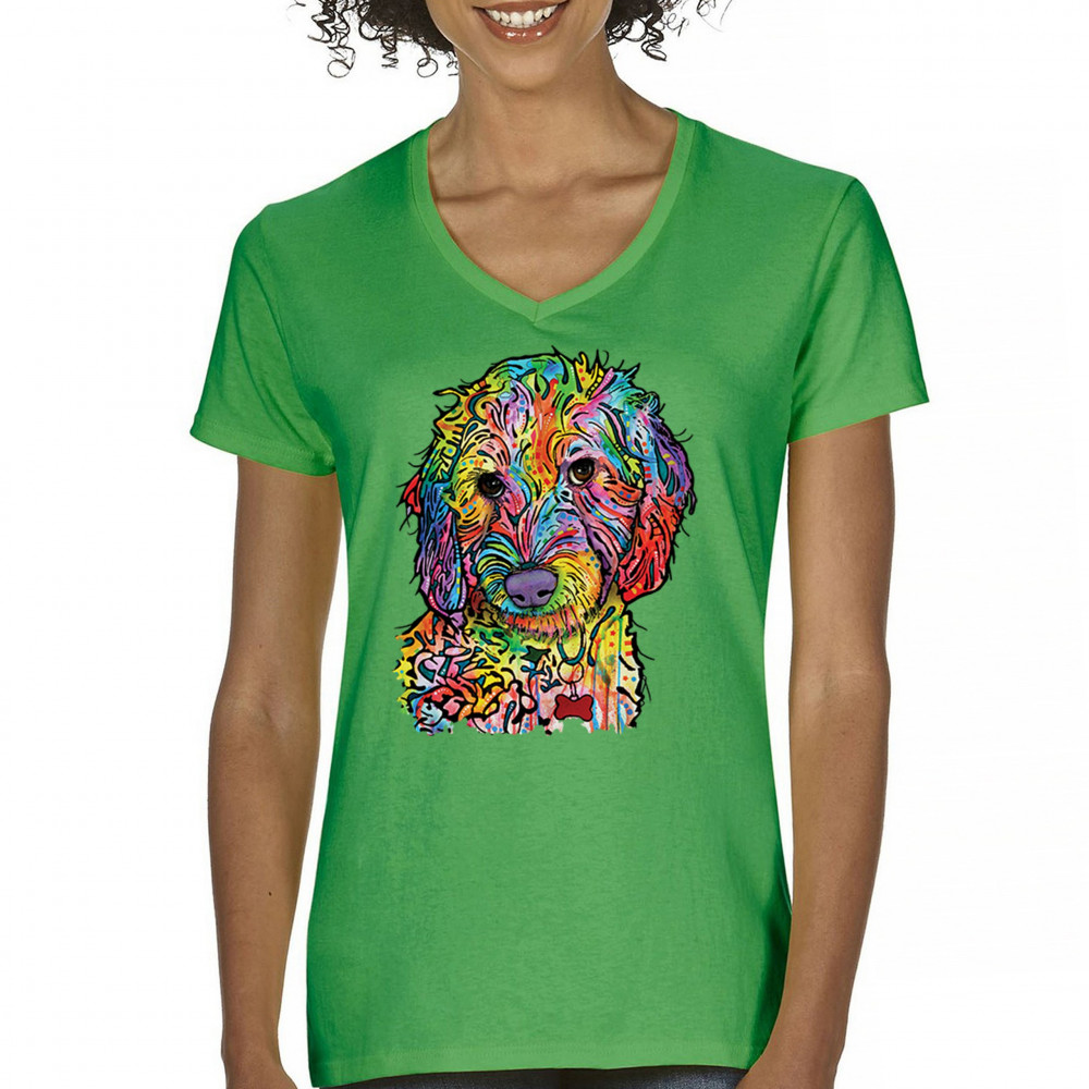 DEAN RUSSO SWEET POODLE women's v-neck t-shirt dog pattern puppy adopt pet tee green
