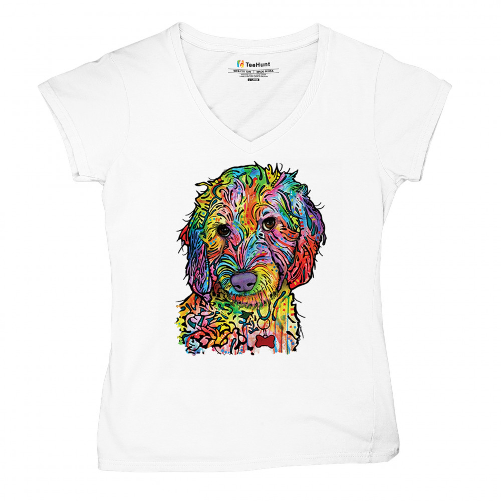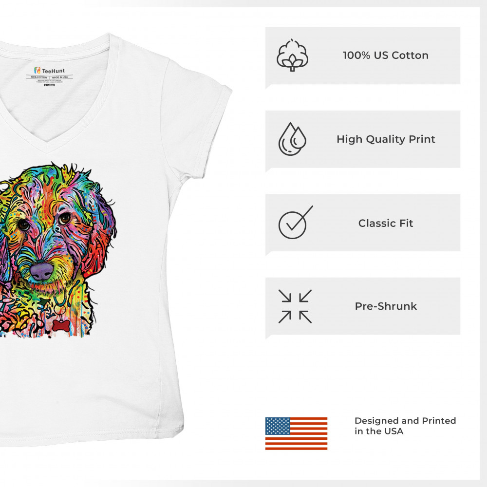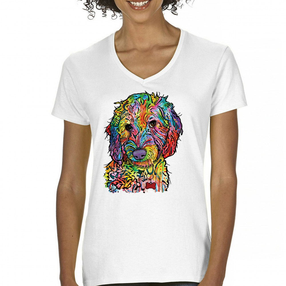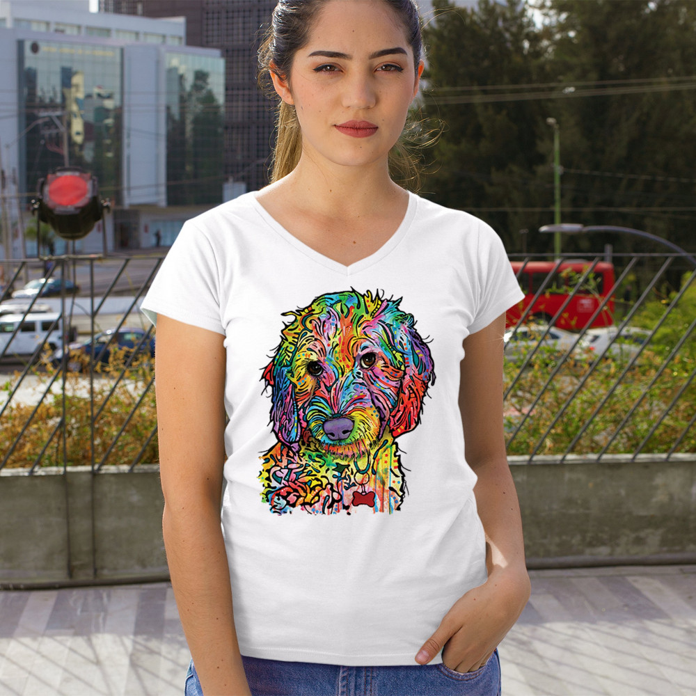 DEAN RUSSO SWEET POODLE women's v-neck t-shirt dog pattern puppy adopt pet tee white