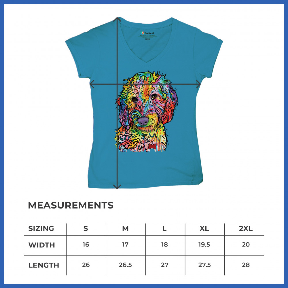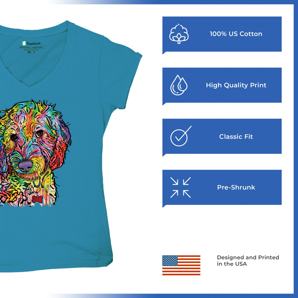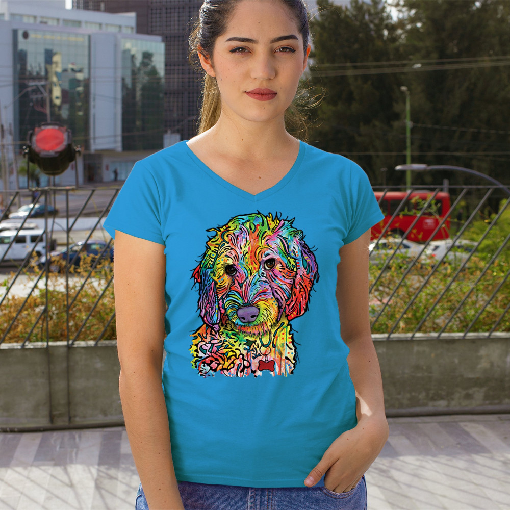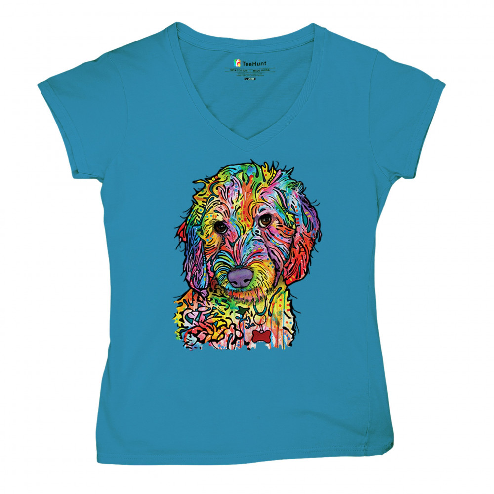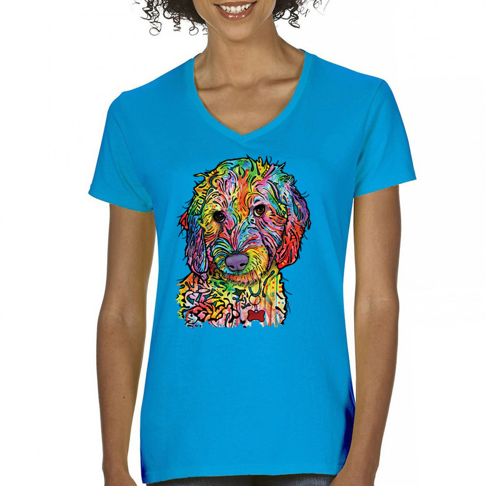 DEAN RUSSO SWEET POODLE women's v-neck t-shirt dog pattern puppy adopt pet tee turquoise