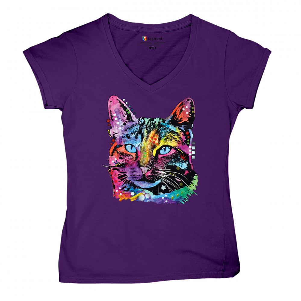 DEAN RUSSO THOUGHTFUL CAT women's v-neck t-shirt colorful pet kitten eyes tee purple