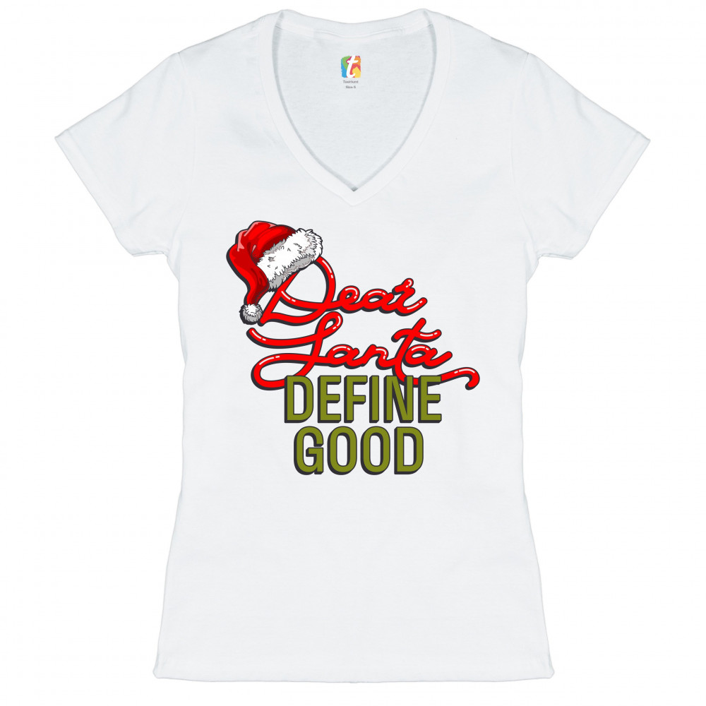 DEAR SANTA DEFINE GOOD women's v-neck t-shirt merry christmas naughty xmas tee white