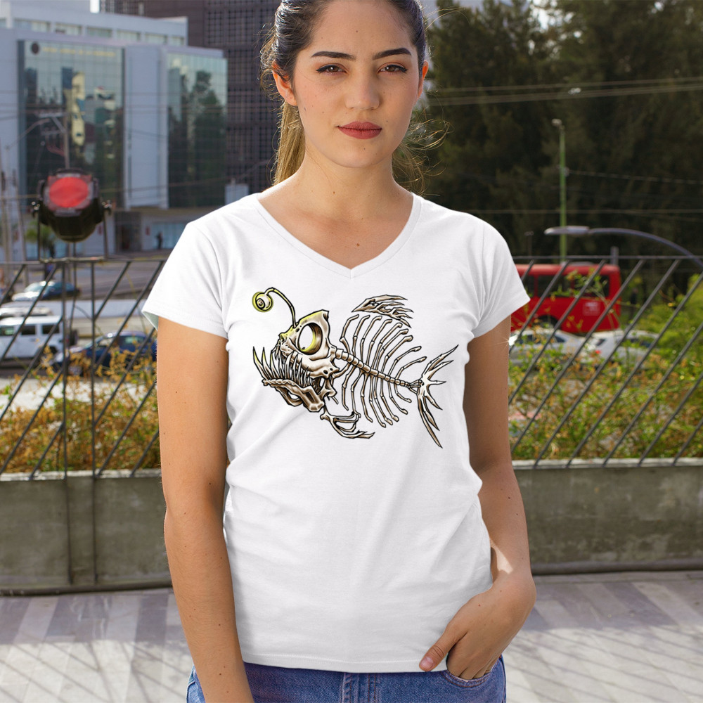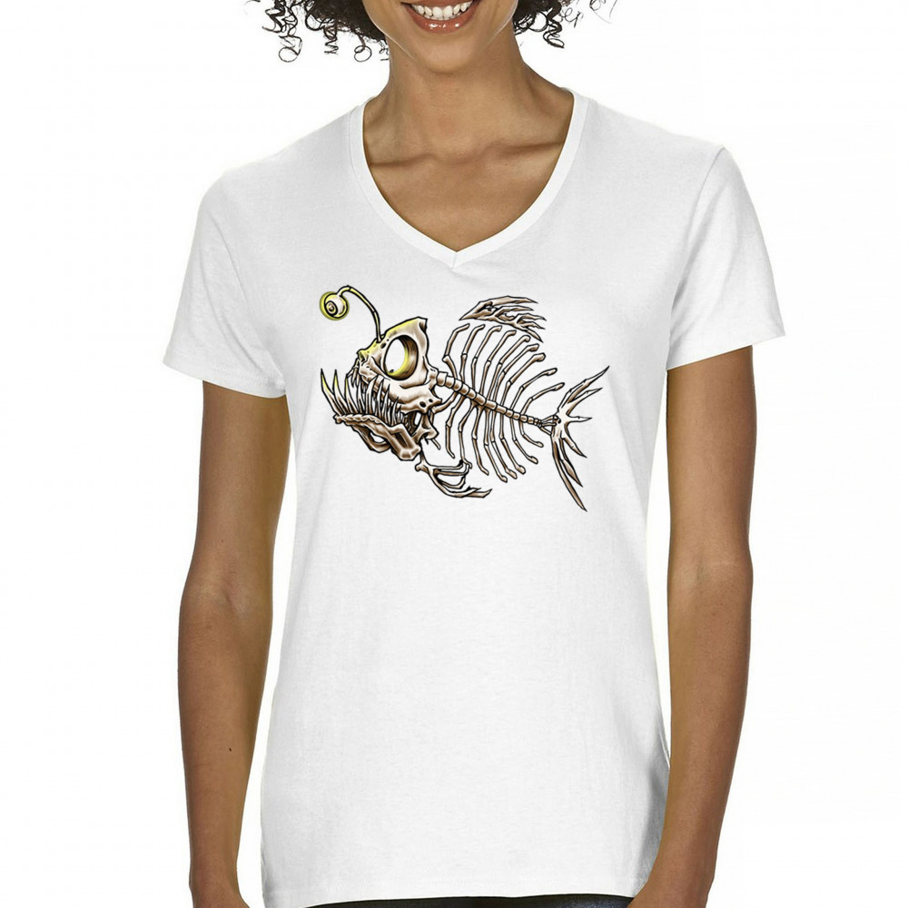 This highly detailed angler fish skeleton design features sharp bones, glowing lure eye, and deep sea terror aesthetic. Perfect for horror fans, marine biology lovers, and ocean adventurers, it combines underwater predator vibes with bone art flair. A great fit for Halloween, dive clubs, and dark sea aesthetics.