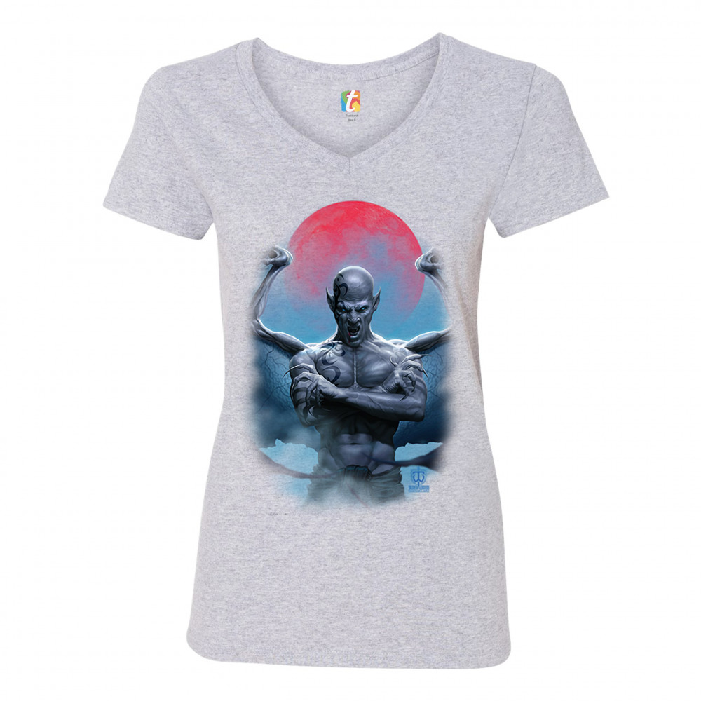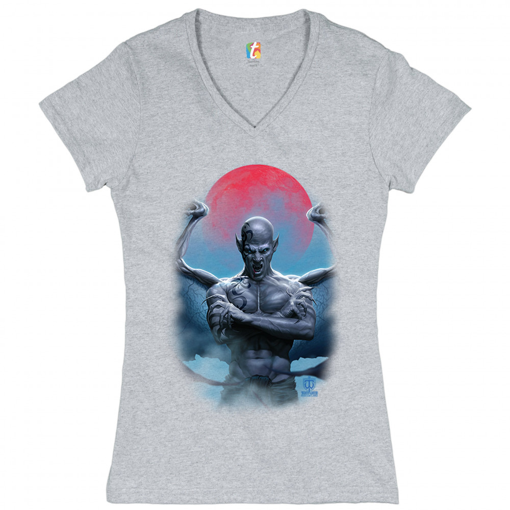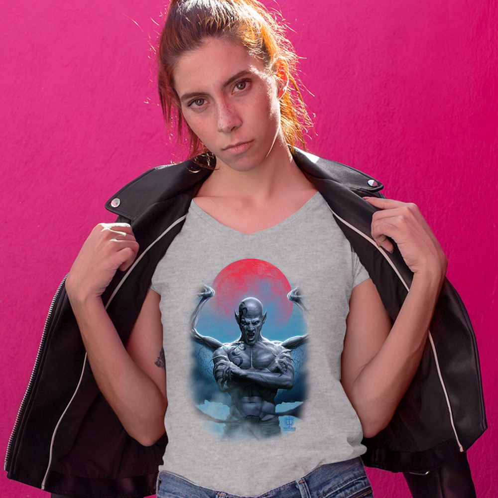 DEMON GARGOYLE women's v-neck t-shirt blood moon scary halloween monster tee gray