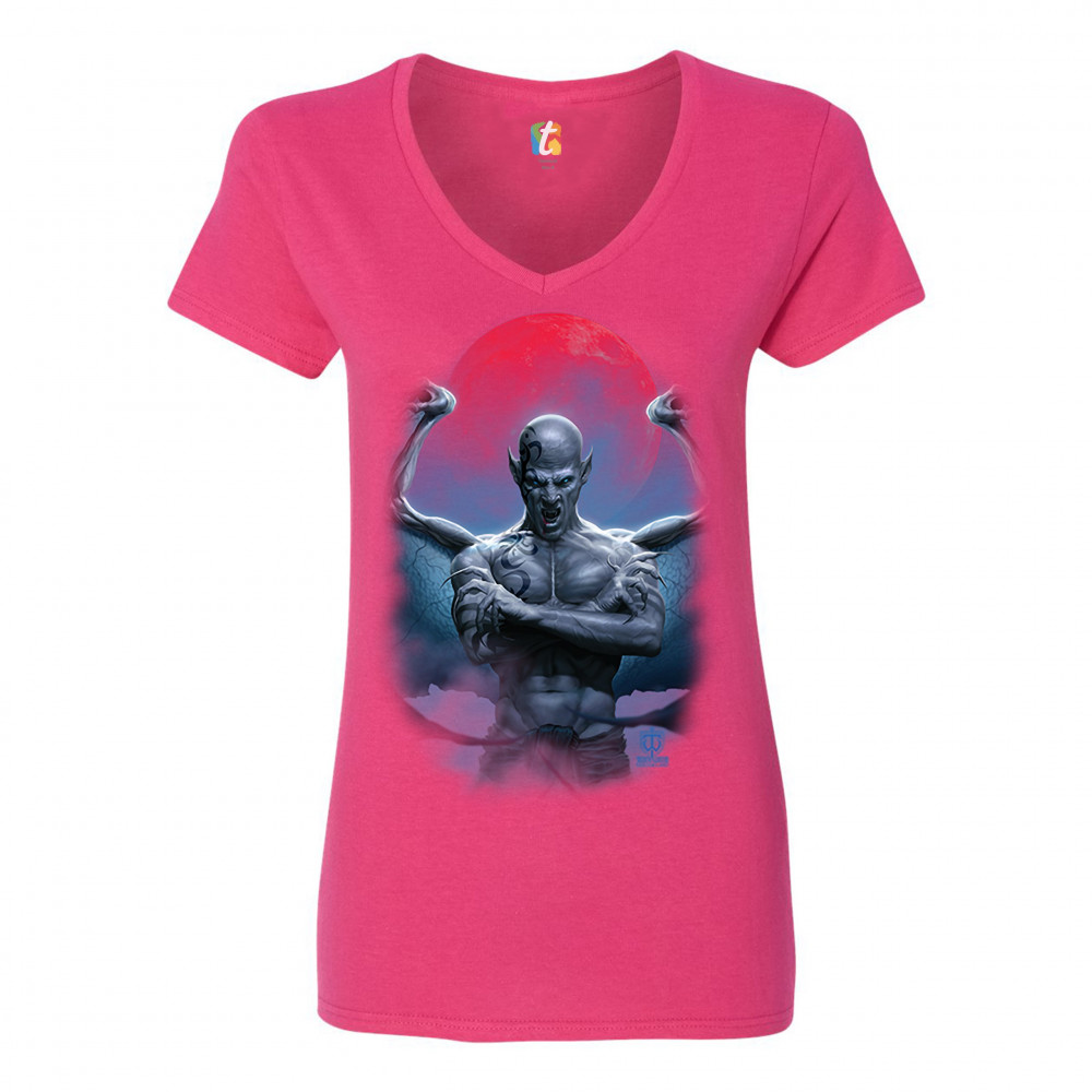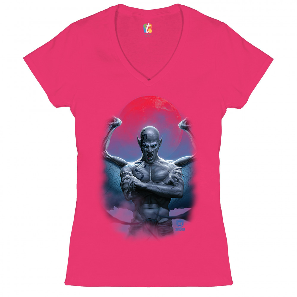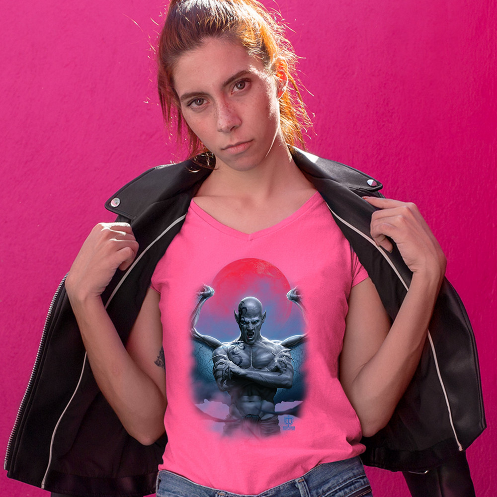 DEMON GARGOYLE women's v-neck t-shirt blood moon scary halloween monster tee pink