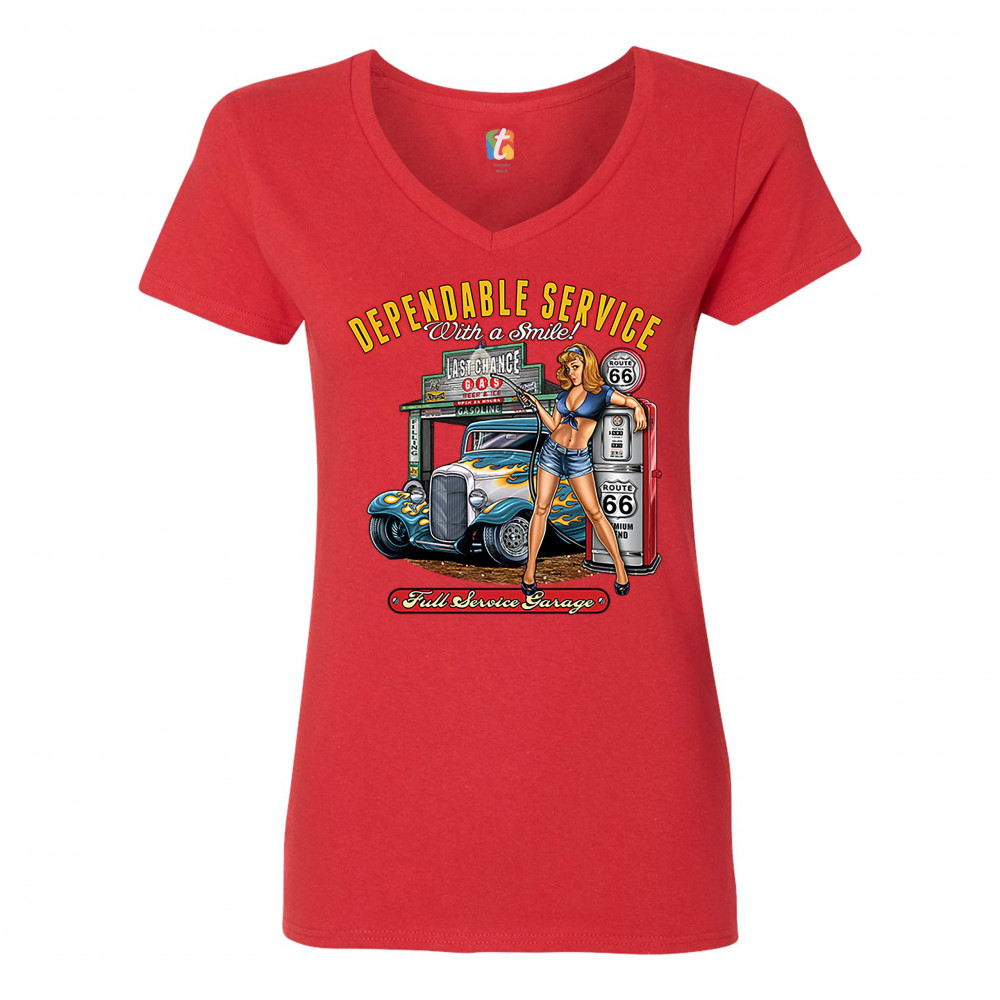 A print featuring a sexy pin-up girl standing by a gas pump with Route 66 signs on it. Behind her there is a garage with a hot rod parked at it. The print says: "Dependable Service With a Smile!" at the top and "Full Service Garage" at the bottom. A great