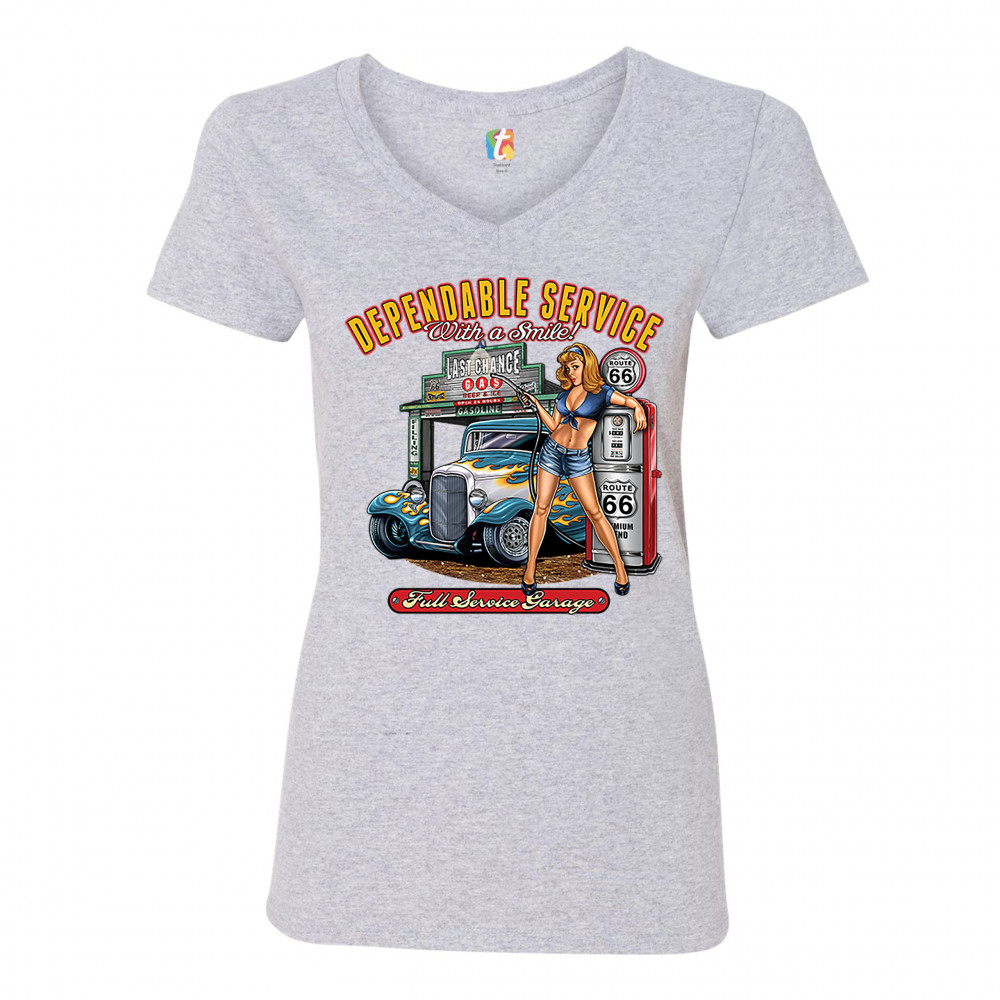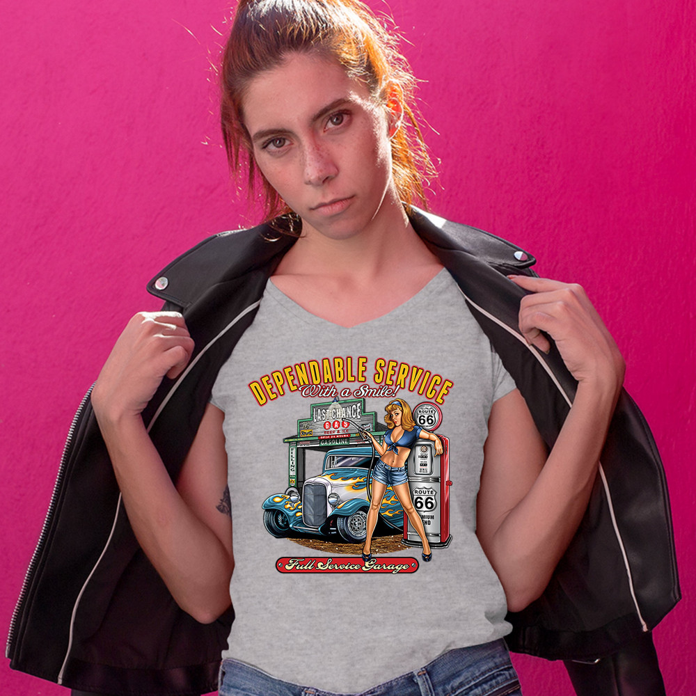 A print featuring a sexy pin-up girl standing by a gas pump with Route 66 signs on it. Behind her there is a garage with a hot rod parked at it. The print says: "Dependable Service With a Smile!" at the top and "Full Service Garage" at the bottom. A great