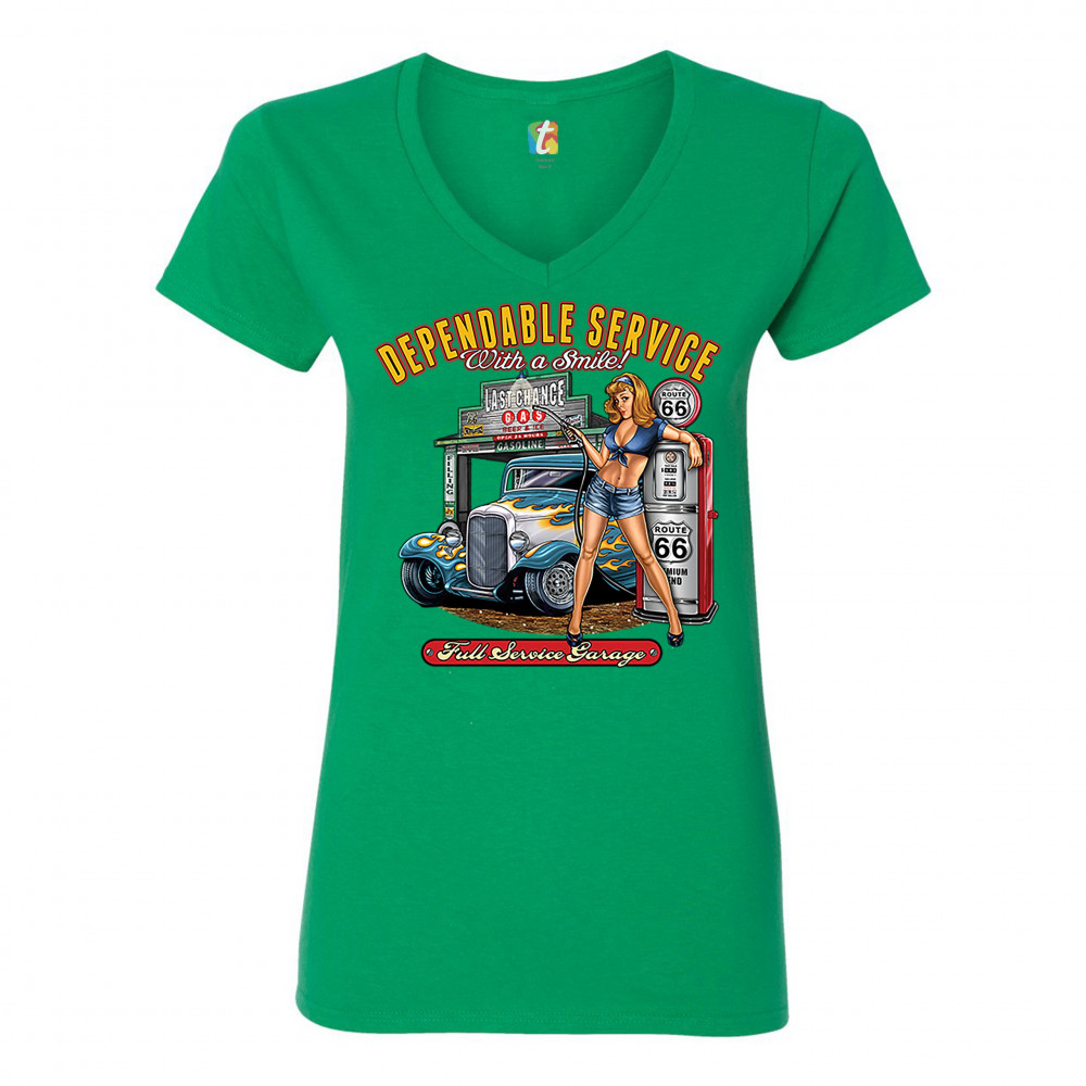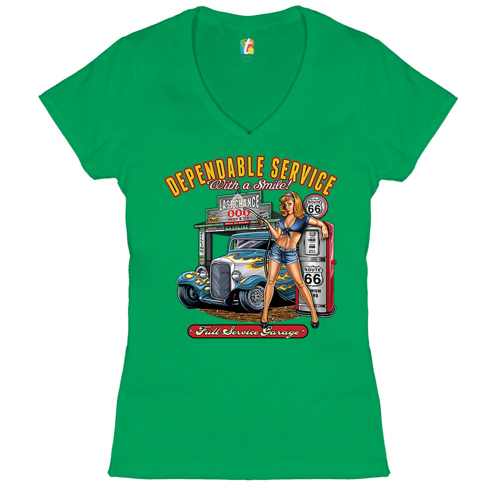 A print featuring a sexy pin-up girl standing by a gas pump with Route 66 signs on it. Behind her there is a garage with a hot rod parked at it. The print says: "Dependable Service With a Smile!" at the top and "Full Service Garage" at the bottom. A great