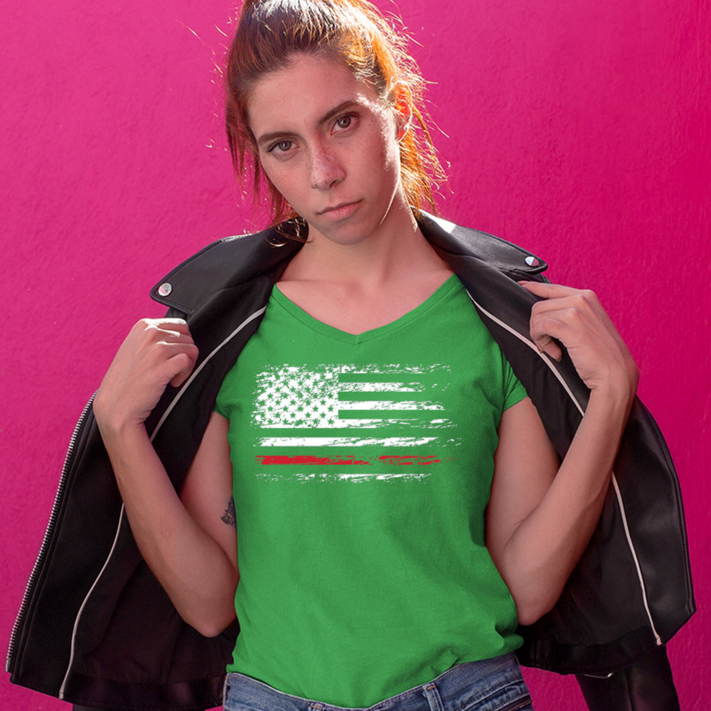 DISTRESSED AMERICAN FLAG women's v-neck t-shirt thind red line firefighter tee green